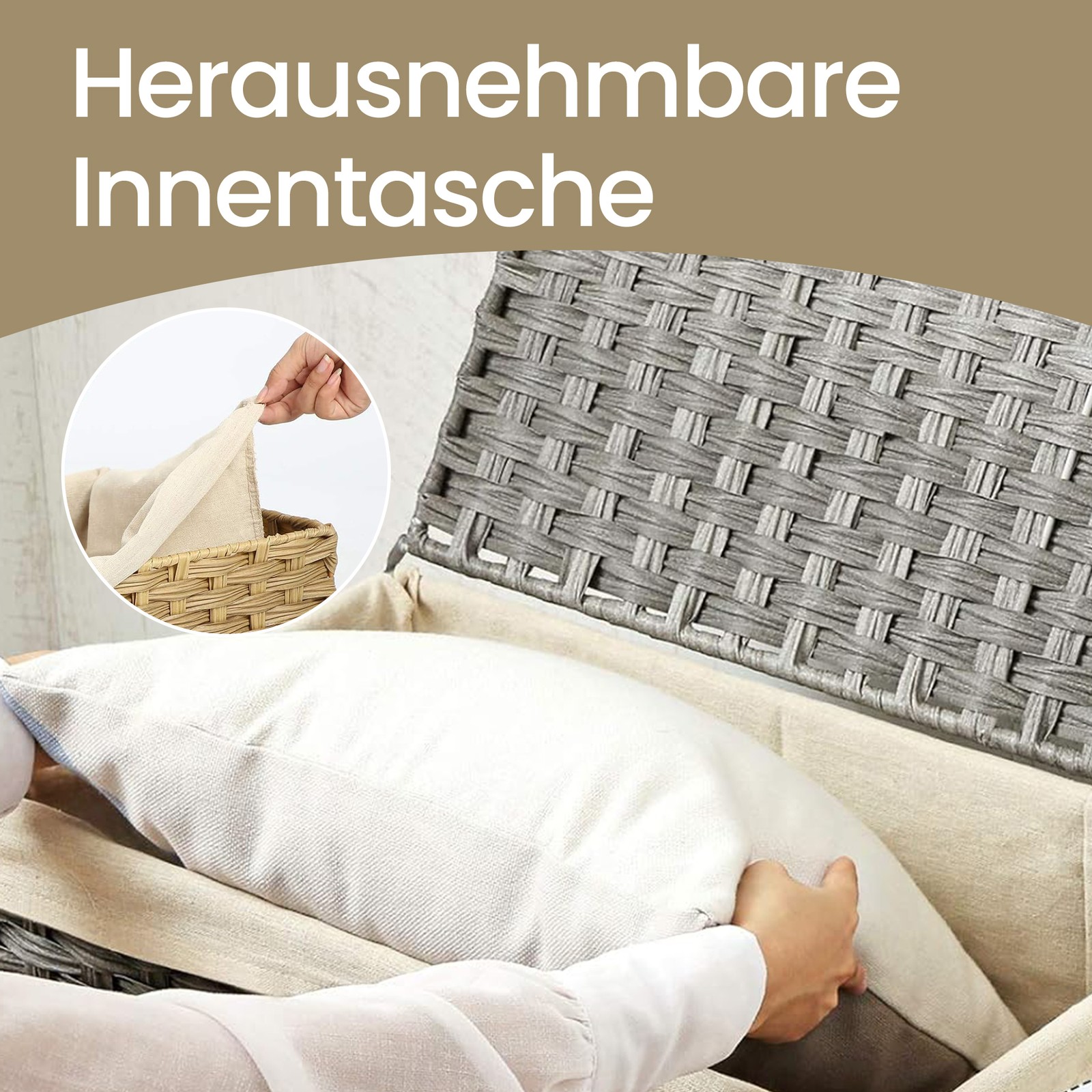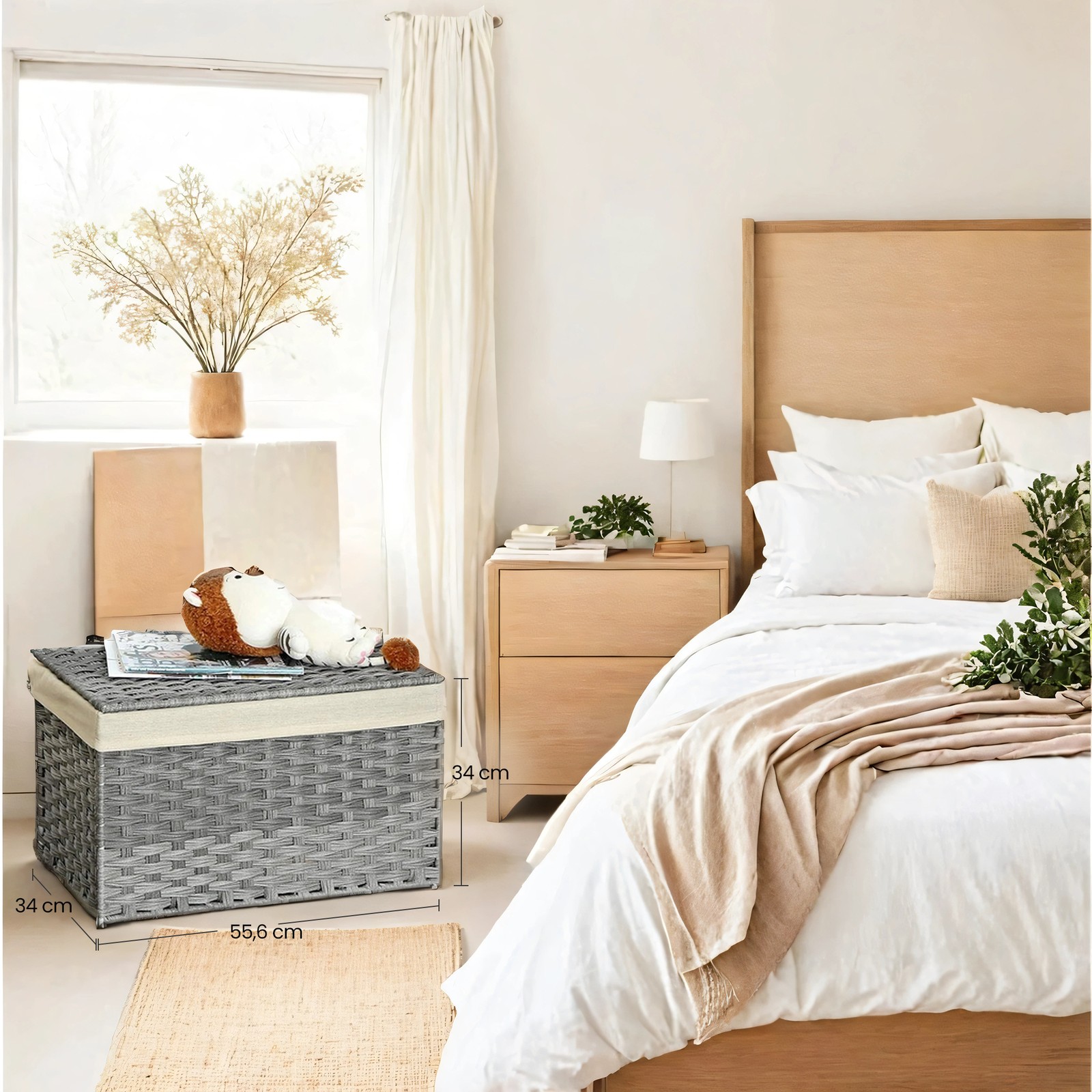 This decorative storage chest from SONGMICS keeps all those messy items and odds and ends on the table under control. Your savior when visitors come and you need to tidy up quickly.A feast for the eyes: this pretty, hand-woven basket made of rustic poly rattan is a highlight in any walk-in closet, children’s room, bedroom, living room, or laundry room.A faithful servant: The durable poly rattan strands made of PP plastic have been meticulously woven by hand around a strong iron wire frame to create a stable, rectangular structure. The lid is also supported by iron wire, making this laundry basket a completely stable product. Product details:Color: Gray Material: PP plastic (polypropylene), cotton, iron Size: 55.5 x 34 x 34 cm (L x W x H) Weight: 2.4 kg Max. static load capacity of the box: 20 kg Max. static load capacity of the lid: 10 kg EAN: 6955880390519