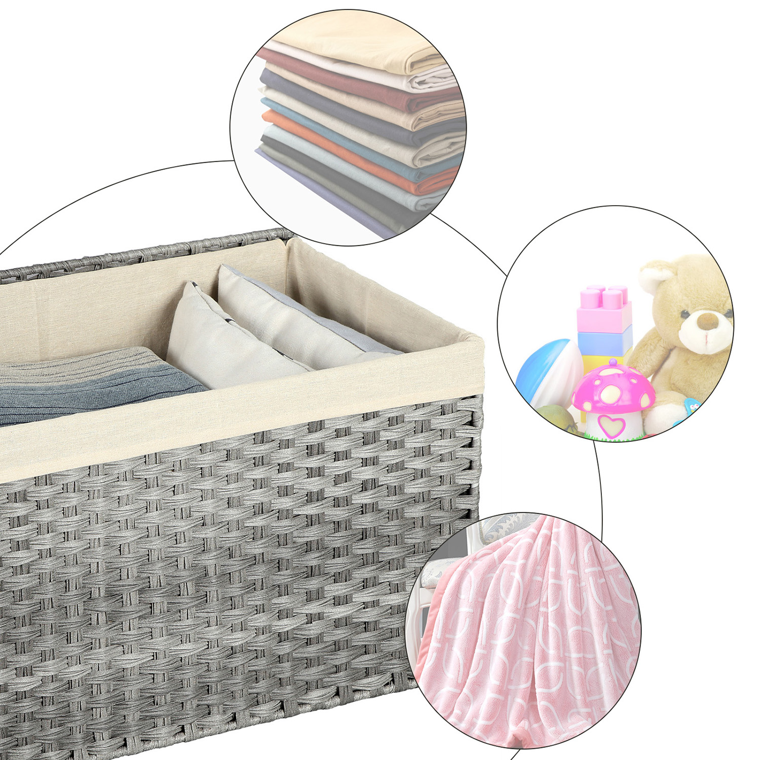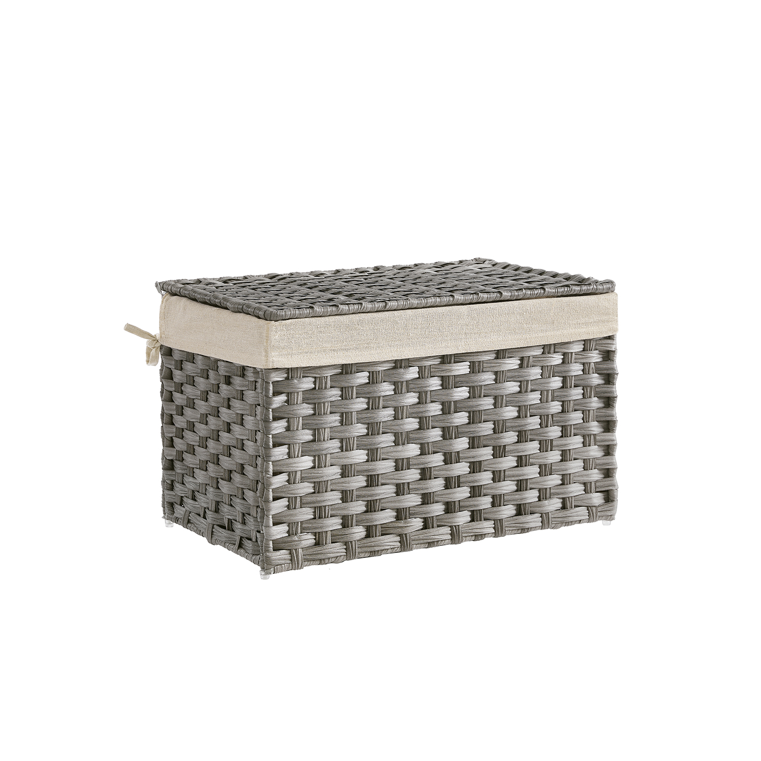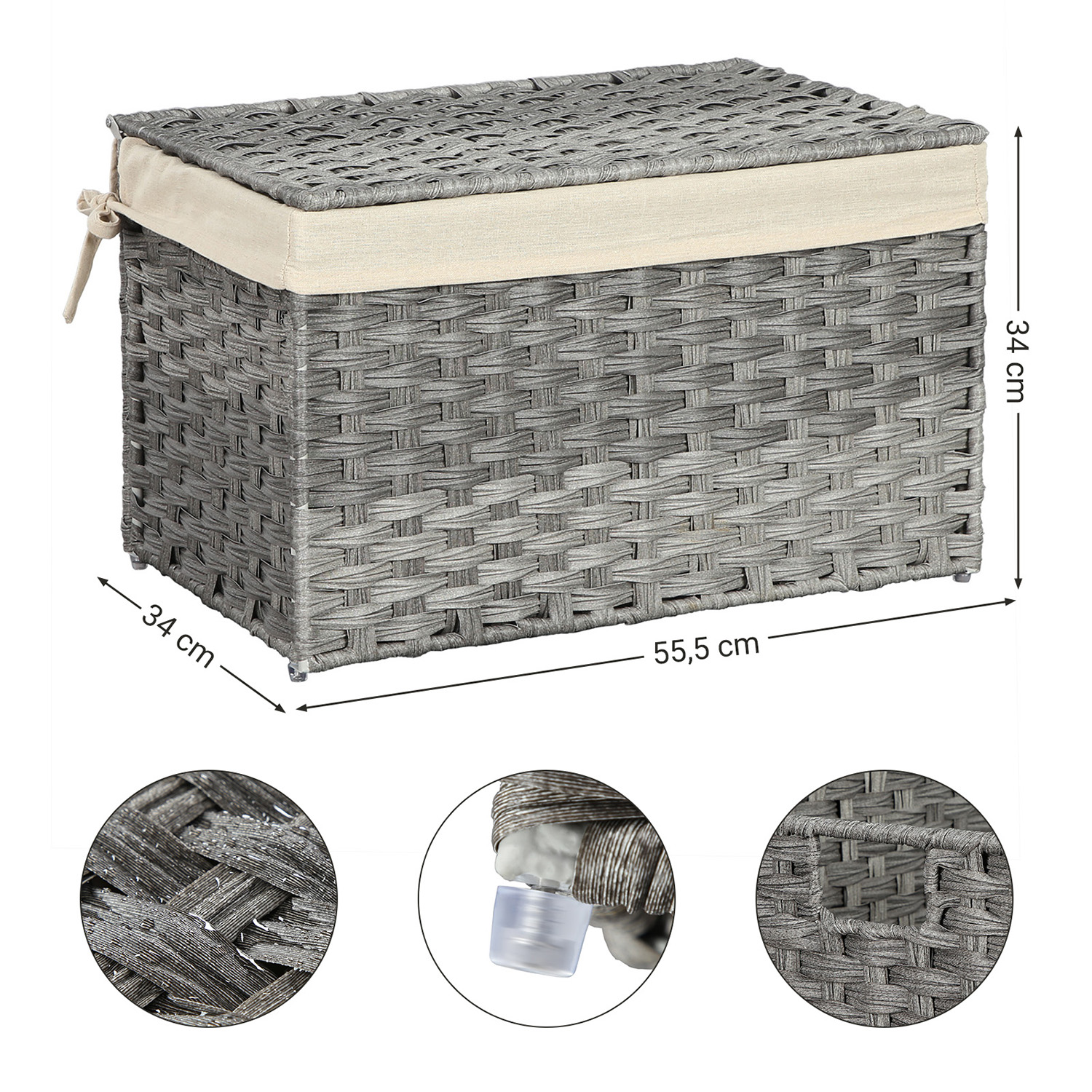This decorative storage chest from SONGMICS keeps all those messy items and odds and ends on the table under control. Your savior when visitors come and you need to tidy up quickly.A feast for the eyes: this pretty, hand-woven basket made of rustic poly rattan is a highlight in any walk-in closet, children’s room, bedroom, living room, or laundry room.A faithful servant: The durable poly rattan strands made of PP plastic have been meticulously woven by hand around a strong iron wire frame to create a stable, rectangular structure. The lid is also supported by iron wire, making this laundry basket a completely stable product. Product details:Color: Gray Material: PP plastic (polypropylene), cotton, iron Size: 55.5 x 34 x 34 cm (L x W x H) Weight: 2.4 kg Max. static load capacity of the box: 20 kg Max. static load capacity of the lid: 10 kg EAN: 6955880390519