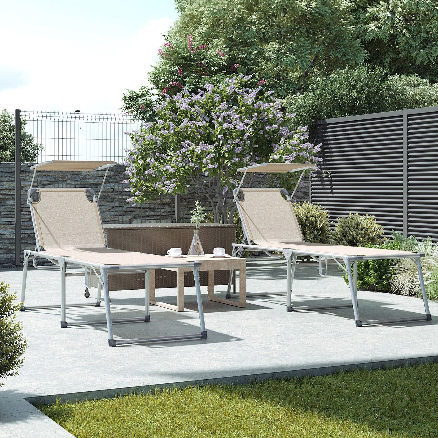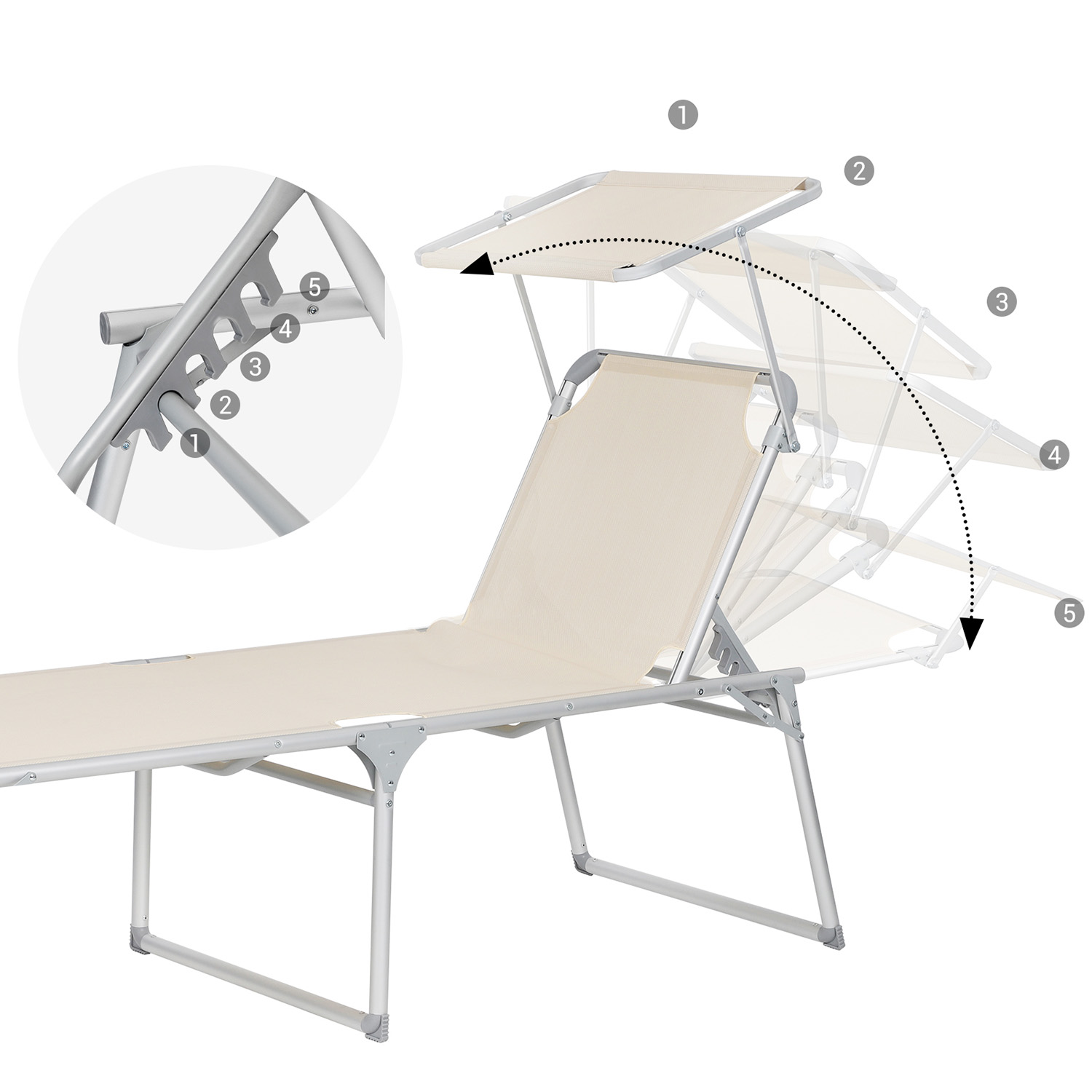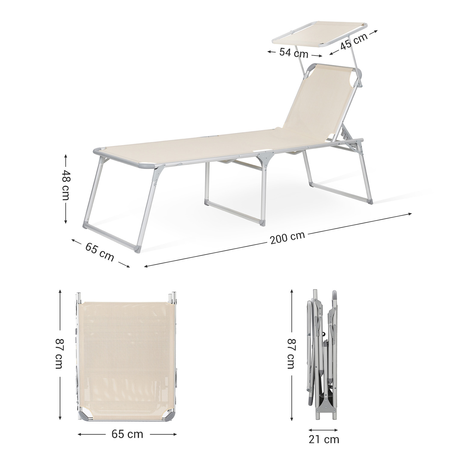 Product details: Color: Beige Material: Aluminum, iron, synthetic fiber fabric Size: 65 x 200 x 48 cm (L x W x H) Weight: 9.4 kg Max. static load capacity: 150 kg Scope of delivery: 1 x sun lounger with canopy SONGMICS notes: The maximum load capacity of the sun lounger is 150 kg. Please do not exceed this maximum weight. Please unfold the sun lounger completely before use. Please do not leave the product outdoors for long periods of time; do not expose the sun lounger to rain or strong sunlight.
