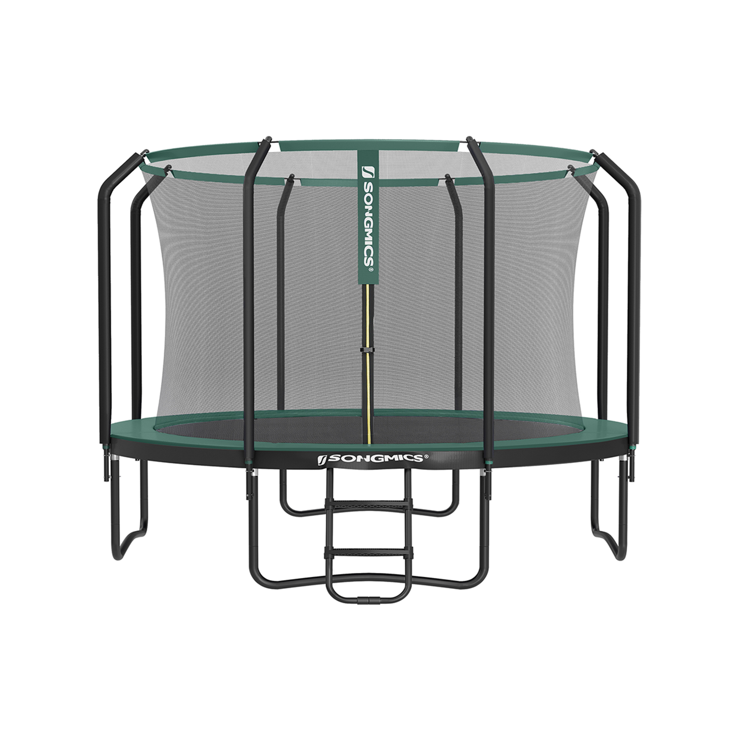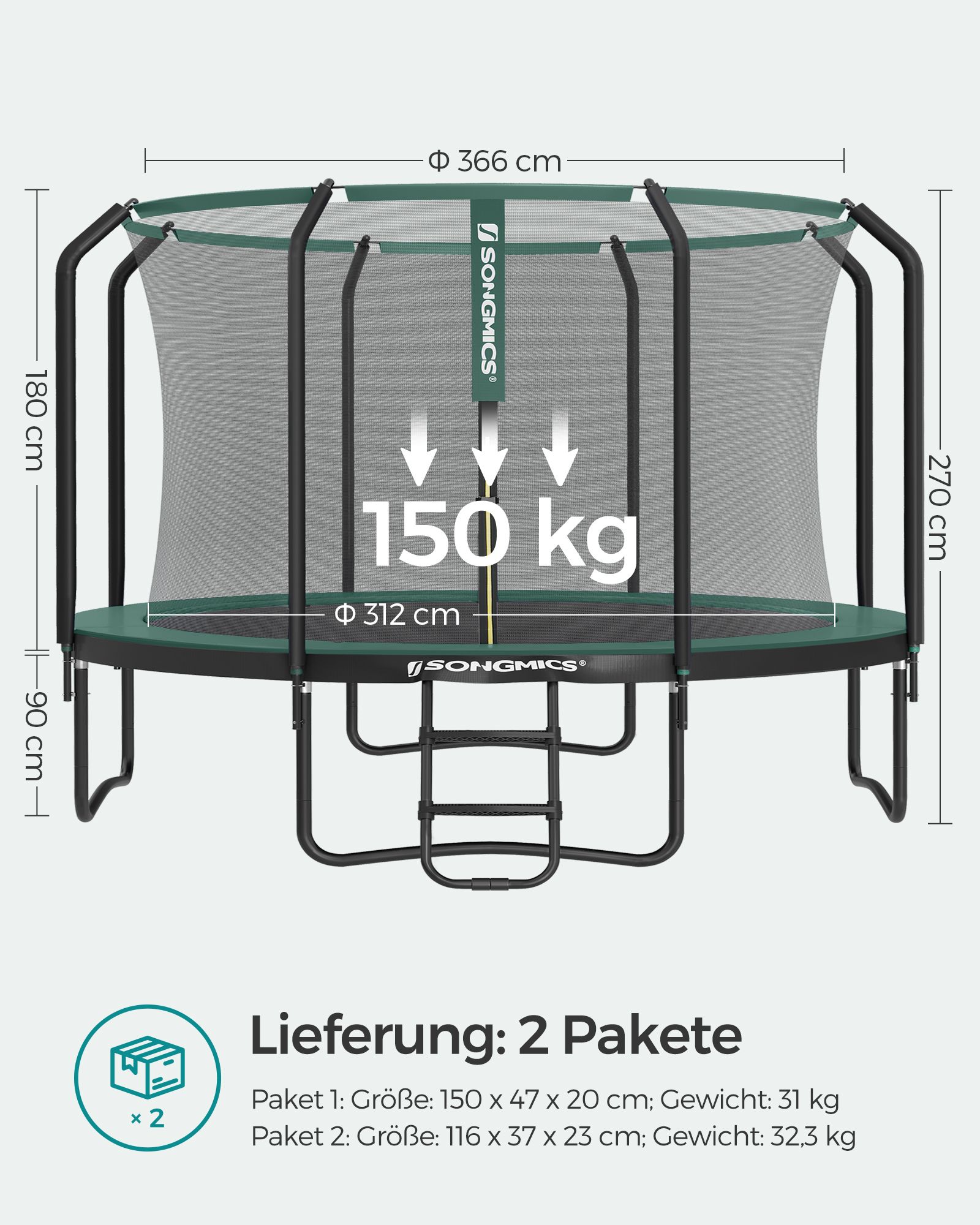 Fun in the gardenThis model has been available in a size of Ø 366 cm since 2021! Trampolines from SONGMICS – a first-class bouncing experience for the whole family. As safety is our priority, the galvanized and powder-coated base frame is stable and rust-resistant. The 4 W-shaped legs keep the jumping mat in balance. This jumping device is of course ideal as a gift for your children. But you can also have a go, because the trampoline can hold up to 150 kg. The delivery includes a jumping mat, an edge cover, a safety net, support bars, and a ladder—everything you need to have fun outdoors! Product details: – Color: Black-dark green – Material: – Legs, edge of safety net: Galvanized, powder-coated steel – Outer ring of frame, T-shaped connectors: Galvanized steel – Springs: Zinc – Ladder: PP plastic (0.9 g/cm³), steel tube – Jumping mat: PP plastic (265 g/m²) – Edge cover: PVC (310 g/m²), EPE foam – Safety net: PE plastic (95 g/m²)- Dimensions:- Frame with jumping surface: 366 x 90 cm (Ø x H)- Safety net: 180 cm (H)- Ladder: 41 x 119 cm (W x H)- Distance between floor and trampoline surface: 90 cm- Weight: 57 kg (28.4 + 28.6 kg) – Max. static load capacity: 150 kg Scope of delivery: 2 packages – 1 x trampoline – 1 x ladder – 1 x accessory package – 1 x instructions (DE, EN, IT, FR, ES)