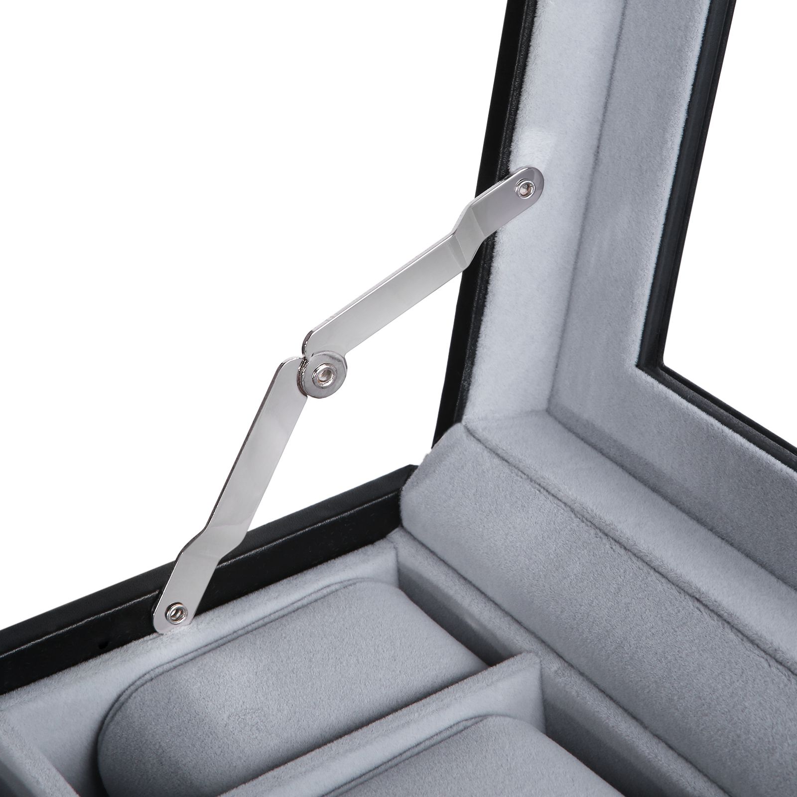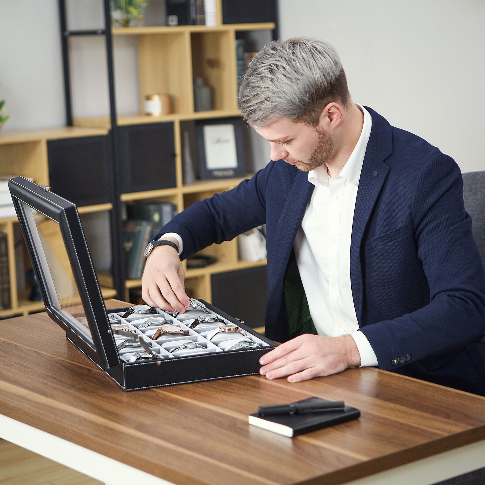 The main feature of the product – Glass window: easy to clean and scratch-resistant. – The frame: it has a black faux leather cover with contrasting white stitching. – Optimal protection thanks to a lockable snap lock including 2 keys – Frame thickness: 0.70 cm – Interior: long velvet, better protects your watches Description:- This practical watch box in a stylish design protects your watch collection from dust and scratches. – Space for 24 wristwatches – Glass lid for display – Equipped with a snap lock – 24 removable velour cushions Scope of delivery: – 1 x watch box – Without watches and jewelry
