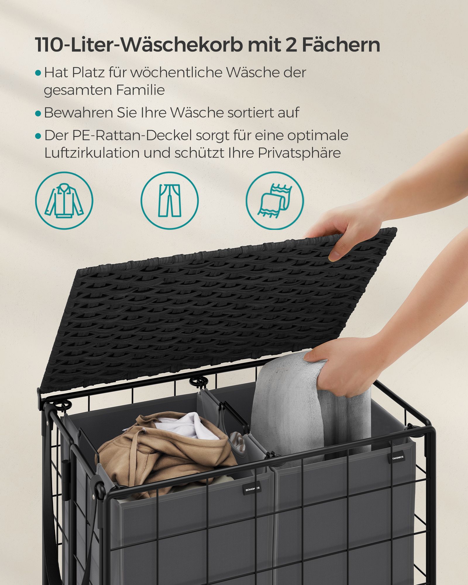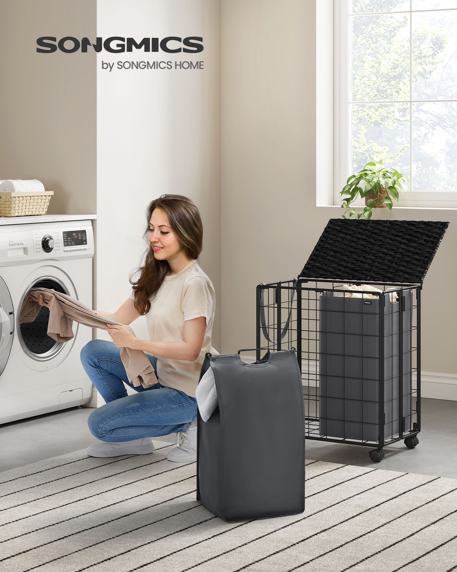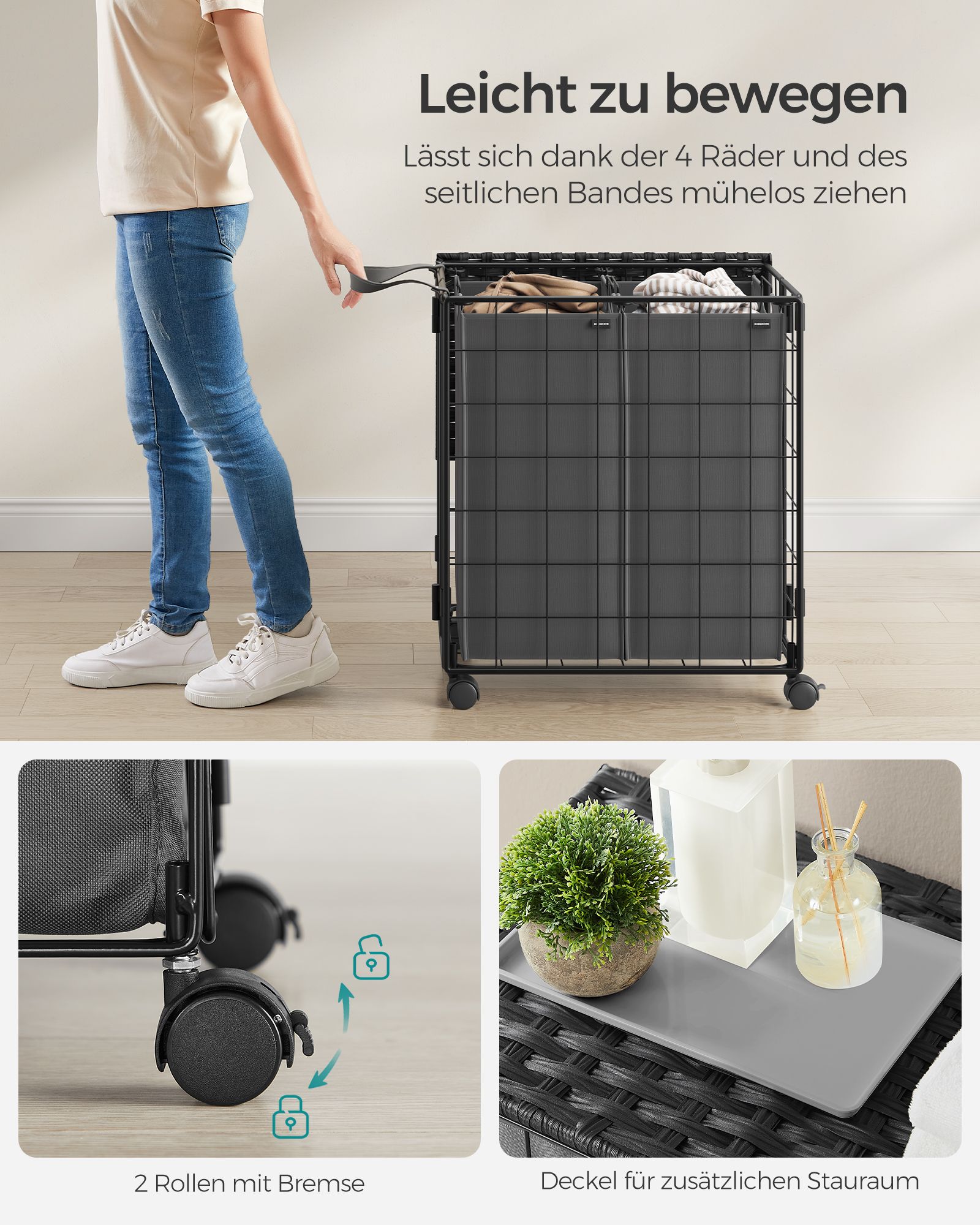SONGMICS laundry basket 110 L, laundry collector with casters, removable laundry bag, 2 inner bags, laundry trolley with lid, 57 x 33 x 65 cm, for laundry room
