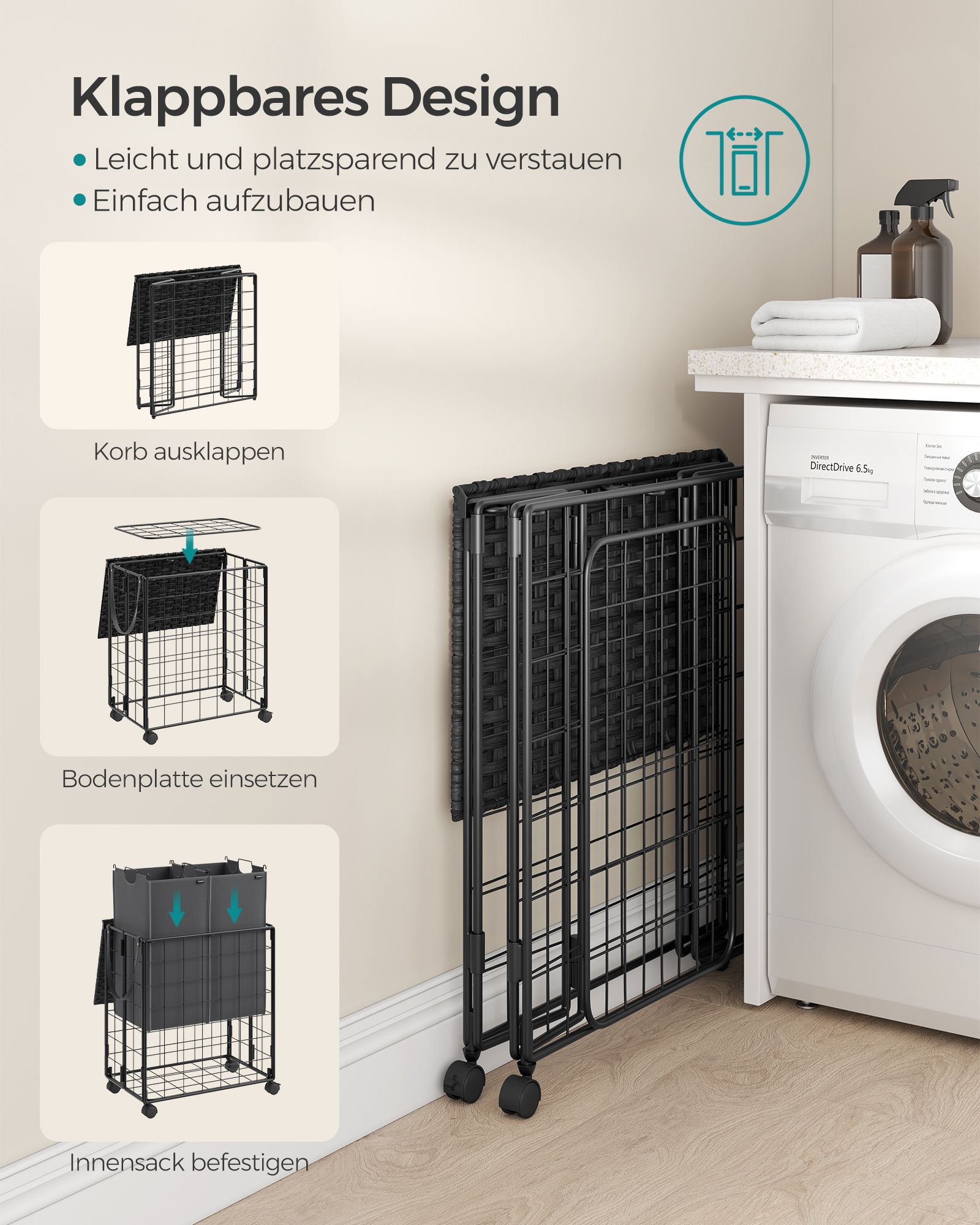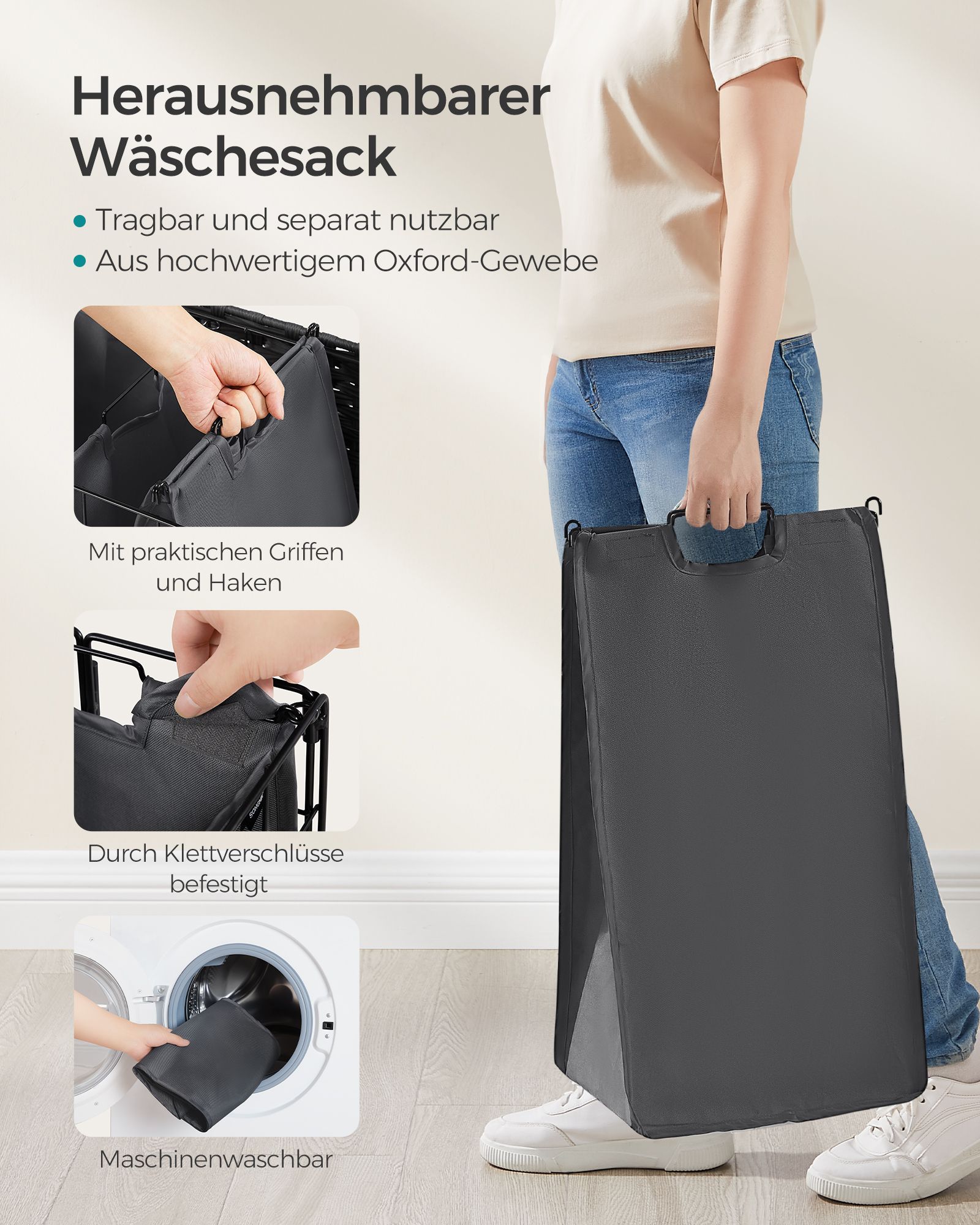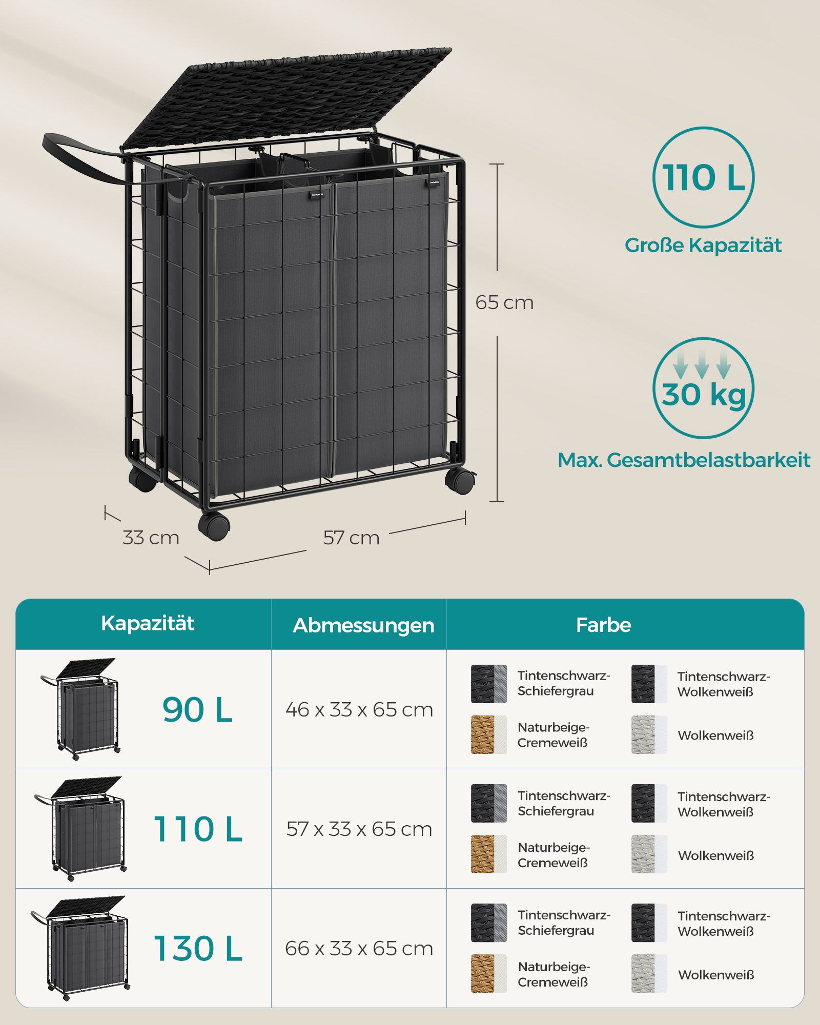 SONGMICS laundry basket 110 L, laundry collector with casters, removable laundry bag, 2 inner bags, laundry trolley with lid, 57 x 33 x 65 cm, for laundry room