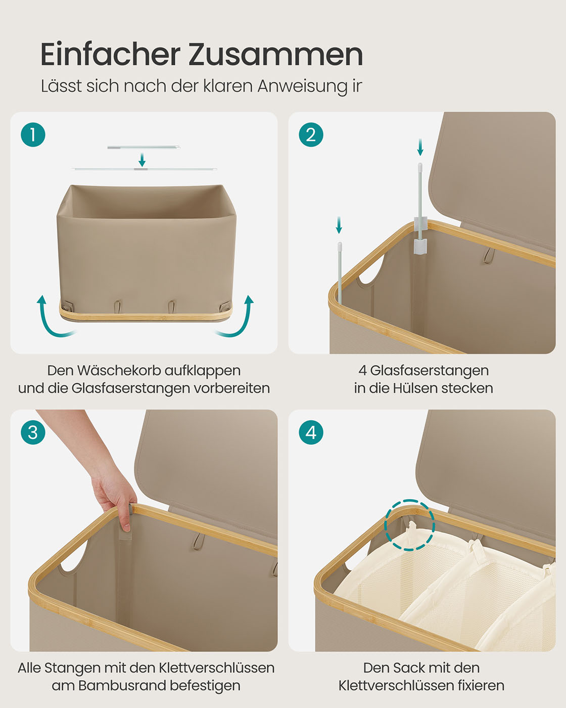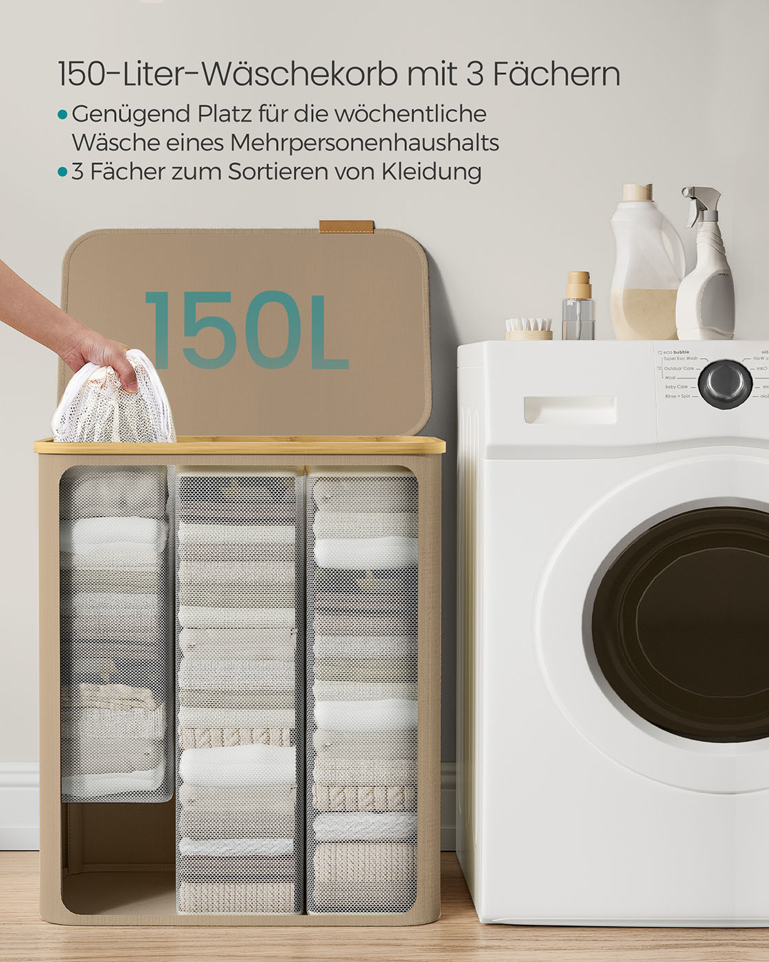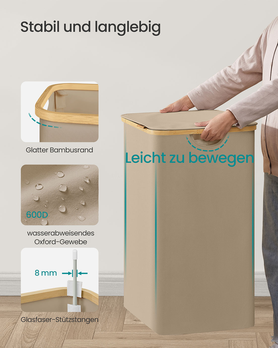 SONGMICS laundry basket, laundry collector with lid, foldable, removable laundry bag, Oxford fabric, bamboo handles, collapsible