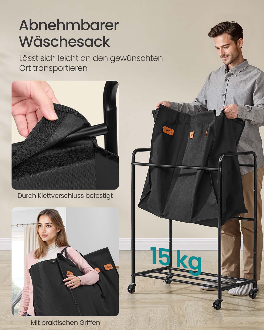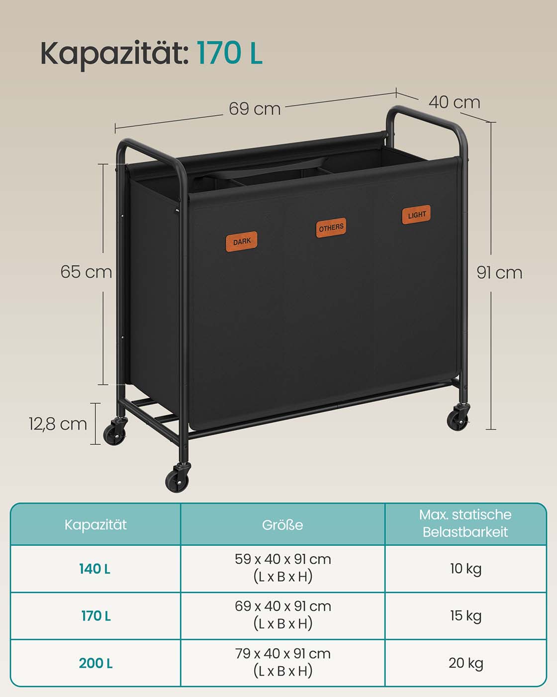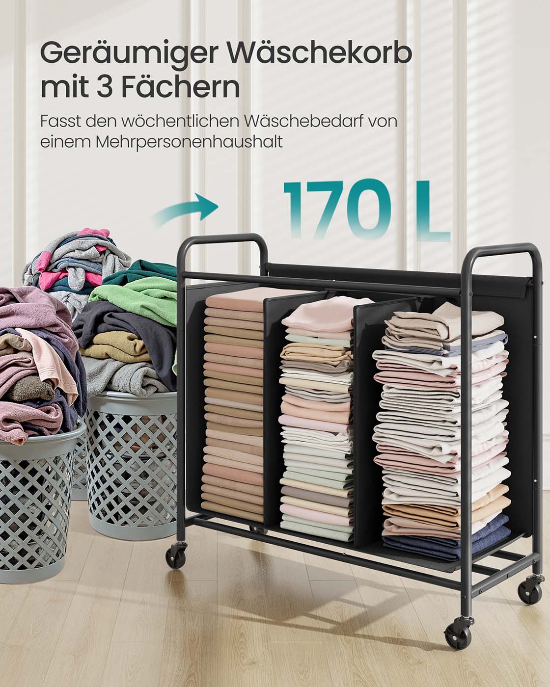SONGMICS laundry basket with casters, laundry collector, 2 compartments, 140 L laundry sorter, mobile laundry cart, 5 labels, for laundry room, bedroom, bathroom, ink black RLS210B01