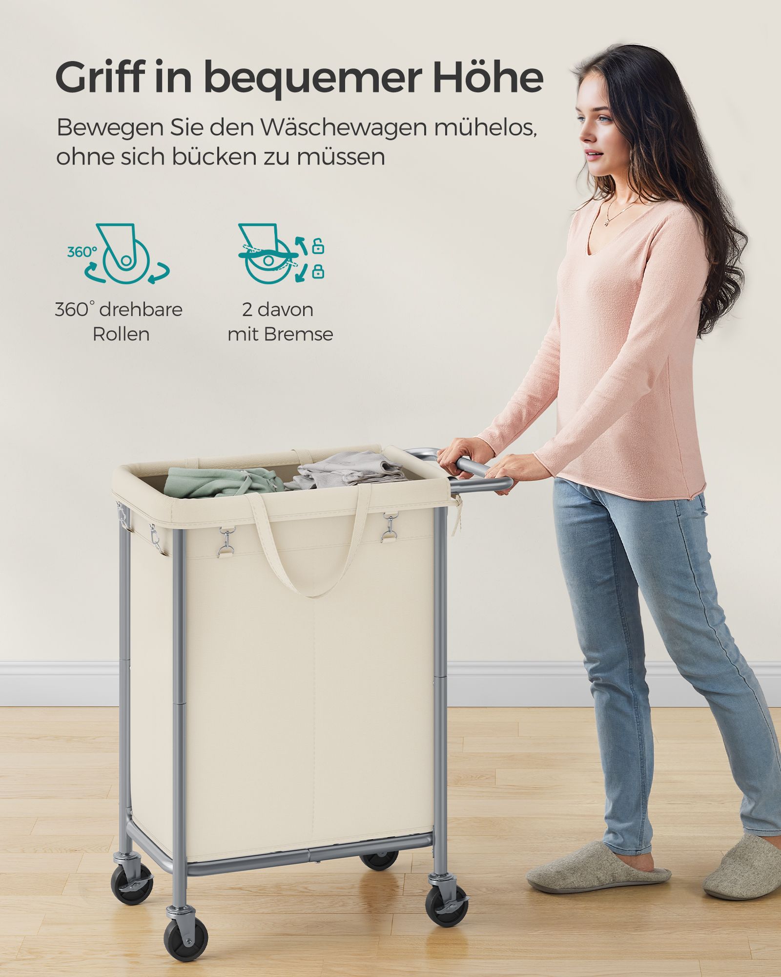 SONGMICS laundry basket, 90 liters, laundry collector with casters, laundry cart, removable laundry bag, steel frame, with handle, spacious