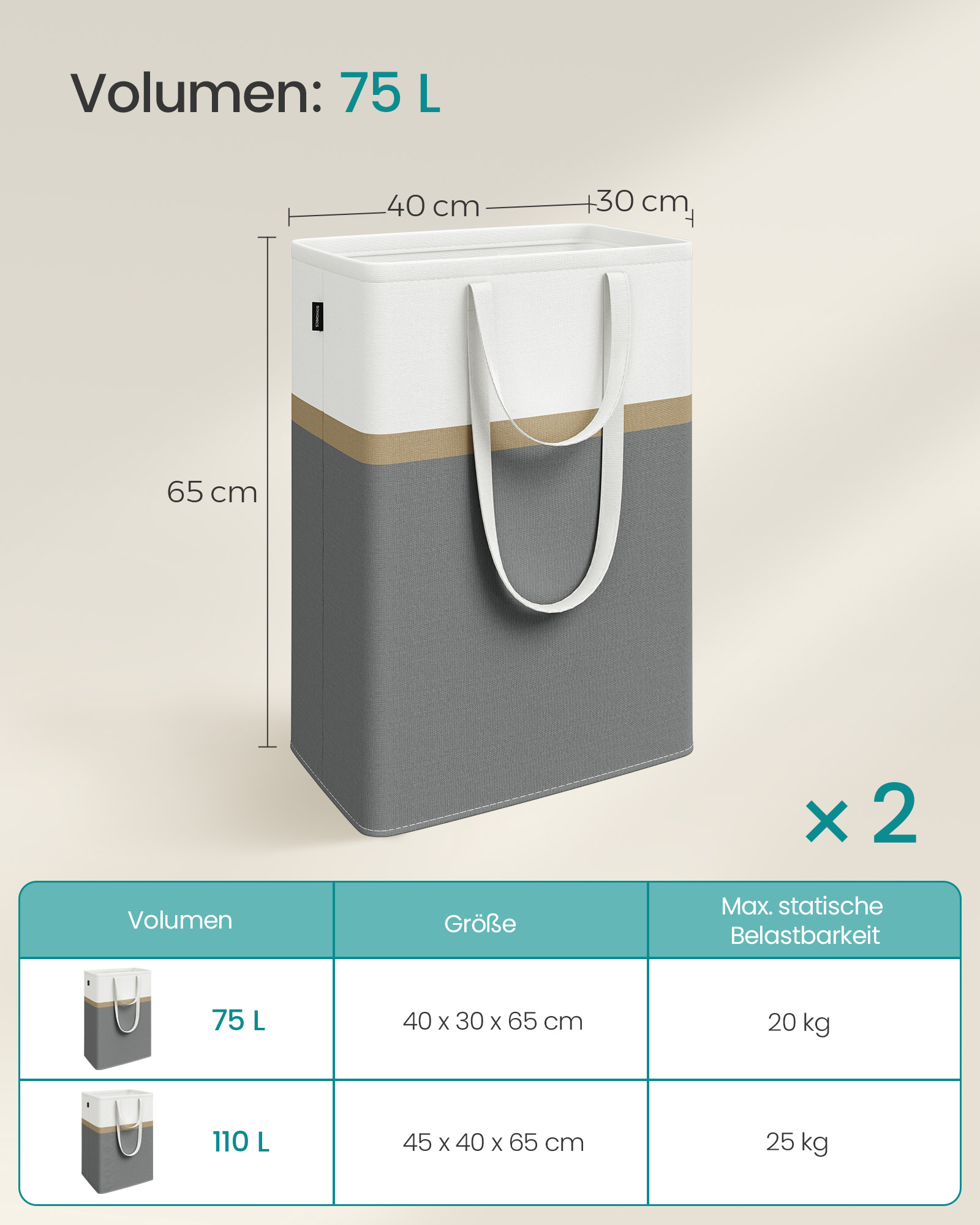 Size per laundry bag: 40 x 30 x 65 cm (L x W x H)
