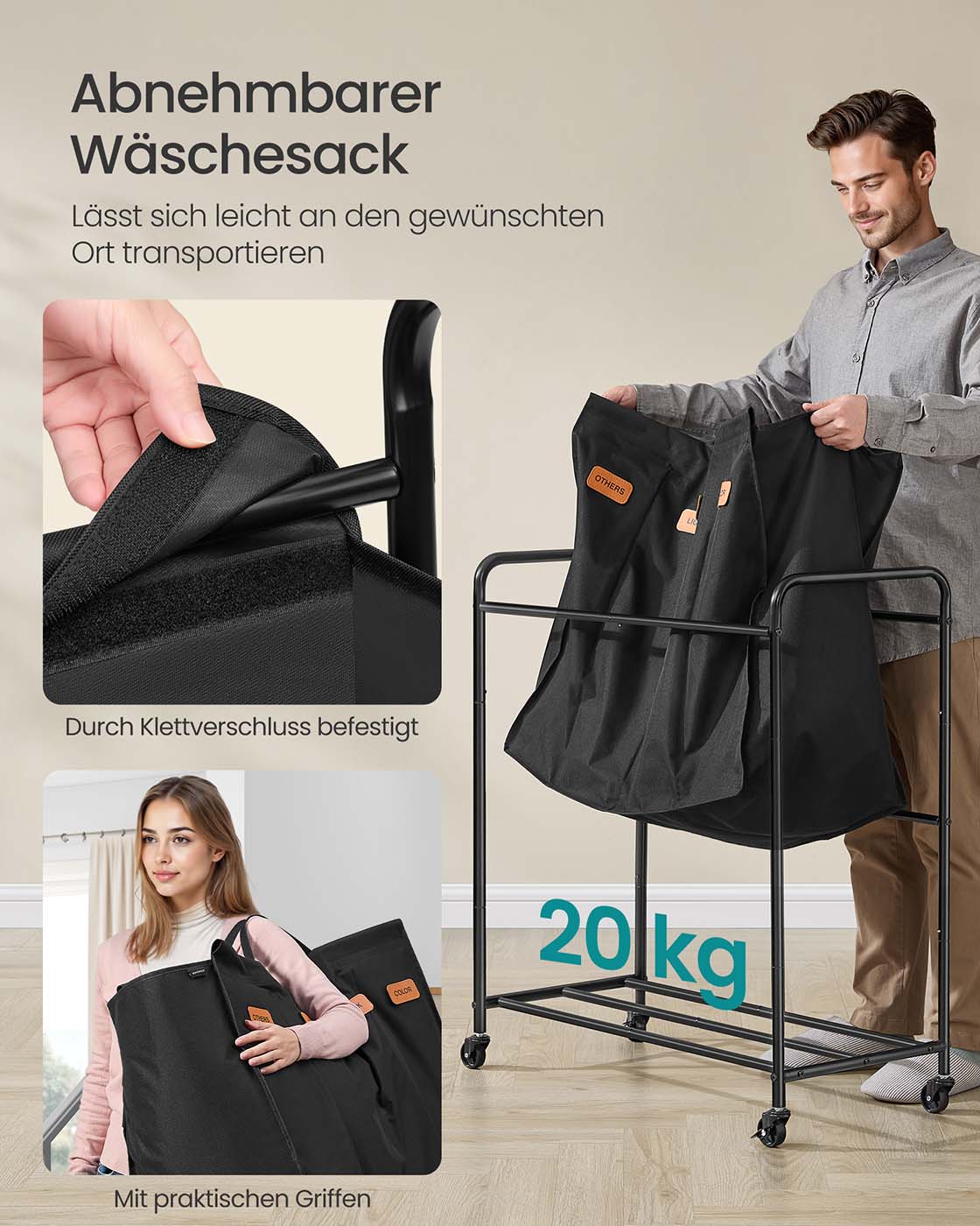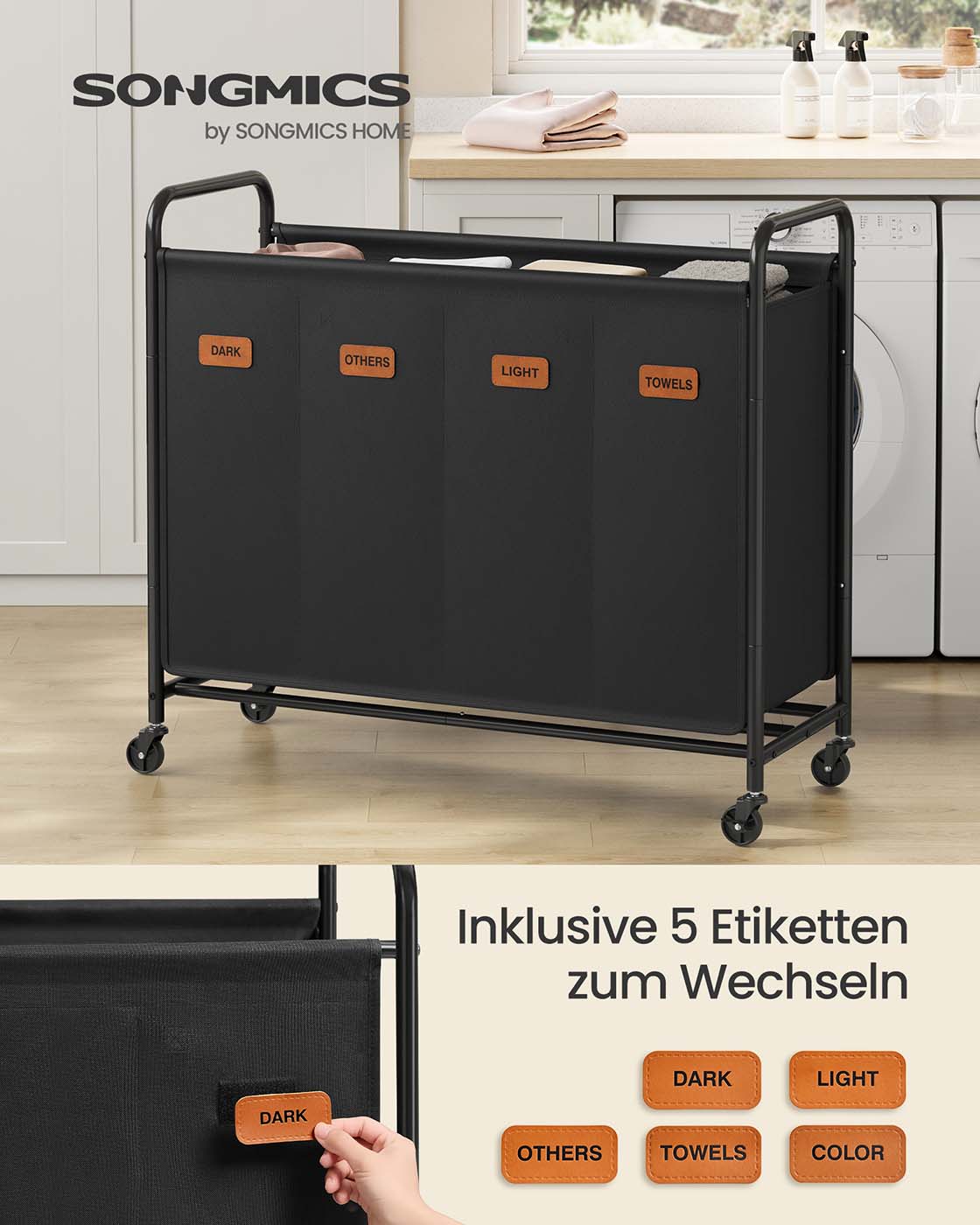 SONGMICS laundry basket with casters, laundry collector, 2 compartments, 140 L laundry sorter, mobile laundry cart, 5 labels, for laundry room, bedroom, bathroom, ink black RLS210B01