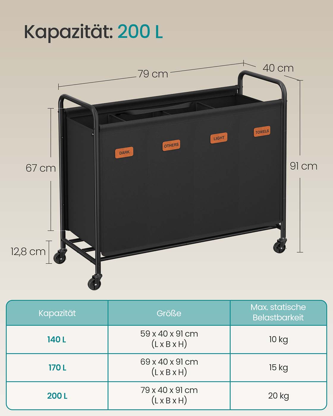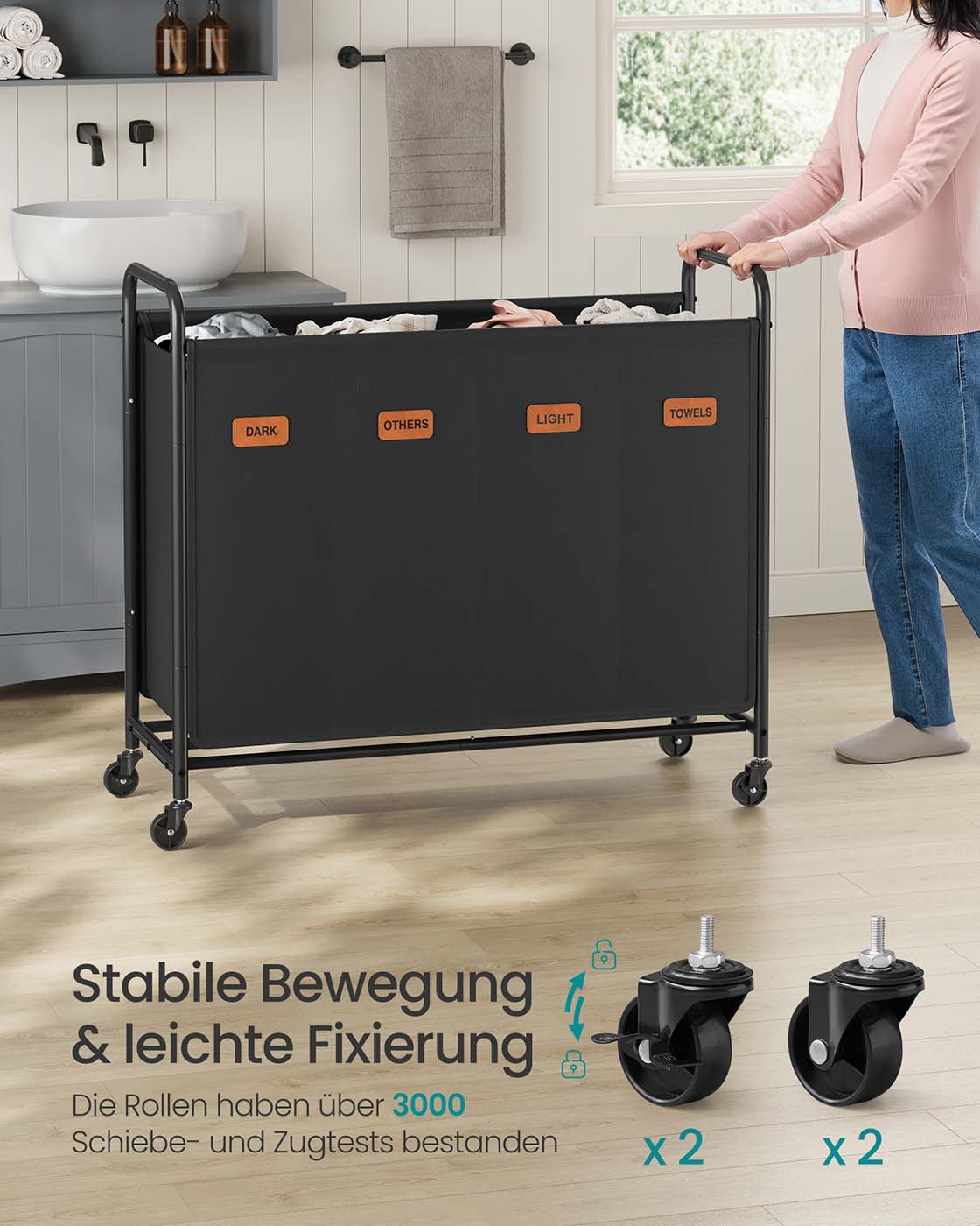 SONGMICS laundry basket 200 L with casters and 3 compartments, ink black