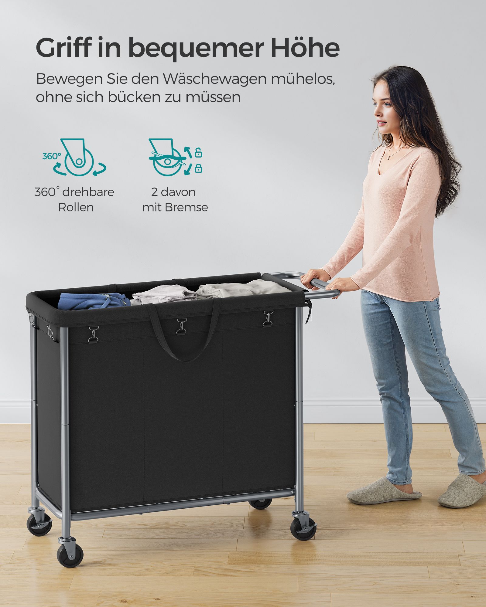 SONGMICS laundry basket, 3 compartments, 200 liters, with casters and handle