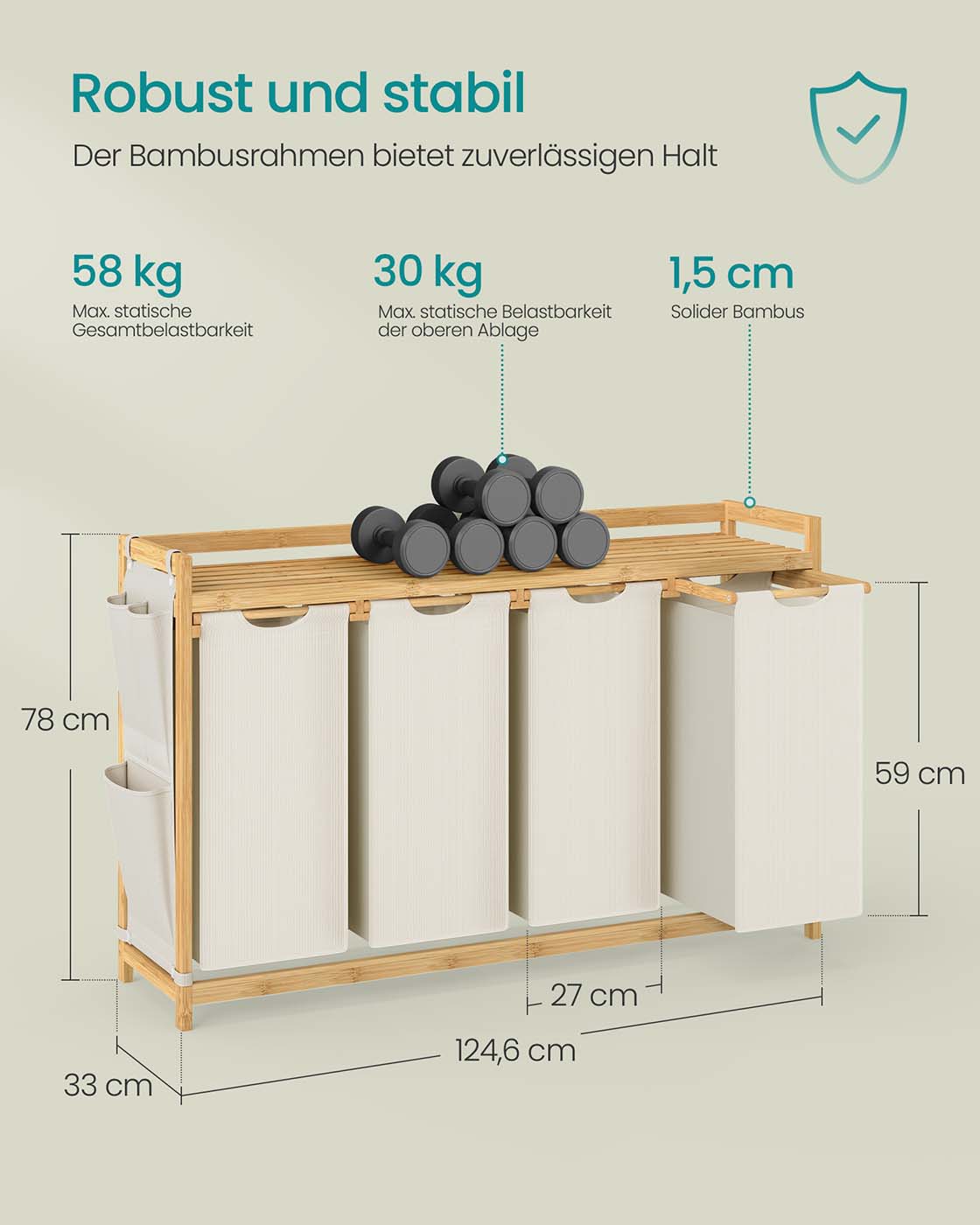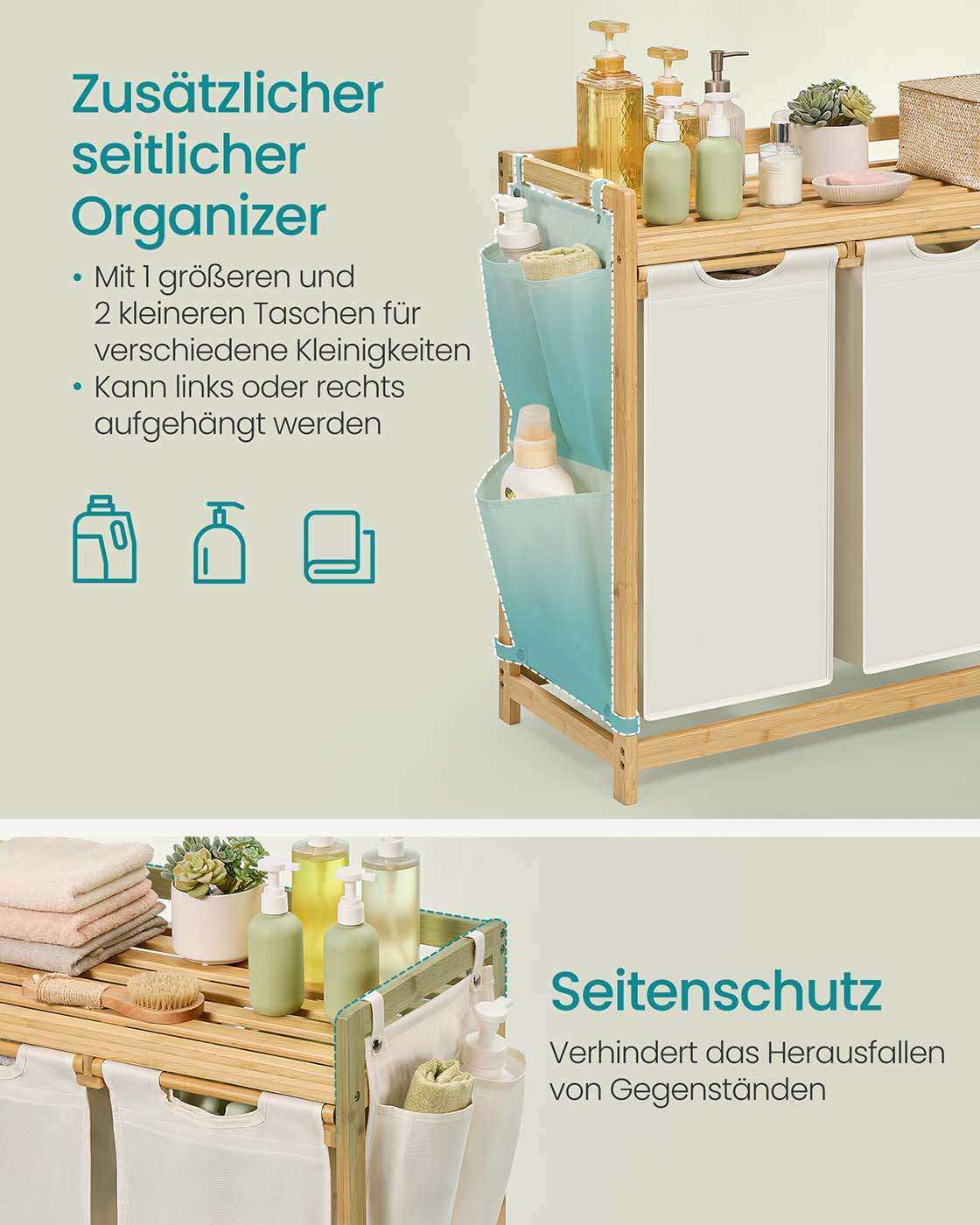 SONGMICS laundry basket 3 compartments, bamboo, laundry collector 150 L, laundry sorter, with shelf, laundry bag, small side pockets, laundry rack, 3 x 50 L, 94 x 33 x 78 cm, cream white RLH115W01