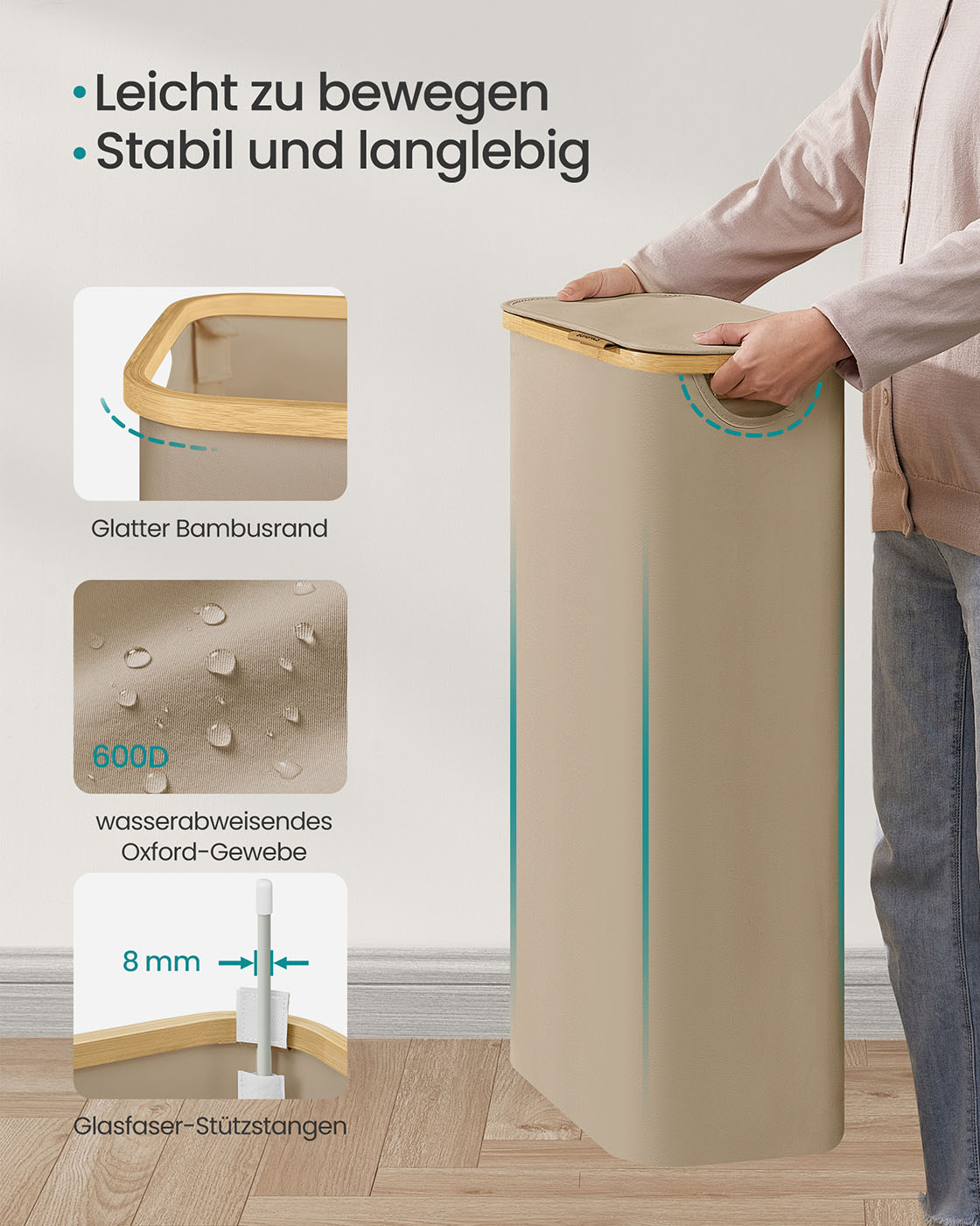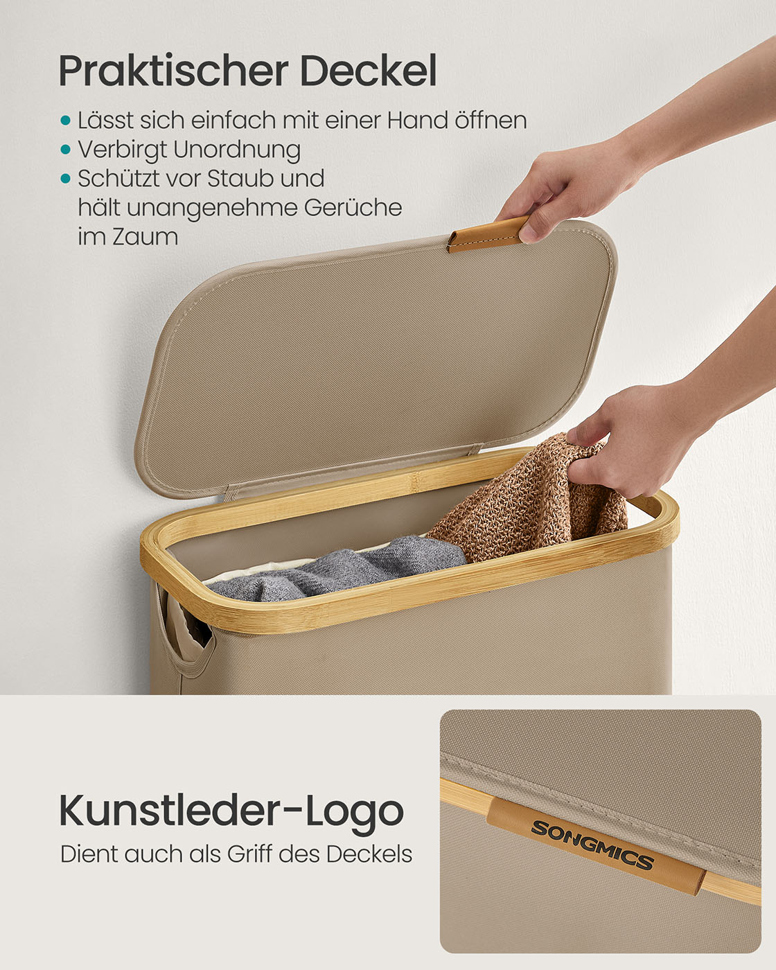 SONGMICS laundry basket, laundry collector with lid, foldable, removable laundry bag, Oxford fabric, bamboo handles, collapsible