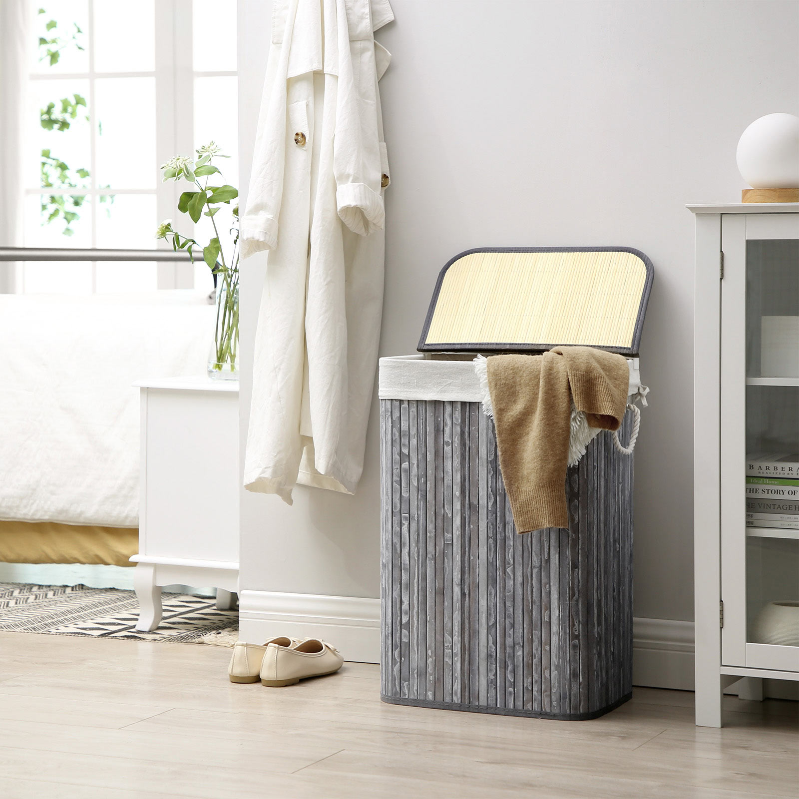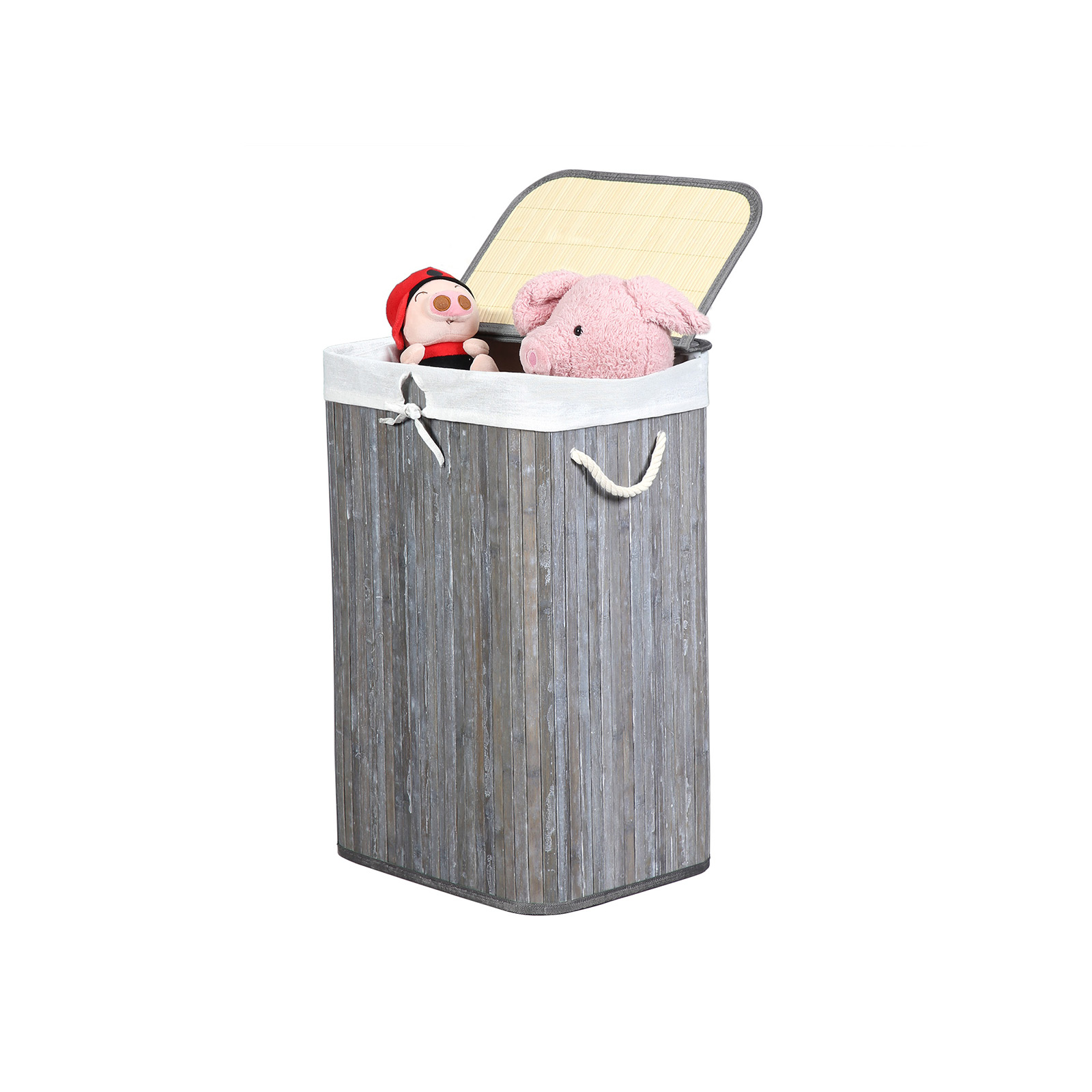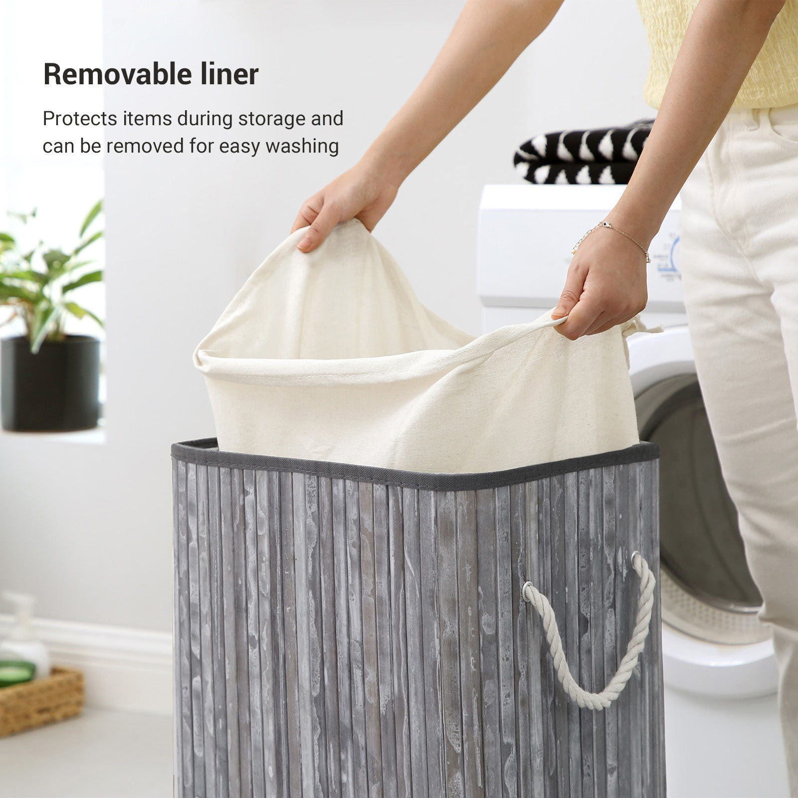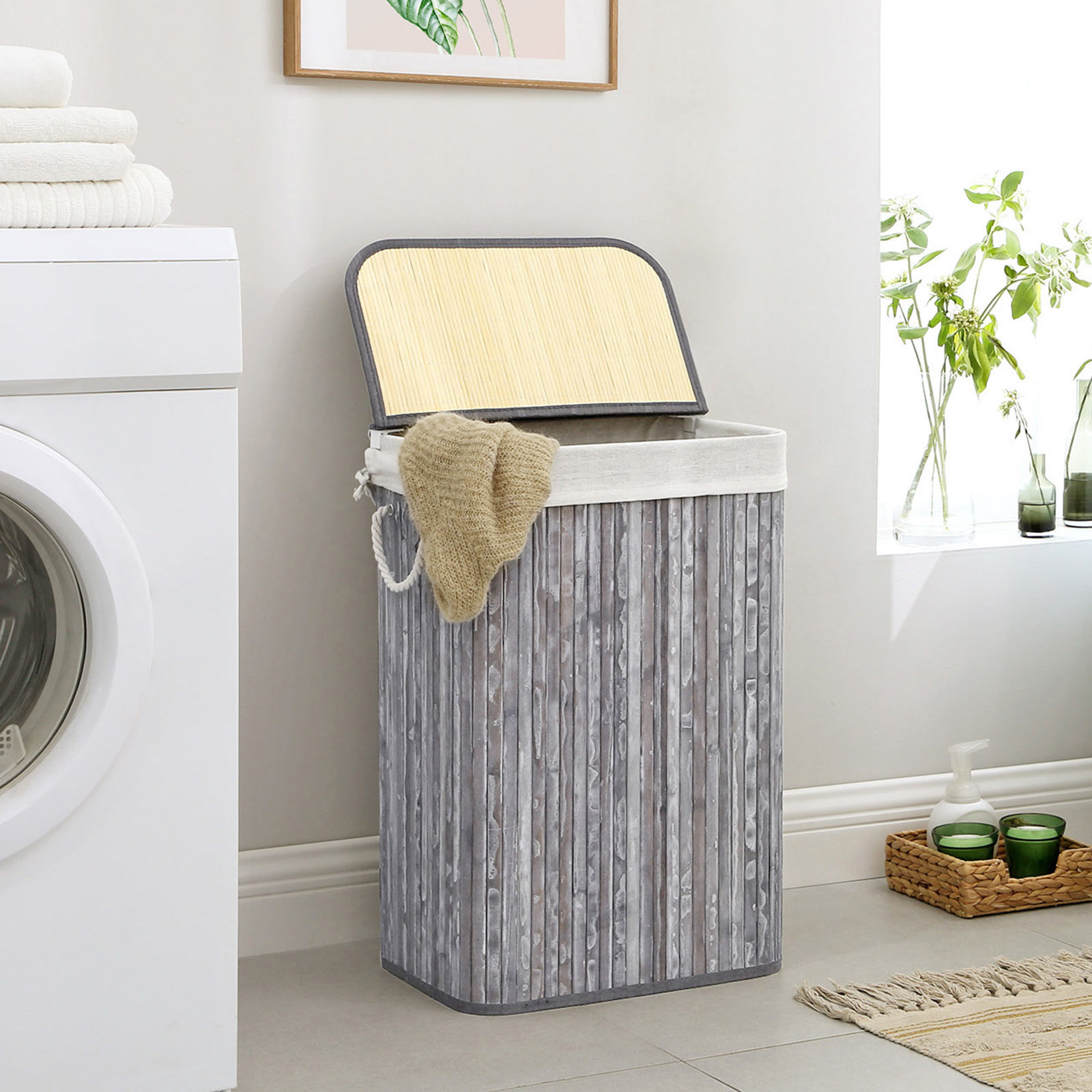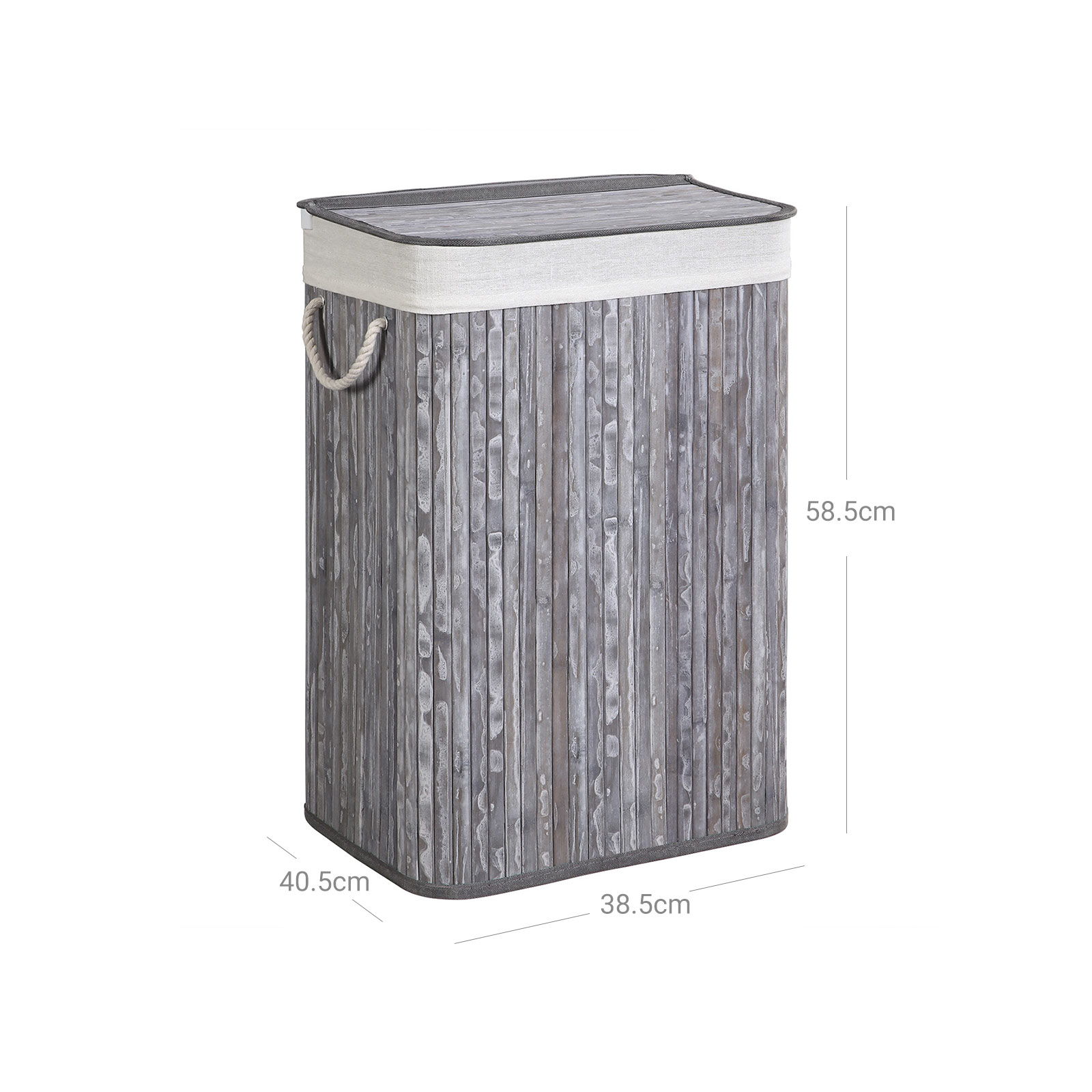 For an effortless laundry day: Is your dirty laundry scattered all over the room, so that you have to laboriously collect it on laundry day before you can take it to the washing machine? Or do you regularly discover more items of clothing after your laundry is already happily spinning in the washing machine?If so, this laundry basket from SONGMICS is just right for you! Welcome bamboo into your home: Natural material? Renewable? These are just the icing on the cake when it comes to the advantages of bamboo. This material is also characterized by its high stability and attractive, fresh appearance. So you don’t have to compromise on style when you want to buy a sturdy piece of furniture. Will accompany you for many years: The metal frame and base plate give the basket a stable hold. This makes this laundry basket resistant to deformation and promises good load-bearing capacity (up to 25 kg) and a long service life. Product details: Color: Gray/vintage Material: Bamboo, cotton, plywood, iron frame, ABS clip Size: 40.5 x 38.5 x 58.5 cm (L x W x H) Weight: 1.4 kg Max. static load capacity: 25 kg Scope of delivery: 1 x laundry basket 1 x instructions (DE, EN, FR, ES, IT) SONGMICS notes:Please do not store sharp objects in this product to avoid damage or injury. The max. static load capacity is 25 kg. Please do not store heavier items in this laundry basket.