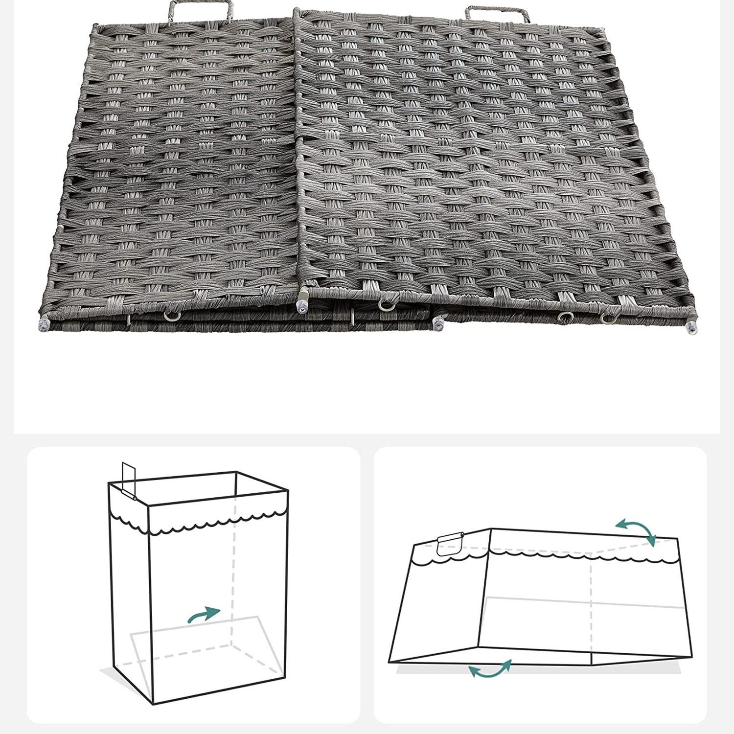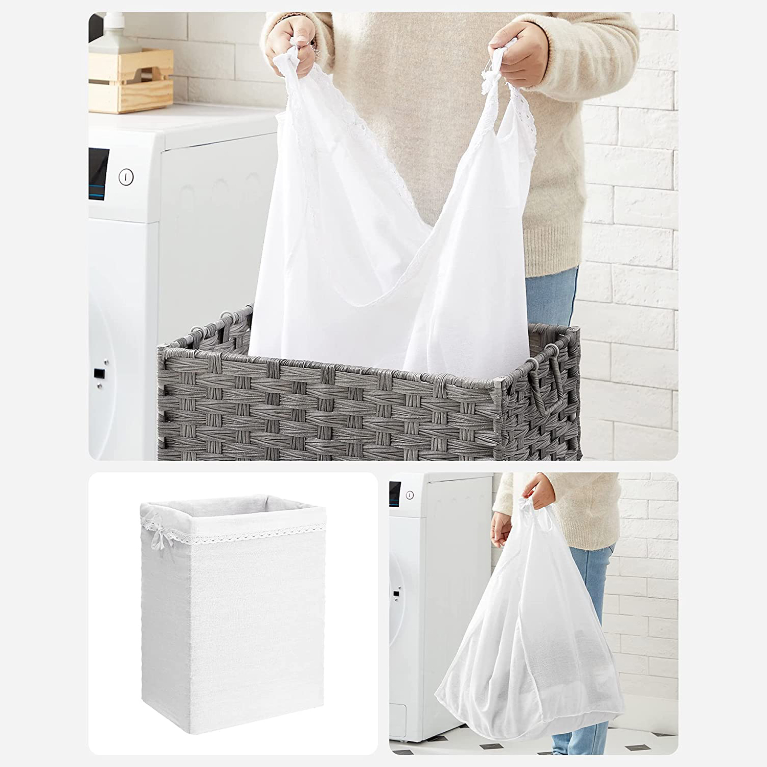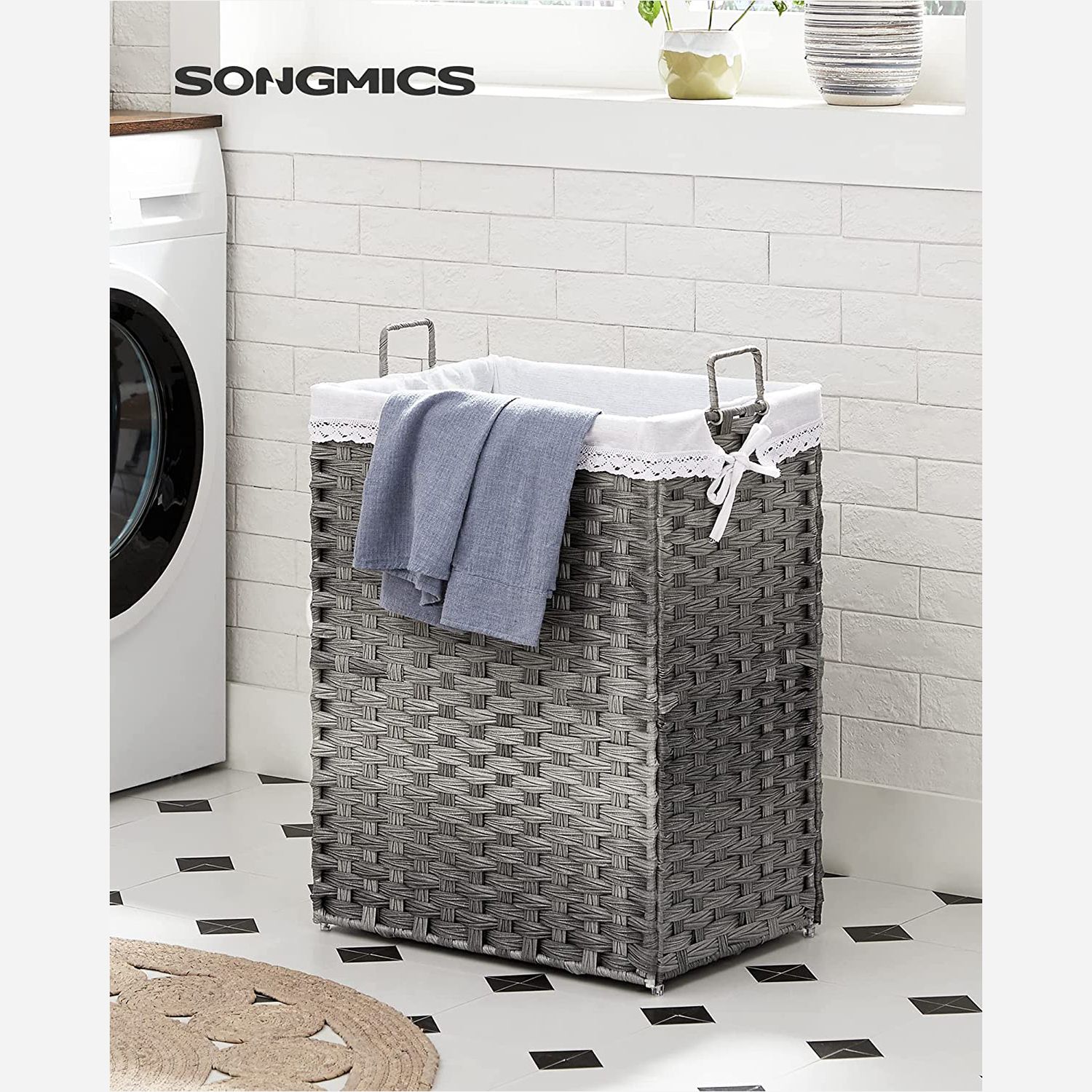 For an effortless laundry day Is your dirty laundry scattered all over the room, so that you have to laboriously collect it on laundry day before you can take it to the washing machine? If so, this laundry basket from SONGMICS is just right for you!This 46 x 33 x 60 cm 90-liter laundry collector offers plenty of storage space for your laundry. When it’s laundry day, all you have to do is carry the laundry basket to the washing machine using the handles. Of course, you can also remove the inner bag and take the laundry to the laundry room – very practical! Even better, this basket comes with 3 laundry nets to protect your delicates during washing. Product details: Color: Gray Material: Steel, PP plastic (polypropylene), polyester-cotton blend fabric Size: 46 x 33 x 60 cm (L x W x H) Handle size: 9.5 x 6 cm (W x H) Laundry net size: 50 x 60 cm (large), 40 x 50 cm (medium), 30 x 40 cm (small) Weight: 2.9 kg Volume: 90 litersMax. static load capacity of the laundry basket: 25 kgScope of delivery:1 x laundry basket2 x inner bag3 x laundry net1 x accessory pack1 x instructionsSONGMICS notes:The maximum static load capacity of the laundry basket is 25 kg. Please do not exceed this maximum weight.