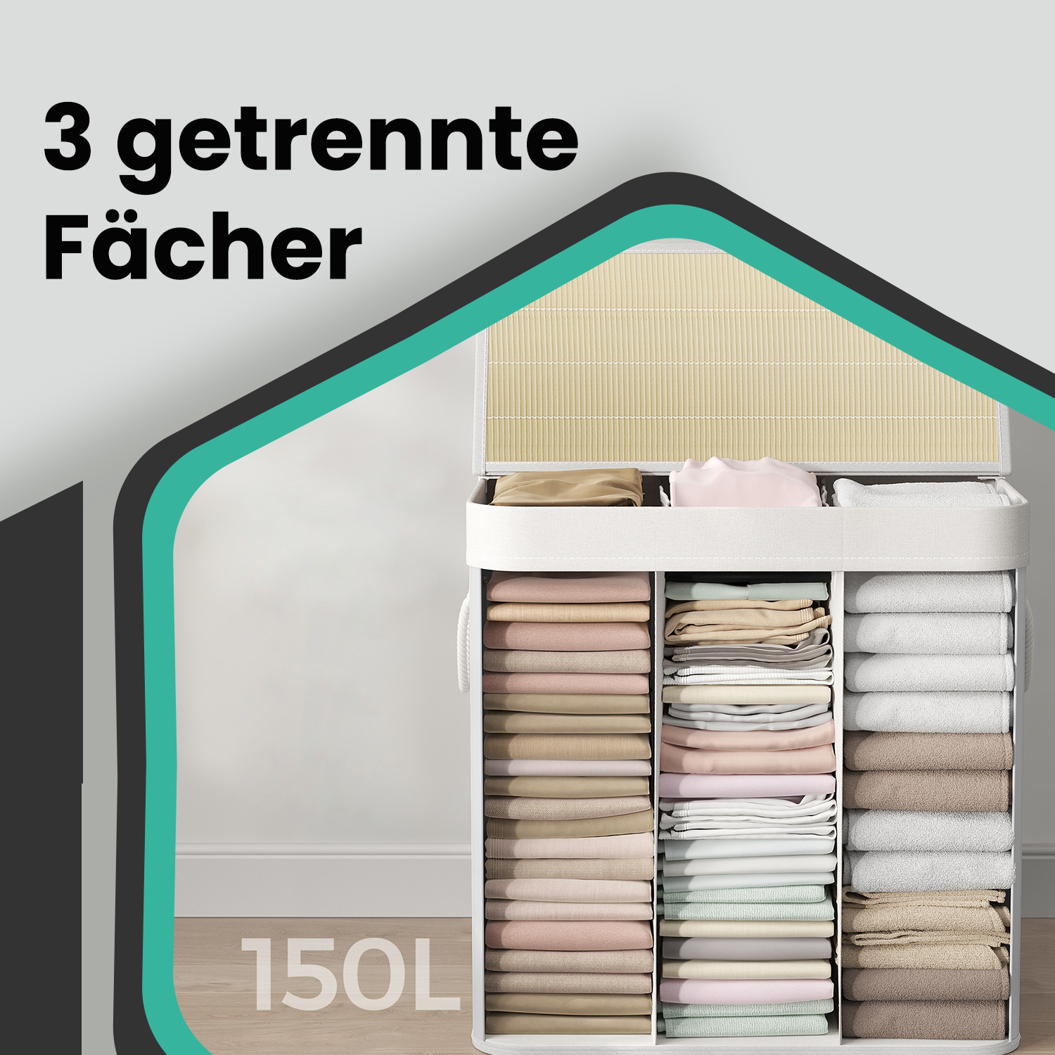 Laundry basket, laundry collector 150 L, 3 compartments, with handles, foldable, removable laundry bag, for laundry room, bedroom, natural color