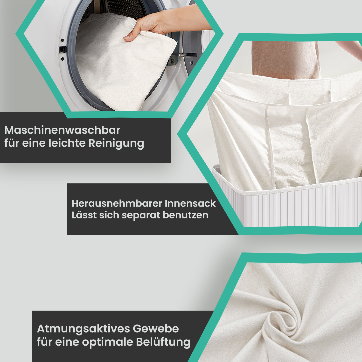 For an effortless laundry day: Is your dirty laundry scattered all over the room, so you have to laboriously collect it on laundry day before you can take it to the washing machine? Or do you regularly discover more clothes after your laundry is already happily spinning in the washing machine?If so, this laundry basket from SONGMICS is just right for you! Welcome bamboo into your home: Natural material? Renewable? These are just the icing on the cake when it comes to the advantages of bamboo. This material is also characterized by its high stability and attractive, fresh appearance. So you don’t have to compromise on style when you want to buy a sturdy piece of furniture. Will accompany you for many years to come: The metal frame and base plate give the basket a stable hold. This makes this laundry basket resistant to deformation and promises good load-bearing capacity (up to 25 kg) and a long service life.Product details: Color: White Material: Bamboo, cotton, plywood, metal frame, ABS clip Size: 60 x 40 x 61.5 cm (L x W x H) Weight: 3.7 kg Max. static load capacity: 25 kg Scope of delivery: 1 x laundry basket SONGMIX Notes:Please do not store sharp objects in this product to avoid damage or injury. The max. static load capacity is 25 kg. Please do not store heavier items in this laundry basket.