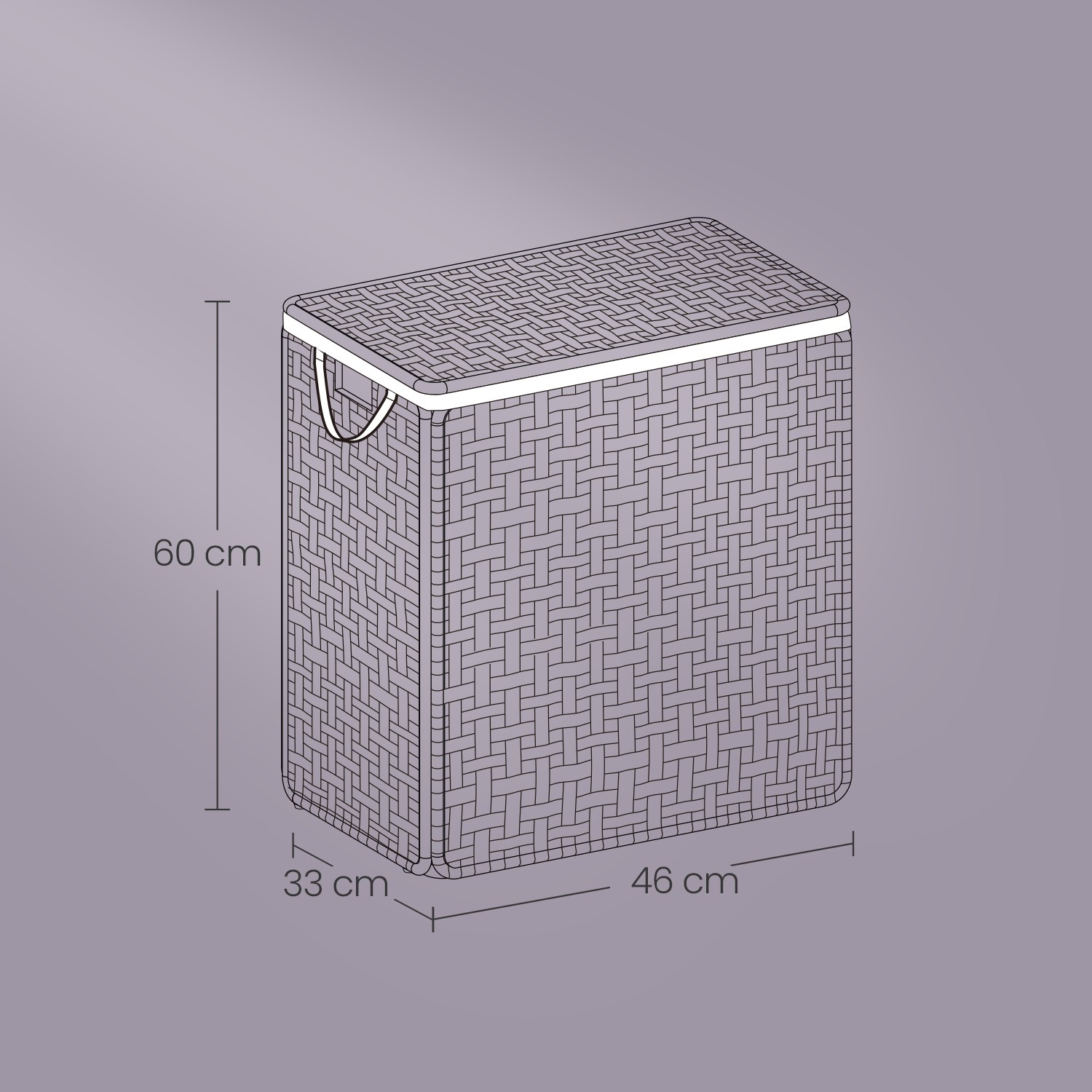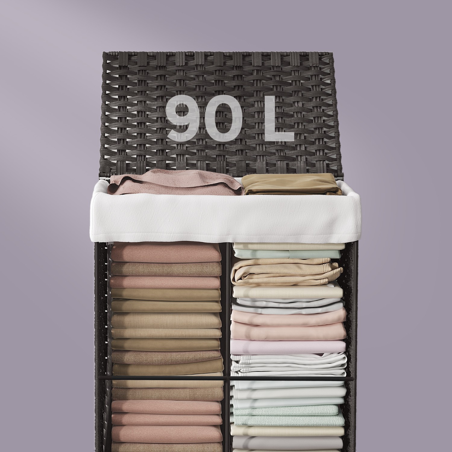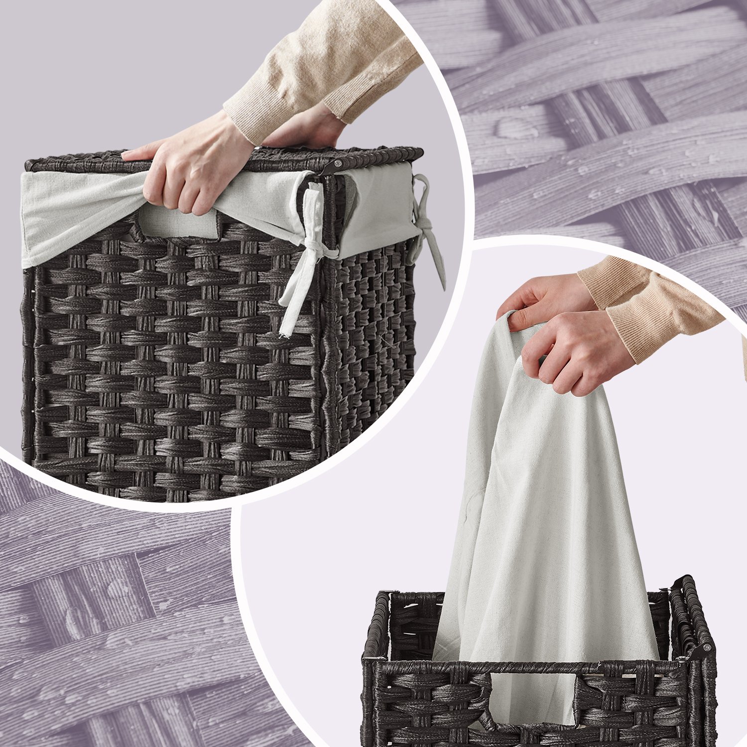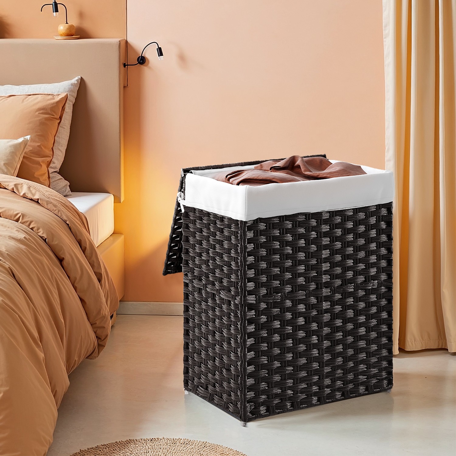 A tidy home is a happy home: Of course, it’s very convenient to just throw your dirty laundry on the floor after taking it off. However, this not only makes your home more chaotic, but you also have to laboriously collect your dirty laundry on laundry day. With this laundry basket, you can finally say goodbye to your messy bedroom. This 46 x 33 x 60 cm (L x W x H) laundry collector makes it easy to store your dirty laundry in one place. The laundry bag is attached to the basket so that it cannot slide down. It can also be easily removed and carried to the washing machine. Hand-woven furniture with charm: The hand-woven basket will add a touch of class to your home. Thanks to the high-quality synthetic rattan and iron frame, you don’t have to worry about rust or water damaging your laundry chest or the clothes stored inside—even in a damp room such as a bathroom. The basket is also ideal for storing toys in the children’s room or utensils in your workshop and can hold up to 25 kg. Product details:Color: Black Material: PP plastic rattan, iron frame, cotton Size: 46 x 33 x 60 cm (L x W x H) Weight: 4 kg Max. static load capacity: 25 kg Scope of delivery: 1 x laundry basket 1 x container with accessories 1 x instructions (DE, EN, FR, ES, IT)
