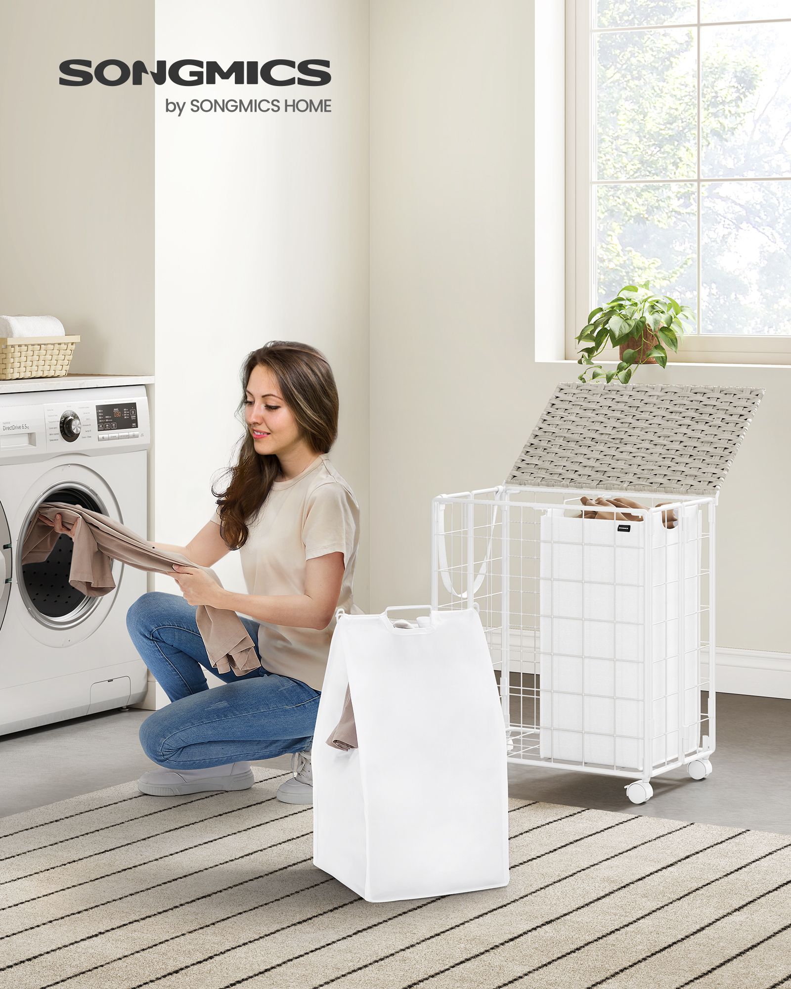 SONGMICS laundry basket 110 L, laundry collector with casters, removable laundry bag, 2 inner bags, laundry trolley with lid, 57 x 33 x 65 cm, for laundry room