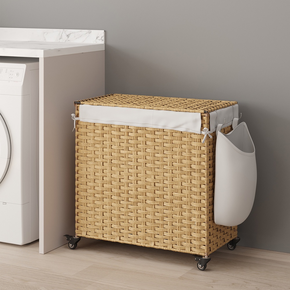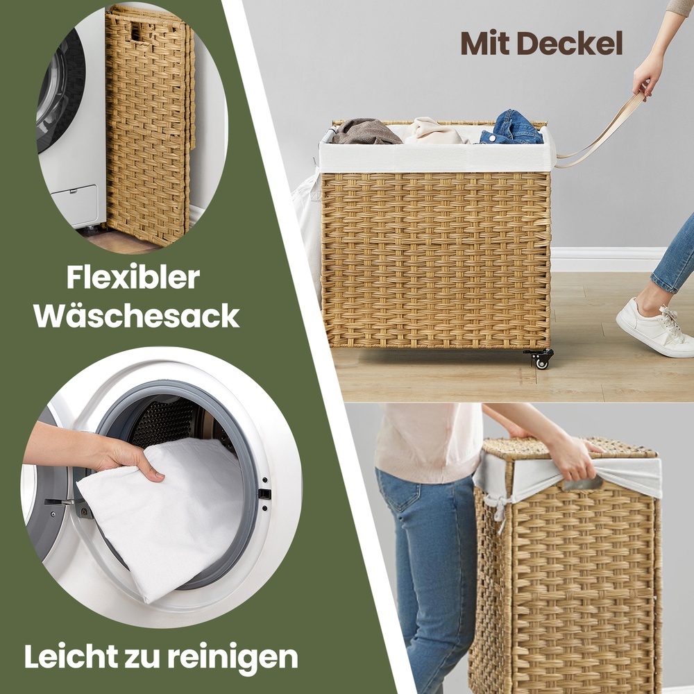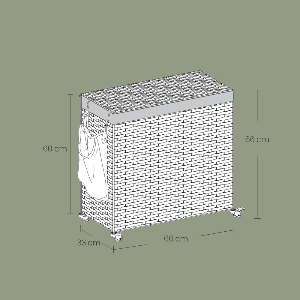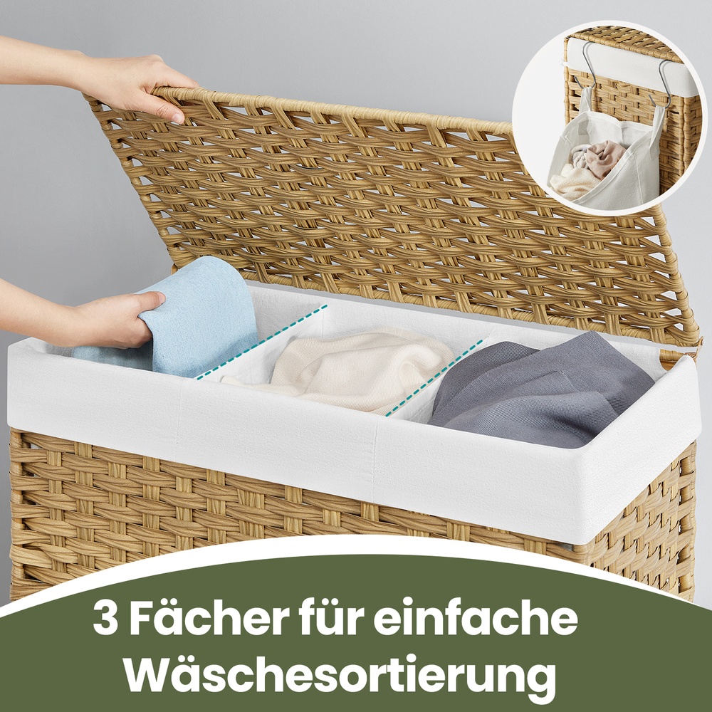 You can expect the following benefits: The hand-woven surface gives this chest a special look. Supported by a sturdy metal frame, this laundry basket will serve you well for many years to come. When not in use, you can fold this basket up and store it away to save space. The bags can be washed in the washing machine.The simple structure of this chest makes assembly a breeze. This laundry basket fits perfectly in the laundry room, bedroom, bathroom, or living room. Product details: Color: Natural colors Material: PP plastic (polypropylene), metal frame, cotton Size: 66 x 33 x 60 cm (L x W x H) Weight: 3.5 kg Max. static load capacity: 30 kg Scope of delivery: 1 x laundry basket 1 x instructions SONGMICS notes: Please do not store sharp objects in this product to avoid damage or injury.The max. static load capacity is 30 kg. Please do not store any heavier items in this laundry basket. This is a hand-woven product. Occasionally, irregularities may occur in individual woven bands and their joints, but this does not affect the use of the product.