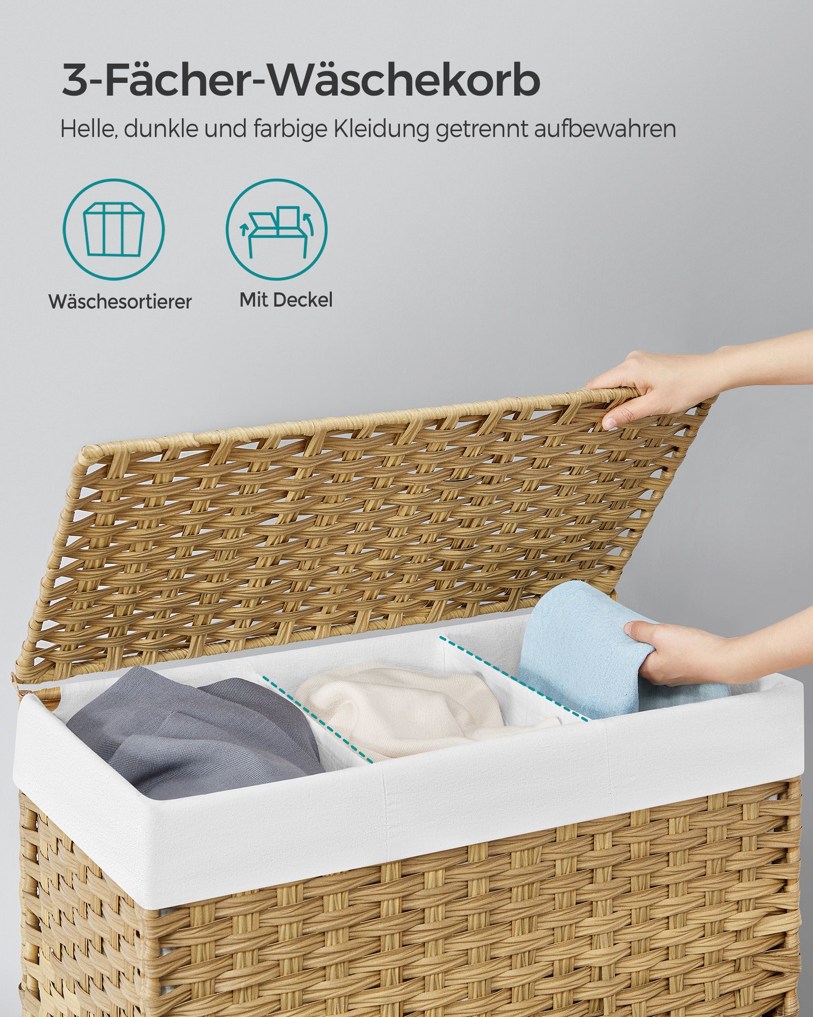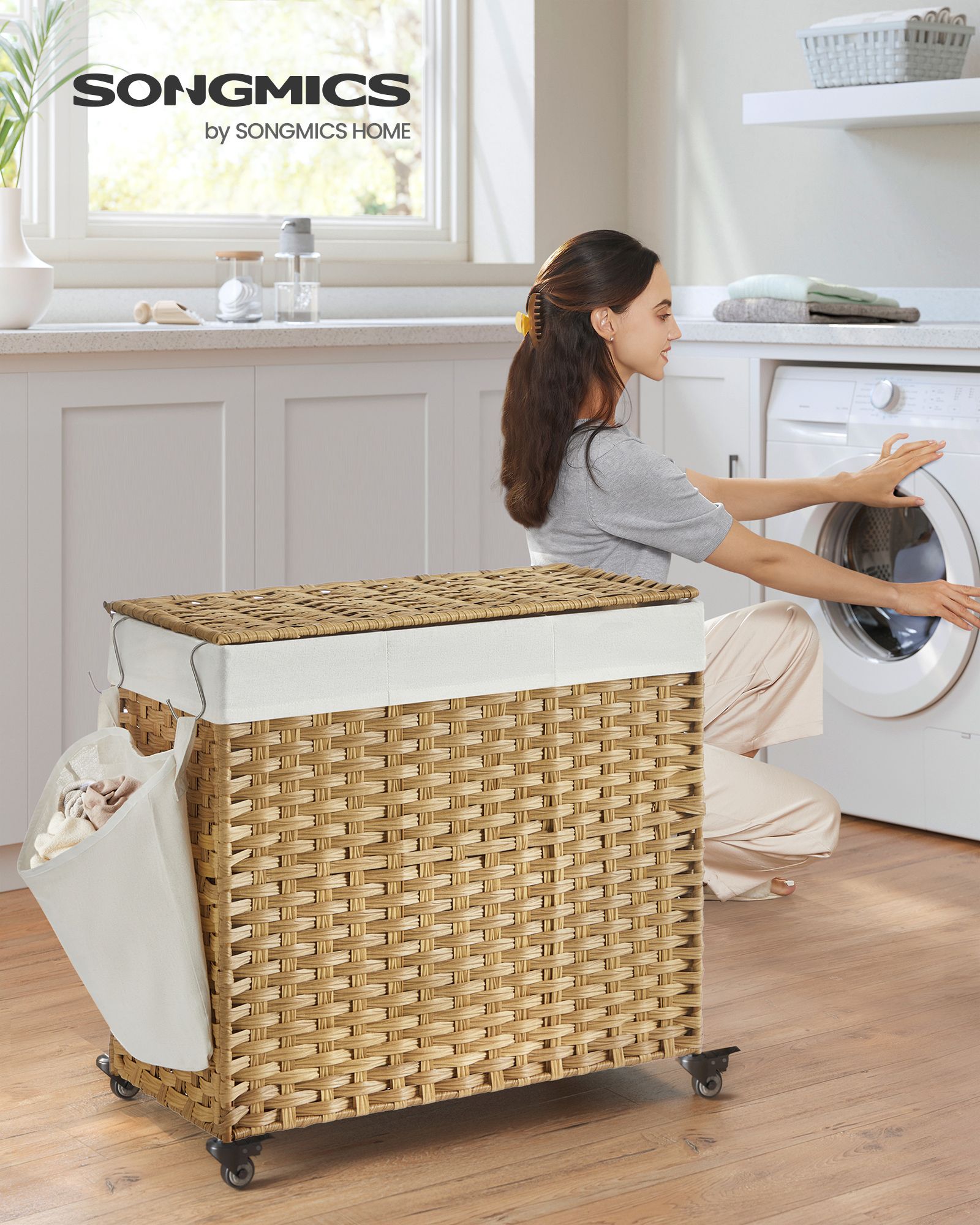 You can expect the following benefits: The hand-woven surface gives this chest a unique look. Supported by a sturdy metal frame, this laundry basket will serve you well for many years to come. When not in use, you can fold this basket up and store it away to save space. The bags can be washed in the washing machine.The simple structure of this chest makes assembly a breeze. This laundry basket fits perfectly in the laundry room, bedroom, bathroom, or living room. Product details: Color: Natural colors Material: PP plastic (polypropylene), metal frame, cotton Size: 66 x 33 x 60 cm (L x W x H) Weight: 3.5 kg Max. static load capacity: 30 kg Scope of delivery: 1 x laundry basket 1 x instructions SONGMICS notes: Please do not store sharp objects in this product to avoid damage or injury.The max. static load capacity is 30 kg. Please do not store any heavier items in this laundry basket. This is a hand-woven product. Occasionally, irregularities may occur in individual woven bands and their joints, but this does not affect the use of the product.