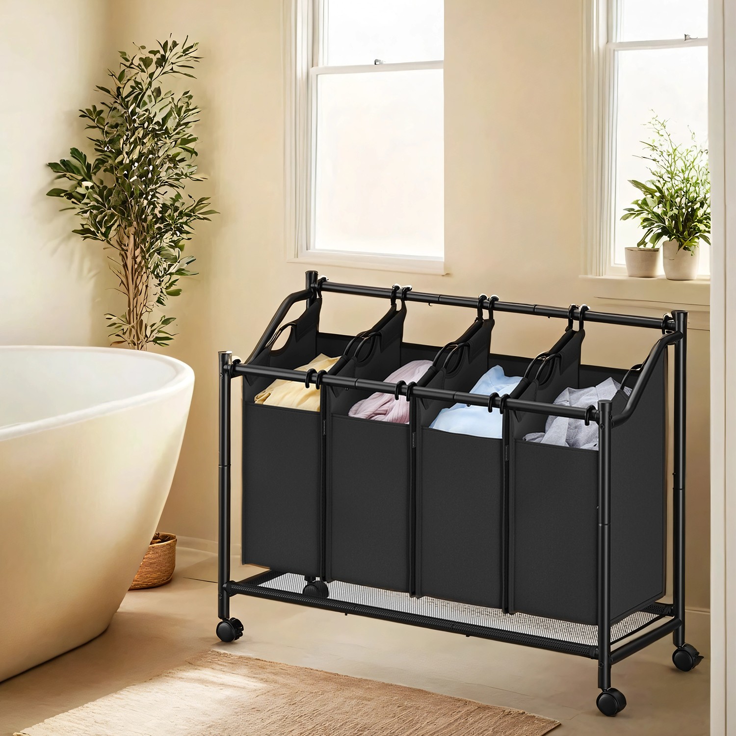 SONGMICS Laundry basket, laundry collector with 4 removable fabric bags, laundry container on wheels, laundry sorter, sturdy, 4 x 35 liters, black LSF005