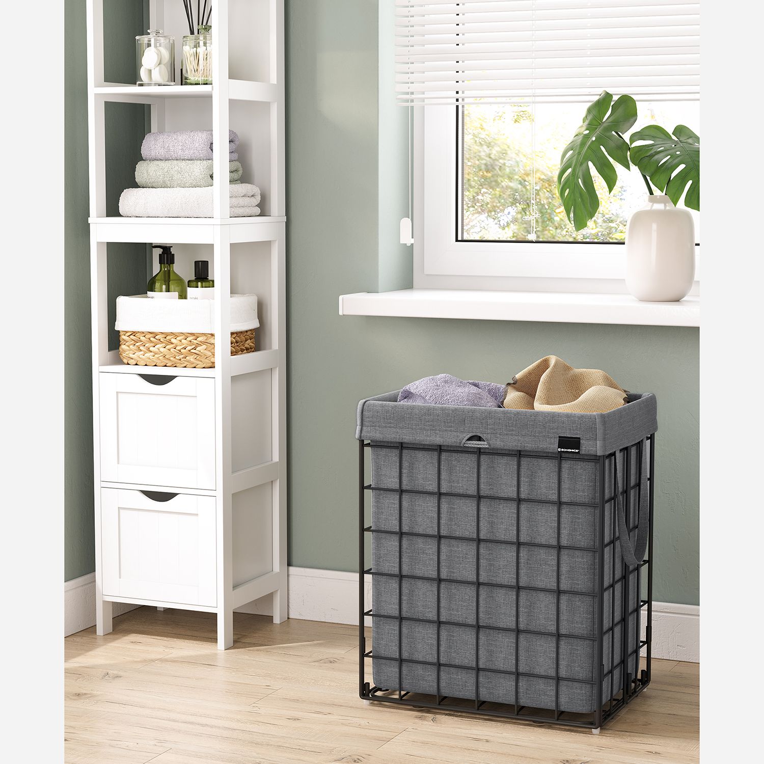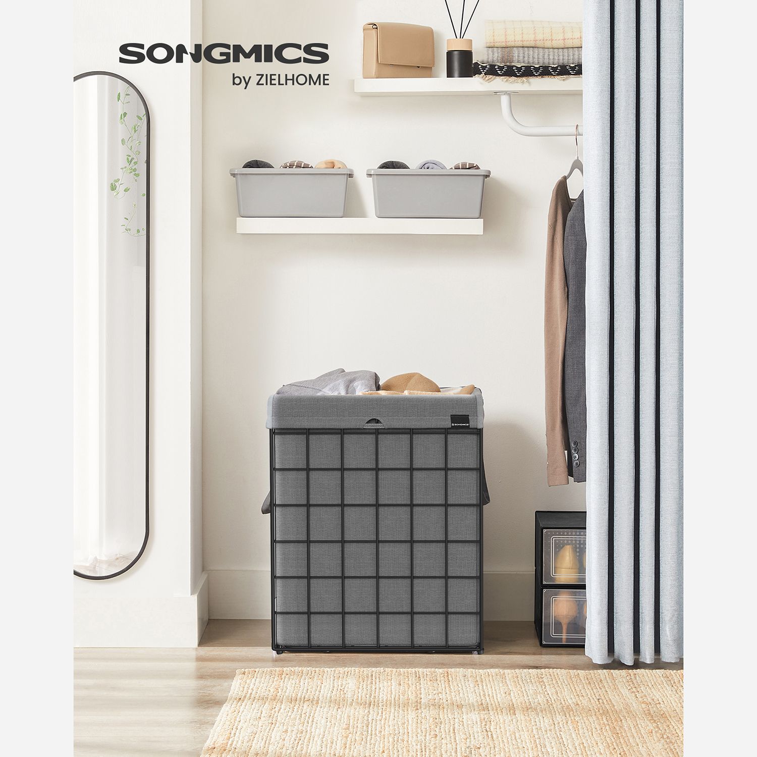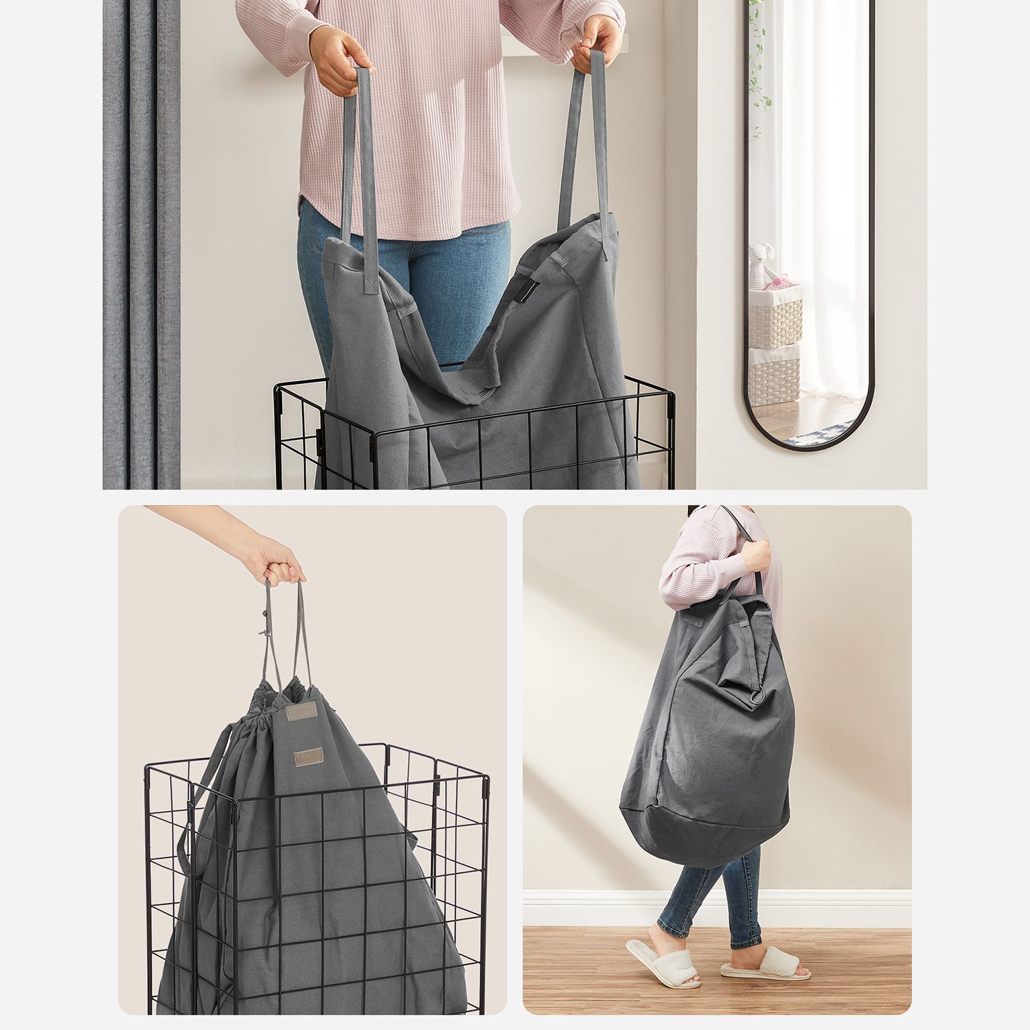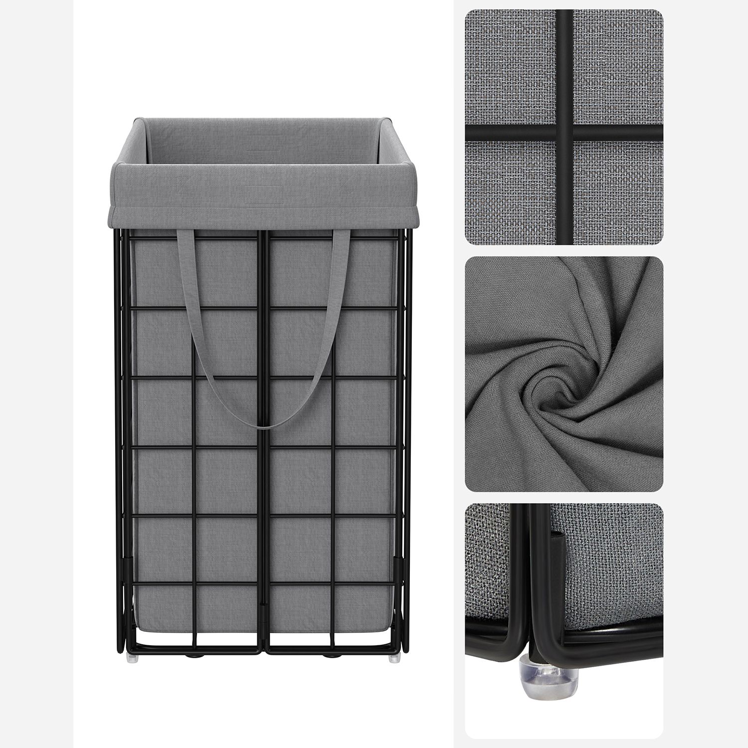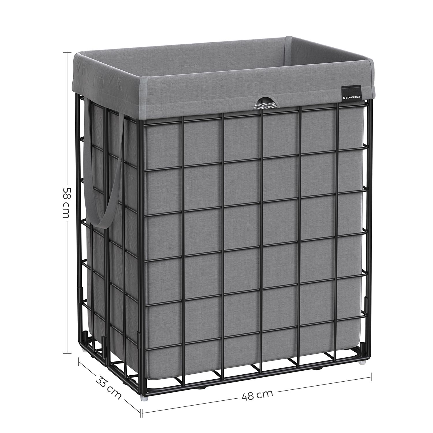 Are you looking for a laundry basket that makes laundry day as easy as possible? This SONGMICS laundry collector is the right answer, because it has everything you need: – Sturdy and spacious: With a capacity of 90 liters and a load capacity of 20 kg for the bag and 30 kg for the metal basket, it can hold a lot of dirty laundry. – Removable and portable: With Velcro fasteners and handles, you can easily remove the bag and put it in the washing machine. – Easy to assemble and space-saving: Thanks to its foldable design, the basket is easy to assemble or store in a corner when not in use, so it takes up less space. – Washable and breathable: The bag is made of a cotton-polyester blend and is machine washable and breathable, allowing the smell of dirty laundry to escape. – Versatile: Also suitable as a container for storing bed linen or towels. – Easy to adapt: With its simple appearance, it can be easily adapted to the style of your bedroom, laundry room, or bathroom. Product details: – Color: Black-gray. – Material: steel, cotton-polyester blend- Size: 48 x 33 x 58 cm (L x W x H)- Capacity: 90 liters- Weight: 3.5 kg- Maximum static load capacity of the bag: 20 kg- Maximum static load capacity of the basket: 30 kgScope of delivery:- 1 x laundry basket- 1 x instructions