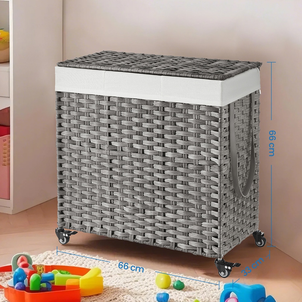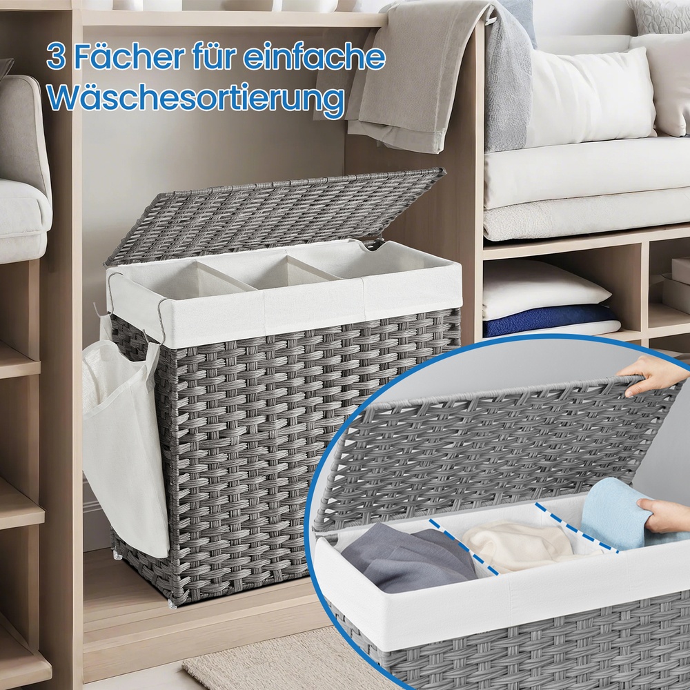 A tidy home is a happy home: Of course, it’s very convenient to just throw your dirty laundry on the floor after taking it off. However, this not only makes your home more chaotic, but you also have to laboriously collect your dirty laundry on laundry day. Why not try this laundry collector? It has 3 compartments and also comes with a lid. This allows you to not only store your dirty laundry in an organized manner, but also keep it out of sight. You can expect the following benefits: – The hand-woven surface gives this chest a special look. – Supported by a sturdy metal frame, this laundry basket will serve you for many years to come. – When not in use, you can fold this basket and store it to save space.- The bags can be washed in the washing machine. – The simple structure of this chest makes assembly a breeze. – This laundry basket fits perfectly in the laundry room, bedroom, bathroom, or living room. Product details: – Color: Gray – Material: PP plastic (polypropylene), metal frame, cotton – Size: 66 x 33 x 60 cm (L x W x H) – Weight: 3.5 kg – Max. static load capacity: 30 kg Scope of delivery: – 1 x laundry basket – 1 x instructions SONGMICS notes: – Please do not store sharp objects in this product to avoid damage or injury.- The max. static load capacity is 30 kg. Please do not store any heavier items in this laundry basket. – This is a hand-woven product. Occasionally, irregularities may occur in individual woven bands and their joints, but this does not affect the use of the product.