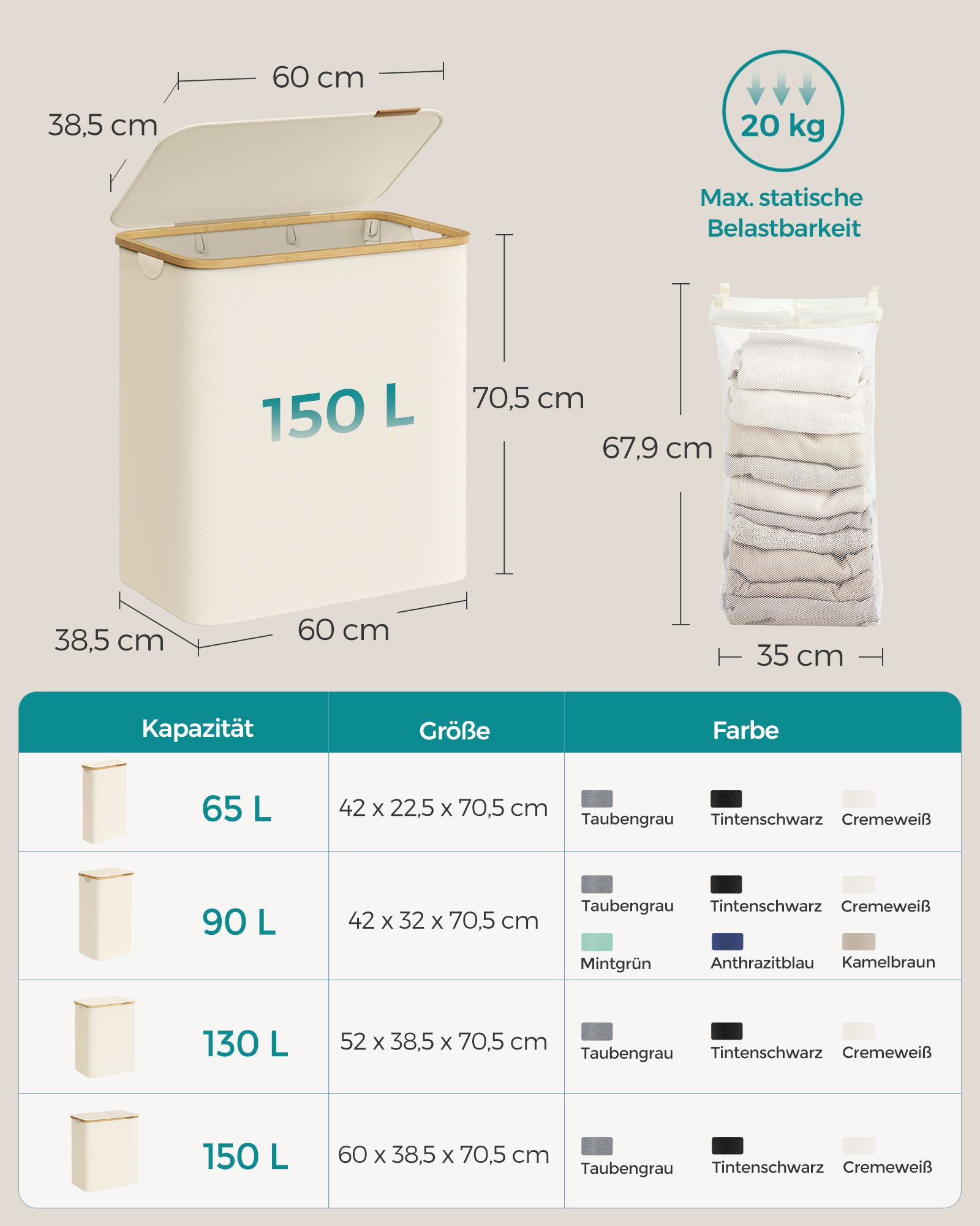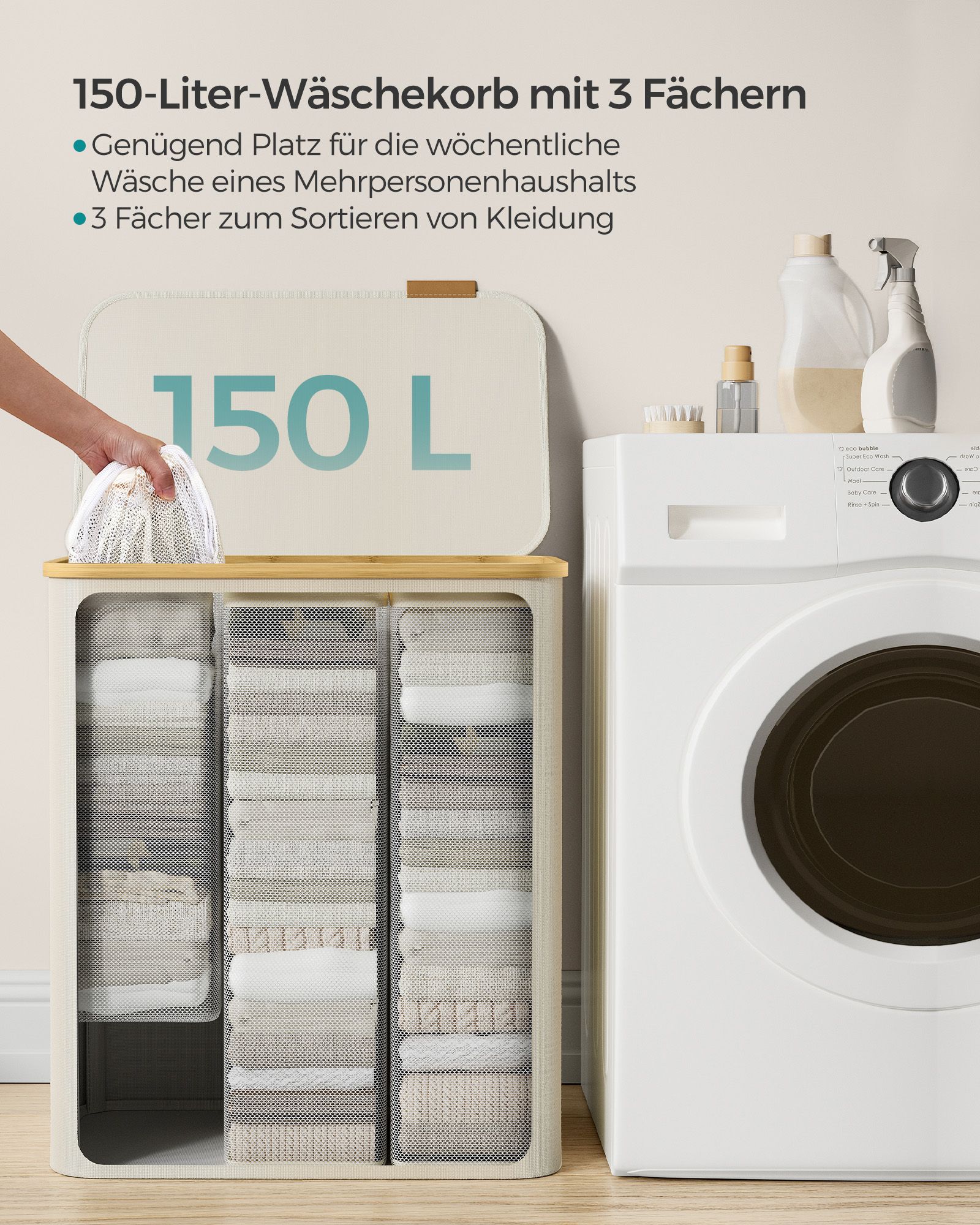SONGMICS laundry basket, laundry collector with lid, foldable, removable laundry bag, Oxford fabric, bamboo handles, collapsible
