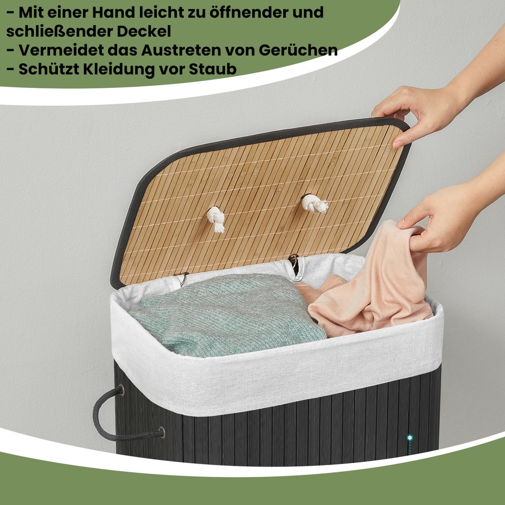 Are you looking for a laundry basket that looks attractive, is made of natural materials, has a lid, and isn’t too expensive? Then this Songmics laundry basket is sure to win you over. It is very sturdy and stable, offers approximately 72 liters of storage space, and serves its purpose perfectly. With its bamboo look, it looks great in any bedroom and brings nature into your home. Assembly is child’s play! It can be assembled in a few minutes and makes a good impression right away. When not in use, the basket can be folded up again. The Songmics laundry basket takes up little space and fits perfectly in alcoves, bathrooms, on balconies, in bedrooms, etc. It can be used not only for storing laundry, but also for storing stuffed animals, toys, fresh clothes, blankets, etc. With the Songmics laundry basket, you will enjoy your purchase for years to come. Product details: – Dimensions: 40 x 60 x 30 cm (W x H x D) – Material: bamboo – Weight: 2.03 kg – Color: black Scope of delivery: – 1 x bamboo mat – 1 x lid – 1 x metal ring – 1 x base plate – 1 x laundry bag Notes: – 1. To prevent mold, it is recommended not to use the laundry basket in a damp or wet environment! – 2. Only suitable for dry laundry. Please do NOT leave wet laundry in the laundry basket! – 3. Please do not place heavy objects on top of it!