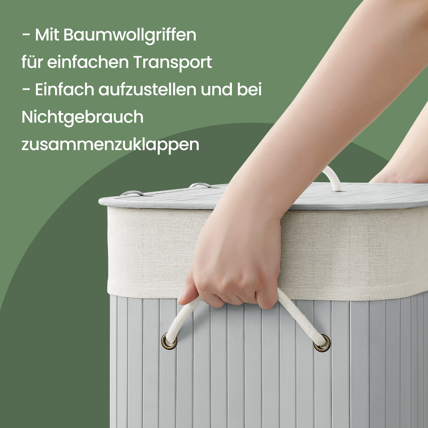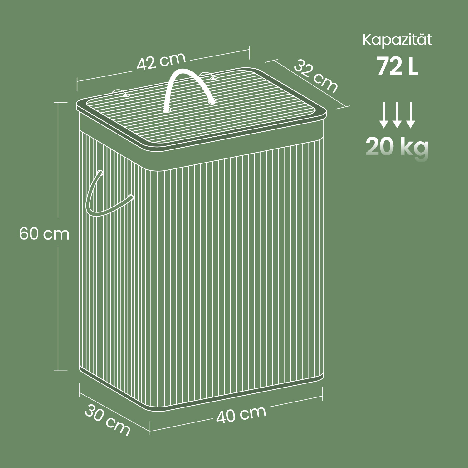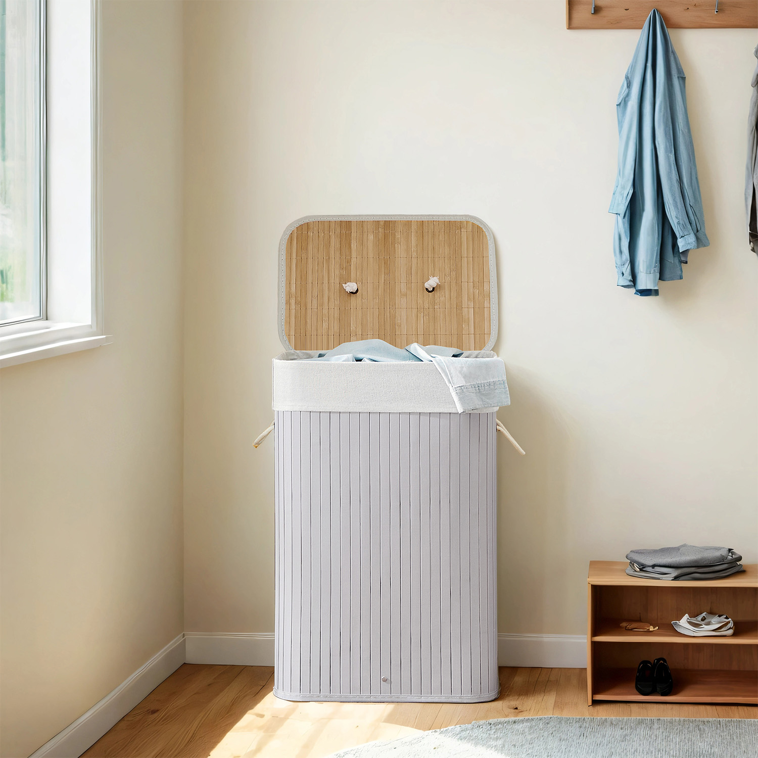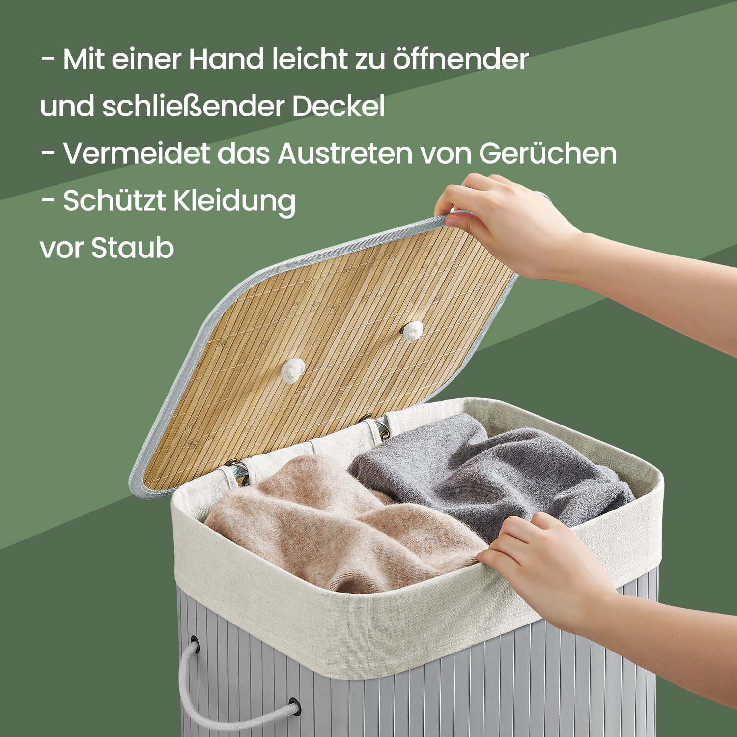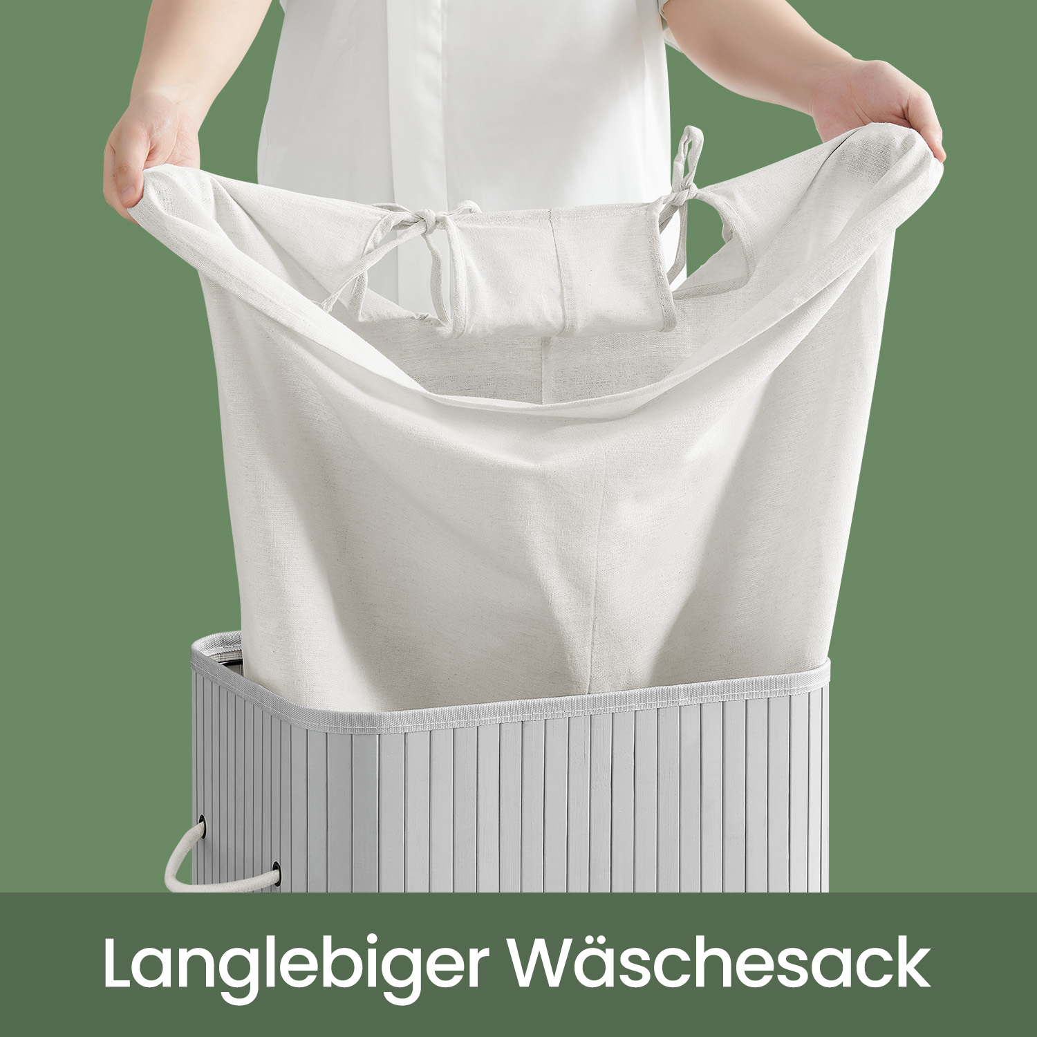 This bamboo laundry basket adds a touch of nature to your home and fits perfectly in various rooms. It offers plenty of storage space (72 liters) for your laundry. With this organizer, you can hide the everyday laundry chaos under the removable lid and create order in your home. This chest also has a removable laundry bag. Product details: – Color: Gray – Material: Bamboo, cotton laundry bag – Size: 40 x 30 x 60 cm (L x W x H) – Lid size: 42 x 32 cm (L x W) – Weight: 2.2 kg – Max. static load capacity: 20 kg Scope of delivery: – 1 x laundry basket – 1 x instructions SONGMICS Notes: – Please do not use the product in a damp environment. It should be placed in a well-ventilated room. – Please do not store heavy items in this laundry basket. – Please do not open the metal rings repeatedly to ensure a long service life. – The laundry bag is washable at 30°C. – Wipe the product with a damp cloth to clean it.
