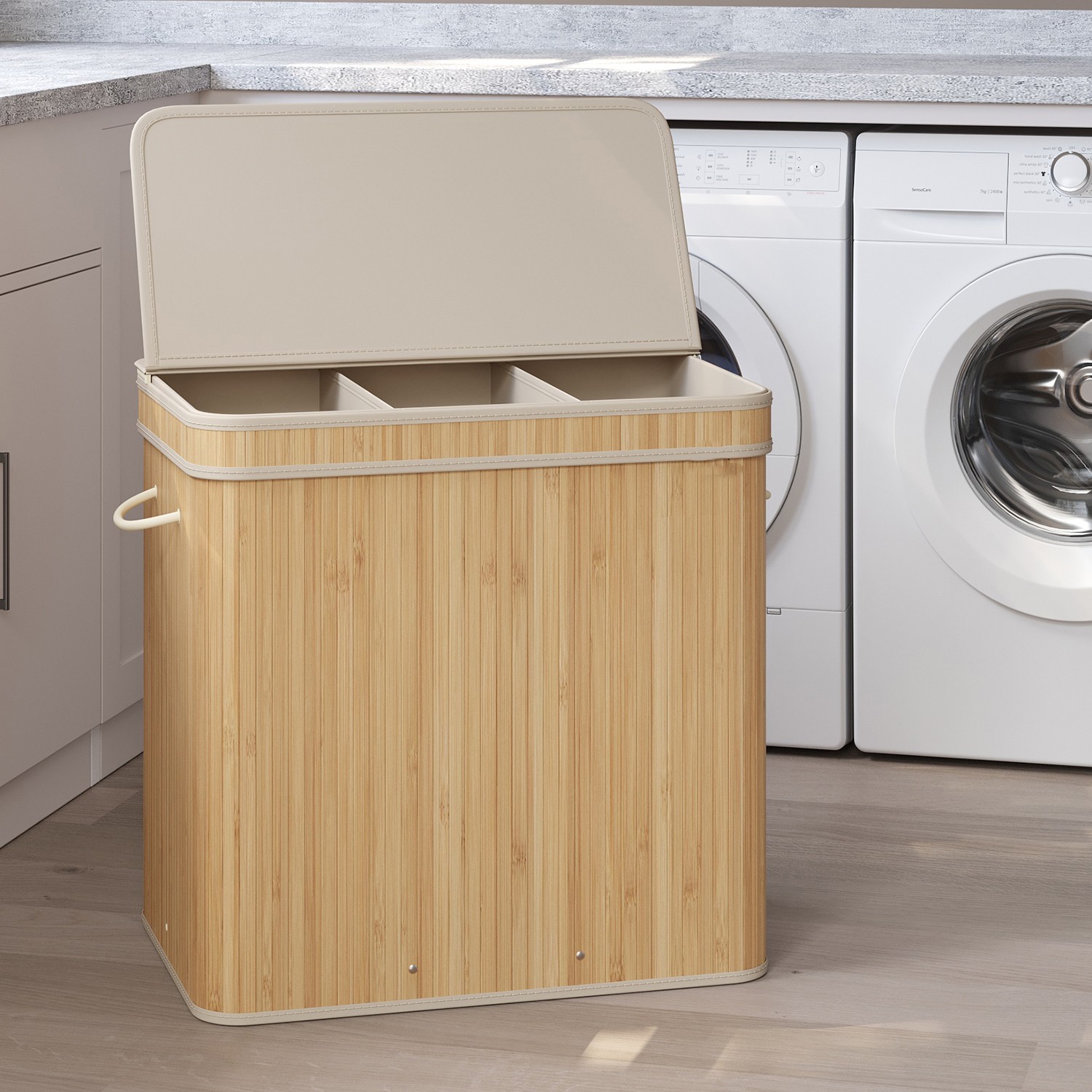 SONGMICS laundry basket with lid, 100 liters, bamboo laundry collector, removable and machine-washable laundry bag, with handles, for laundry room, bedroom, living room, natural color LCB063N01