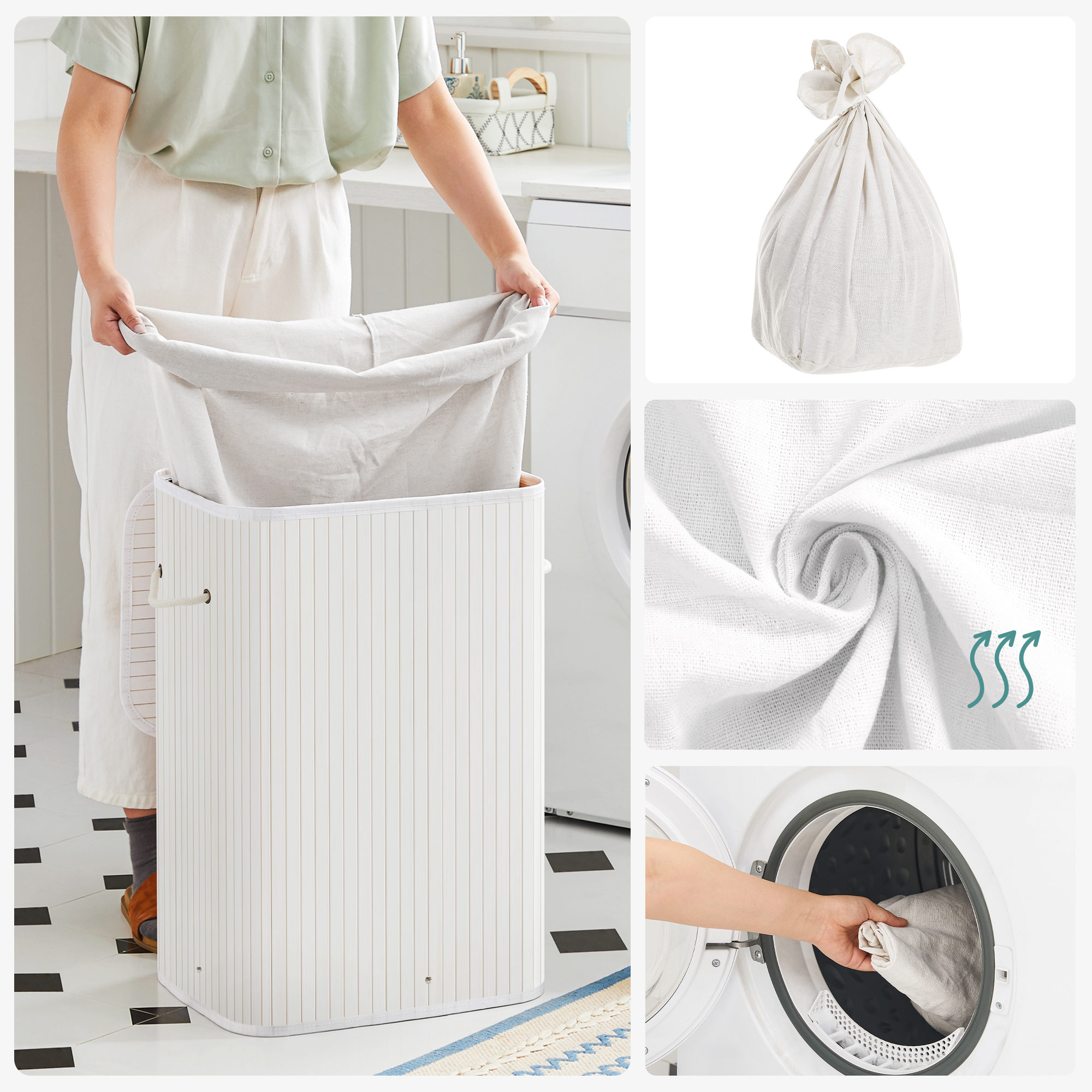 Product details: Color: White Material: Bamboo, cotton laundry bag Size: 40 x 30 x 60 cm (L x W x H) Weight: 2.2 kg Scope of delivery: 1 x laundry basket 1 x instructions SONGMICS notes: Please do not use the product in a damp environment. It should be placed in a well-ventilated room. Please do not store heavy items in this laundry basket. Please do not open the metal rings repeatedly to ensure a long service life. Wipe the product with a damp cloth to clean it. The laundry bag is washable at 30°C.
