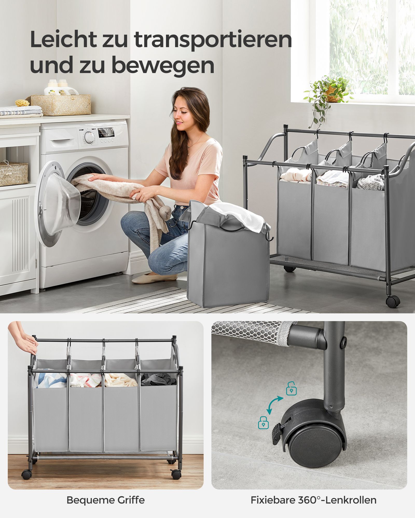 What are the advantages of the SONGMICS laundry trolley? High quality: The laundry trolley is made of powder-coated metal tubes and is stable and robust, so you can enjoy it for many years to come. The bags are made of 600D polyester, which is durable and wear-resistant. The TÜV Rheinland test, which checked the fabric for the content of certain chemicals listed in Annex XVII of the EU REACH Regulation, did not pose any obstacle for the fabric bags of the laundry collector (report no.: 1160038907a-001). Collect your laundry quickly: Thanks to 4 heavy-duty wheels, you can roll this laundry trolley from one room to another while putting your clothes, bed linen, etc. into the bags. Store dirty laundry sorted: With the 4 separate fabric bags, you can sort your laundry by color or material, so you don’t have to worry about light-colored items being discolored by dark ones. Furthermore, your delicates don’t have to lie in the same basket as your sweaty gym clothes. This laundry collector makes laundry day a breeze! Product details: Color: Gray Material: Powder-coated iron tubes, 600D polyester, nylon casters Overall size: 87.5 x 38.5 x (67-81) cm (L x W x H) Weight: 4.5 kg Scope of delivery: 1 x laundry collector with 4 fabric bags 1 x bag with accessories 1 x instructions (DE, EN, ES, FR, IT)