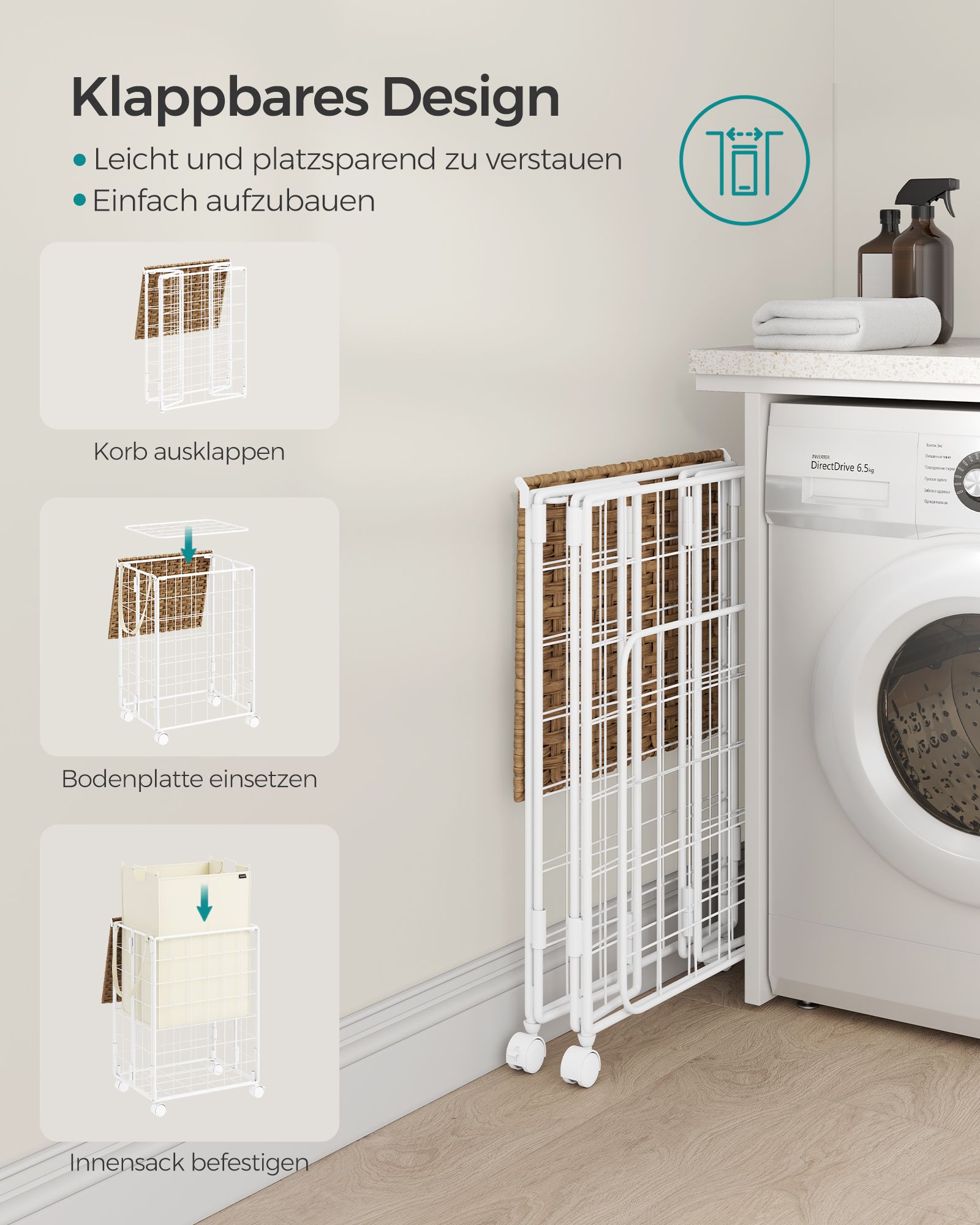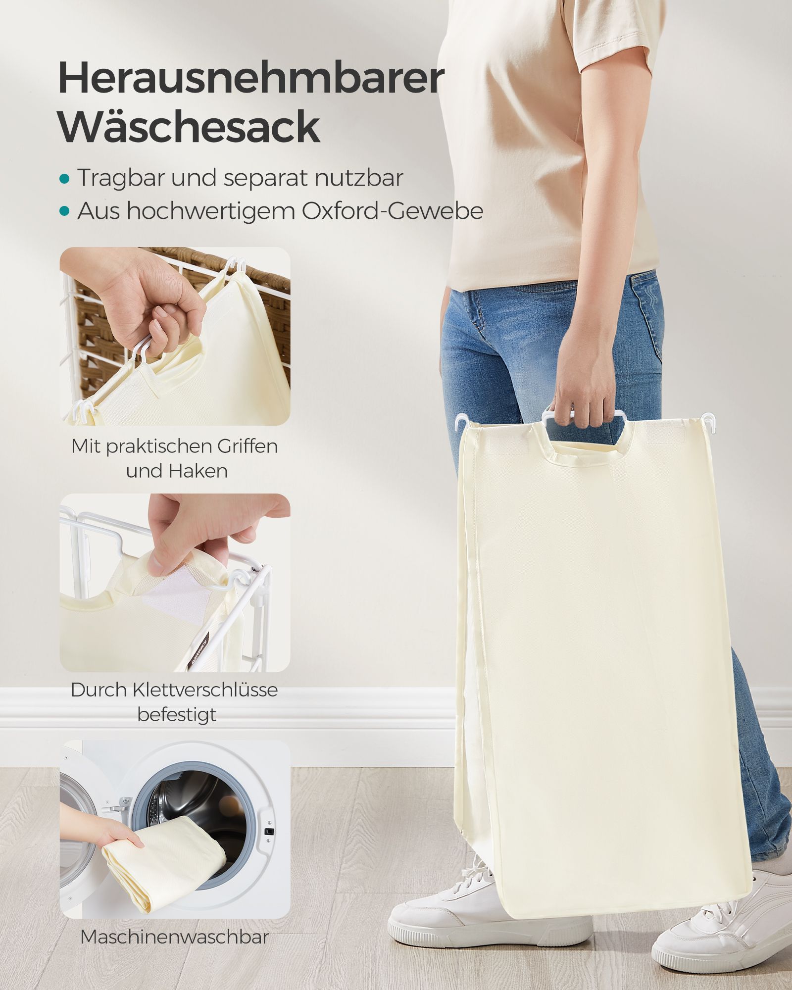 SONGMICS laundry basket 110 L, laundry collector with casters, removable laundry bag, 2 inner bags, laundry trolley with lid, 57 x 33 x 65 cm, for laundry room