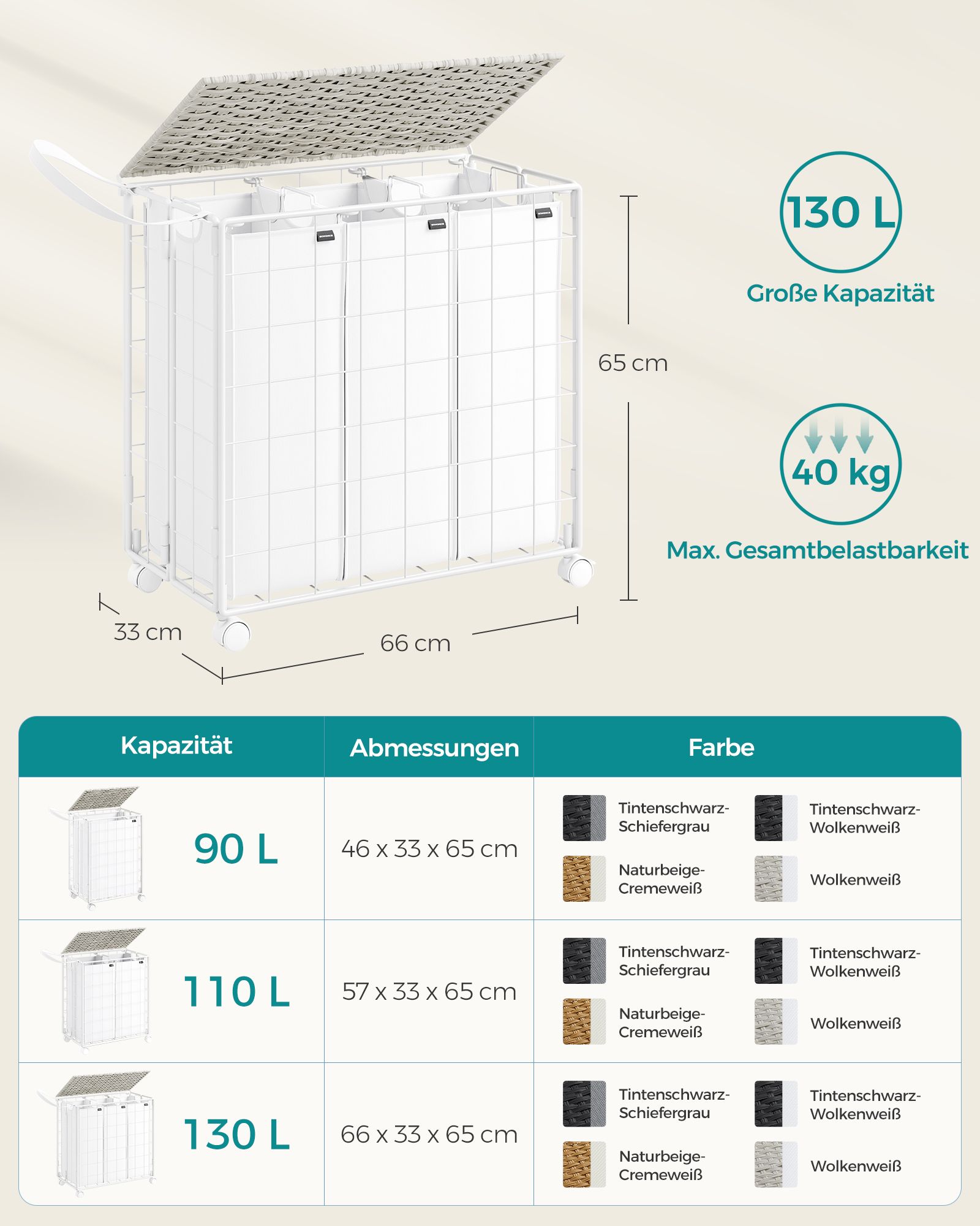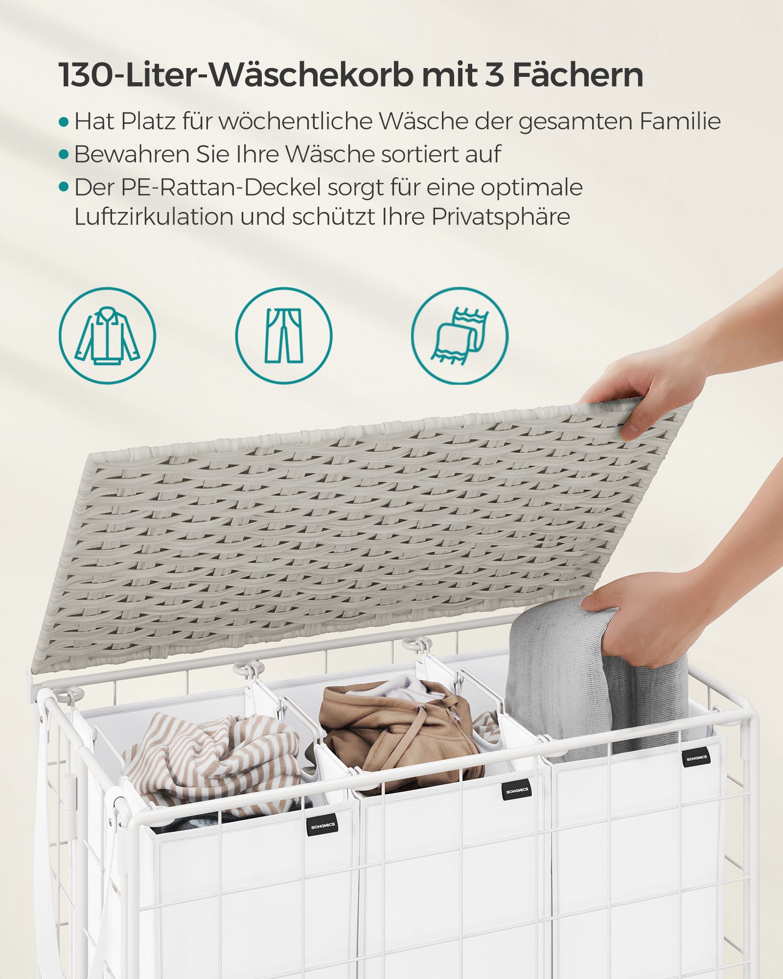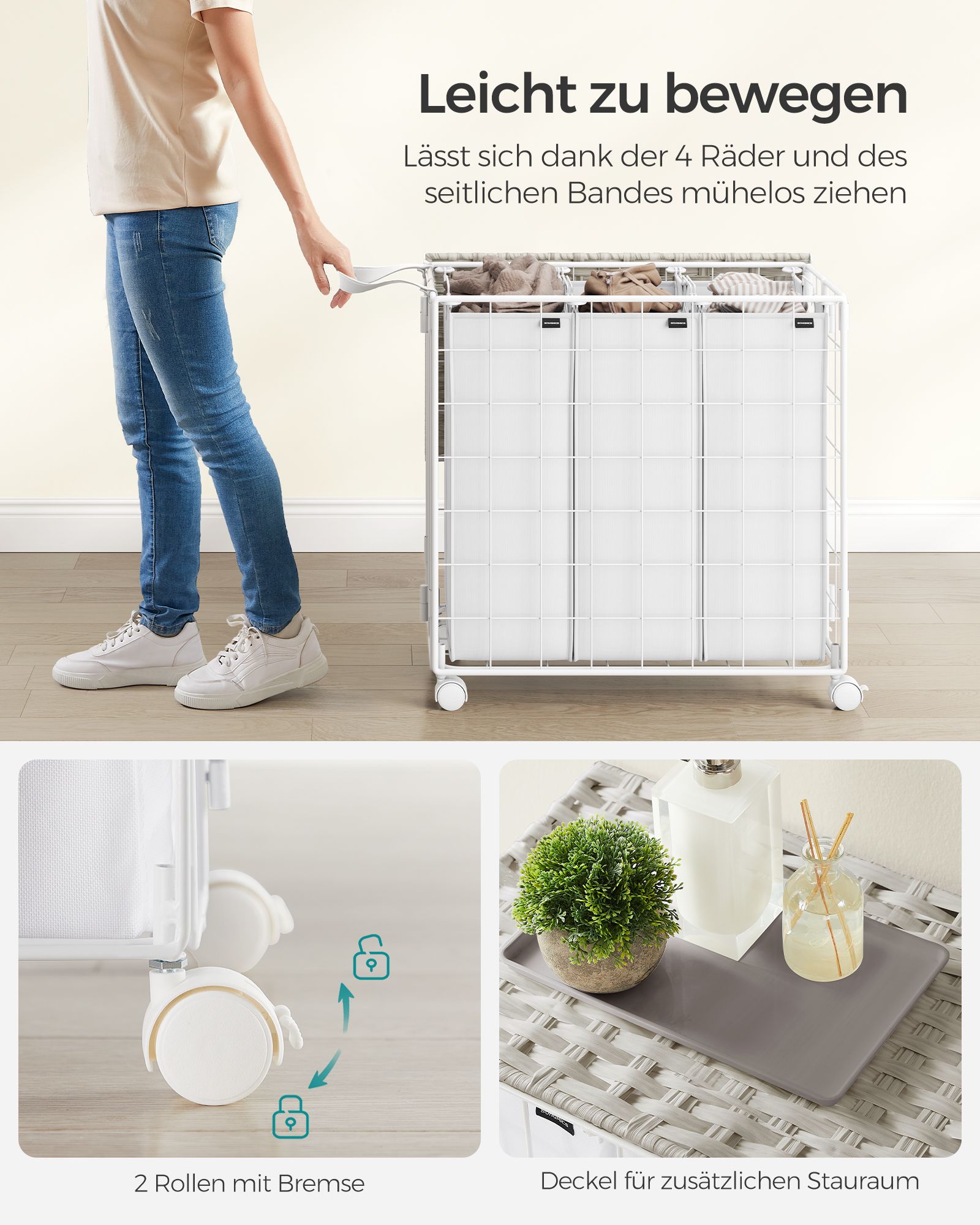 SONGMICS laundry basket 110 L, laundry collector with casters, removable laundry bag, 2 inner bags, laundry trolley with lid, 57 x 33 x 65 cm, for laundry room