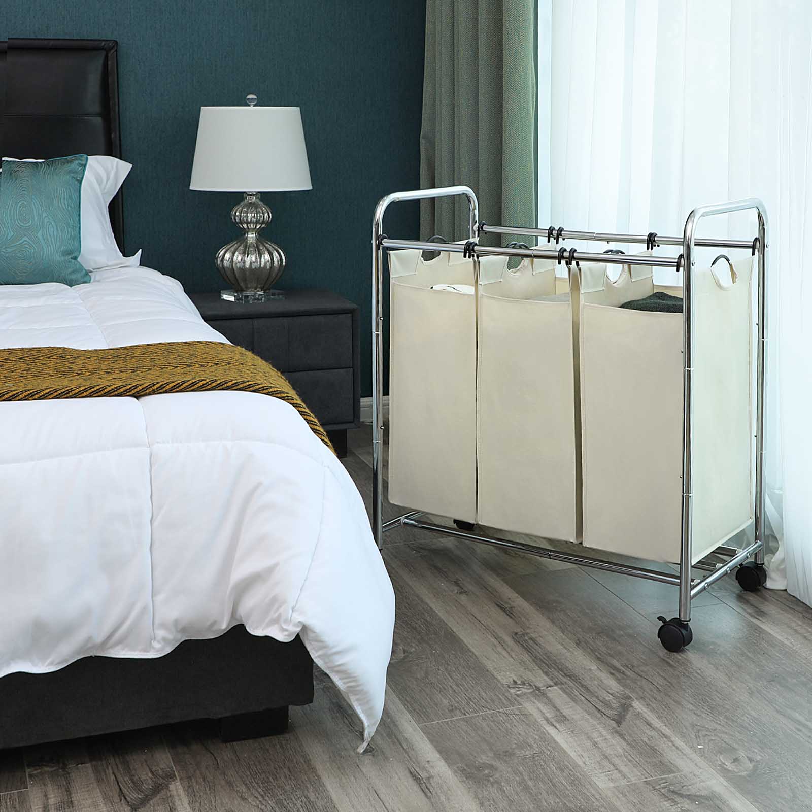 It usually takes too long to collect a sufficient amount of dark and light laundry. Still haven’t found the perfect container that is super spacious and sortable so that your dirty laundry can be separated and neatly collected? The Songmics super spacious laundry trolley, which has 3 pockets for efficient laundry organization, can eliminate unsightly piles of laundry on the floor. The laundry trolley is small in size but has plenty of storage space, making it suitable for any room, such as the living room, bedroom, and bathroom. not only can you put laundry and towels in it, but you can also store toys and magazines in it. Notes: – Please read the care label before washing the laundry bags. Do not put wet laundry in the bags. And please protect the product from high temperatures and direct sunlight.- The laundry bags may smell “new” when unpacked. This smell will disappear after washing and airing. Chrome-plated metal frame, side tube Ø 22 mm, tube Ø in the middle 19 mm. This sturdy laundry trolley, constructed from reinforced rods, combines good stability under heavy loads with high rust resistance. The rods with locking springs allow for easy and time-saving assembly. The lower frame is secured by 3 crossbars, making the entire trolley robust and stable. Product details: – Material: chrome-plated iron tube, bag made of 600 D polyester, Casters – Color: silver (frame), beige (laundry bag) – Product dimensions: 77 x 81.5 x 41 cm (W x H x D) – Bag dimensions: 34 x 55 x 24 cm (W x H x D) – Net weight: 4.7 kg – Gross weight: 5.0 kg