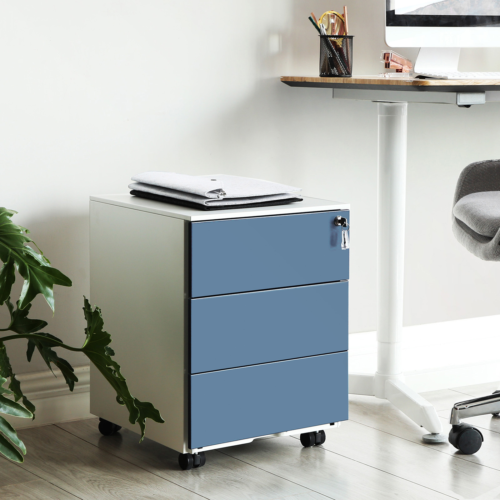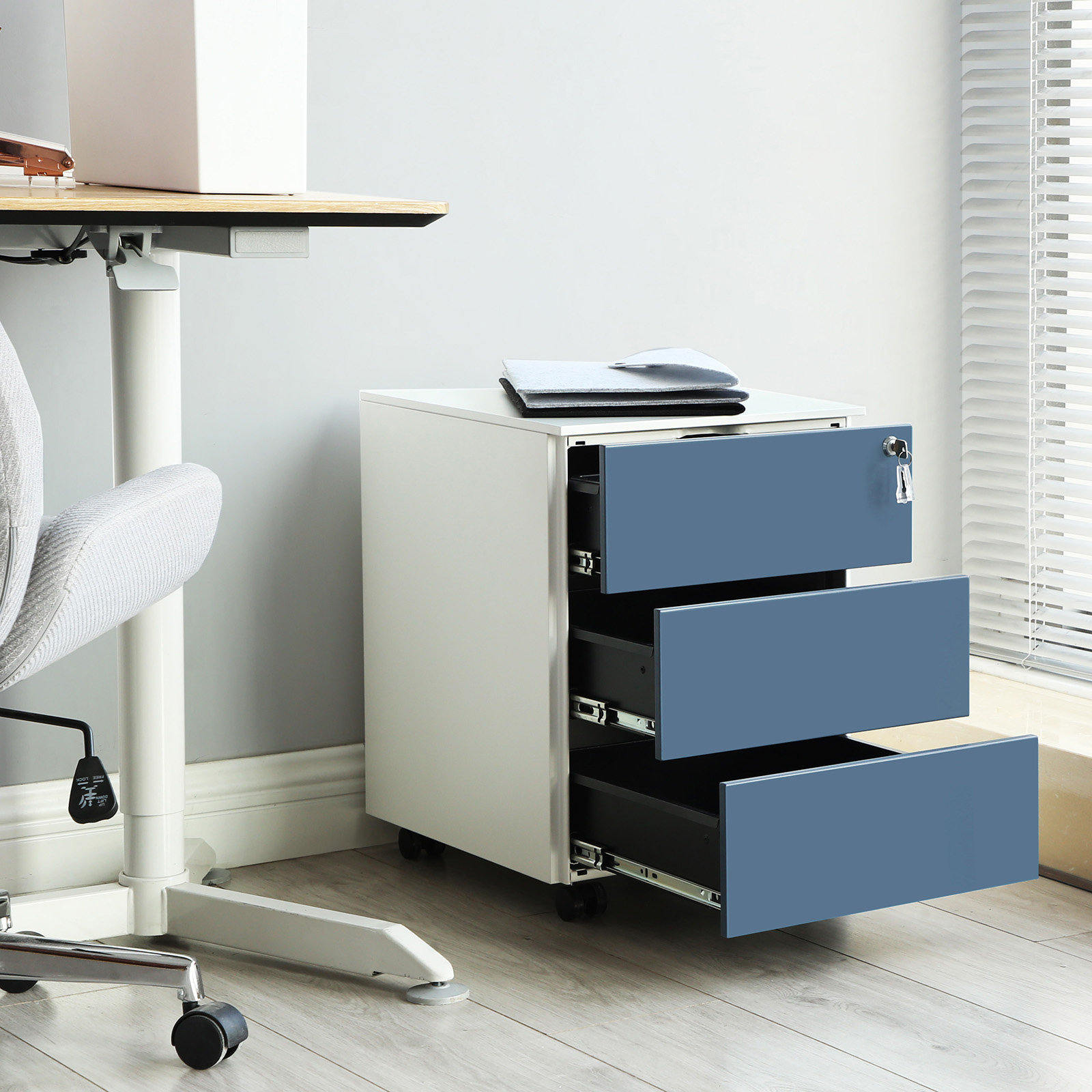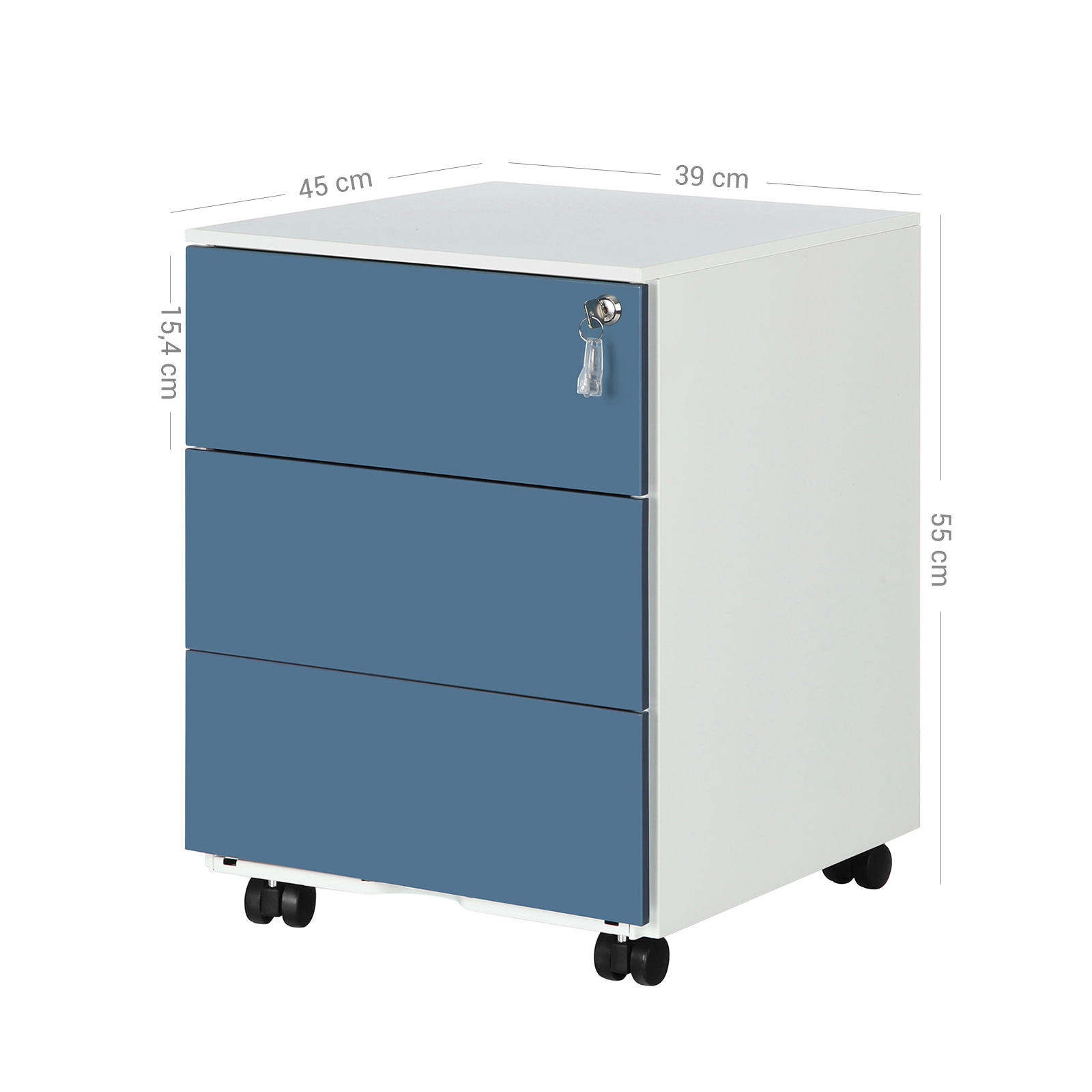 3 spacious drawersIf your desk is always piled high with files, it soon becomes impossible to work efficiently. Store important documents in the spacious drawers of this rolling cabinet so you can finally see the surface of your computer desk again.Freely movableThis cabinet has 4 casters, 2 of which are lockable, so you can move it to any location. Lock the casters if you only want to use the cabinet in one place. LockableThis allows you to store important documents securely, even in offices that are accessible to everyone. If you work from home, the lock protects your files from curious children.Product details: Color: White-blue Material: Steel Size: 39 x 45 x 55 cm (L x W x H) Weight: 16 kg Max. static load capacity per drawer: 15 kg Scope of delivery: 1 x rolling container with 3 drawers 1 x container with accessories 1 x instructions (DE, EN, IT, FR, ES)