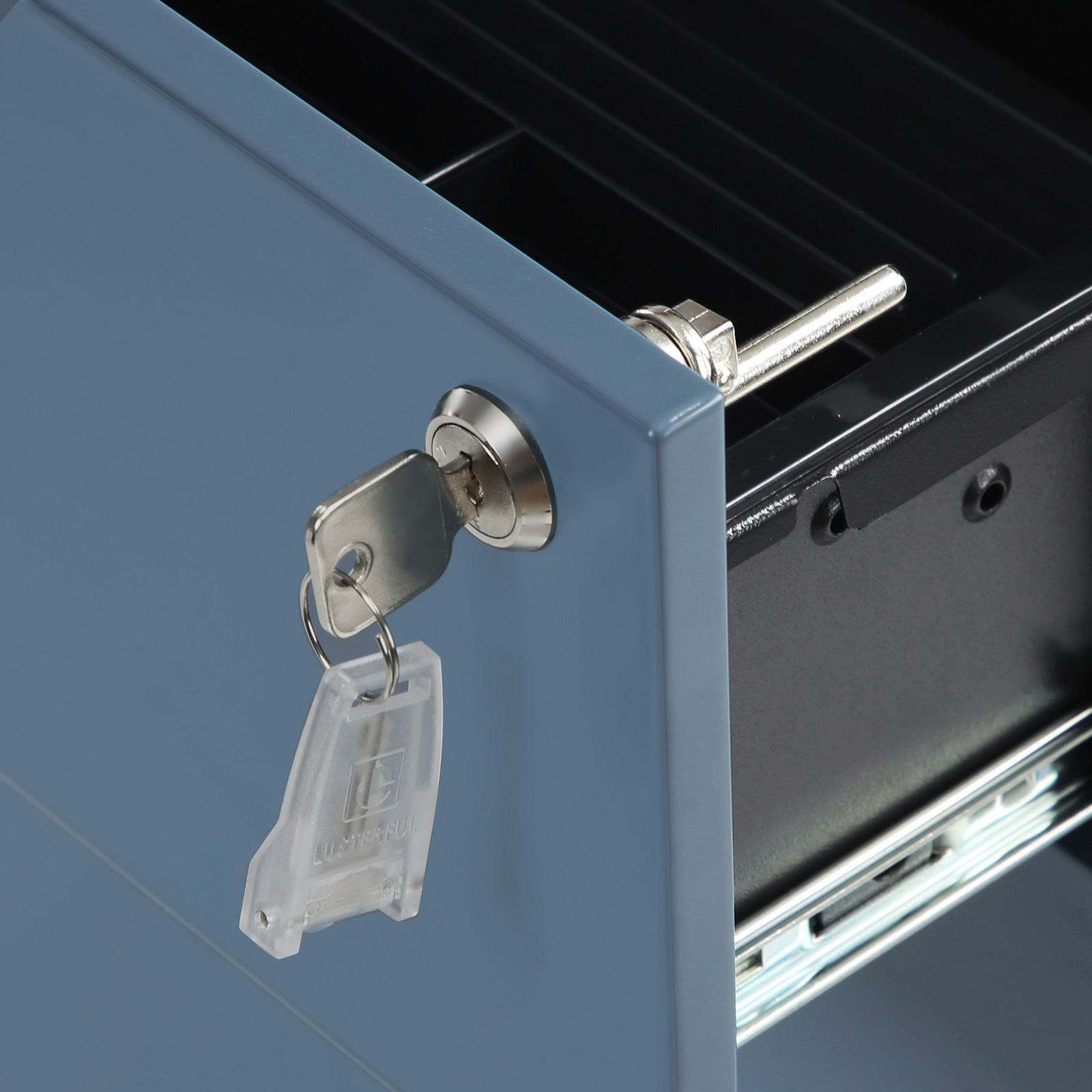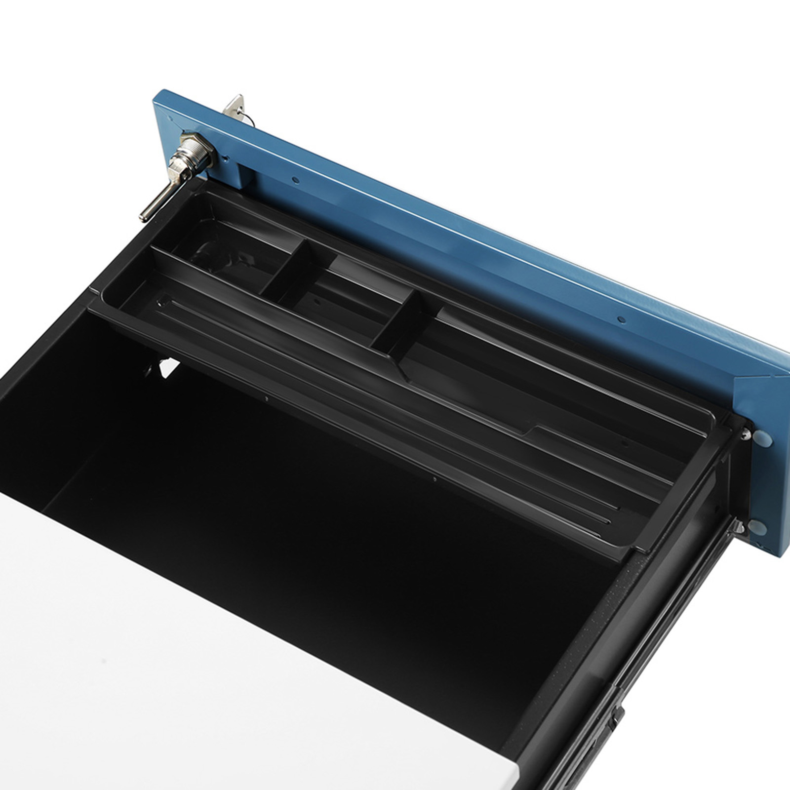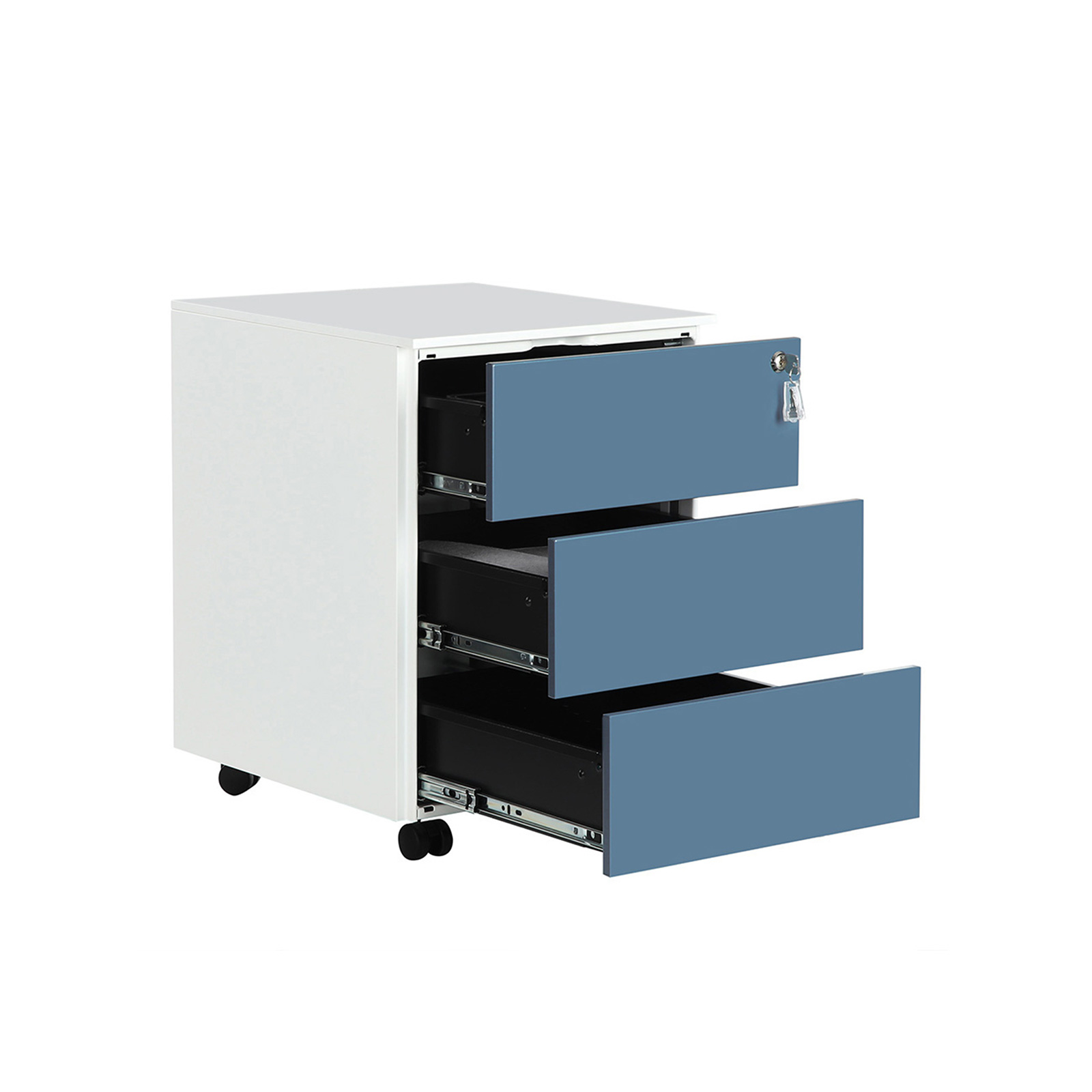 3 spacious drawersIf your desk is always piled high with files, it soon becomes impossible to work efficiently. Store important documents in the spacious drawers of this rolling cabinet so you can finally see the surface of your computer desk again.Freely movableThis cabinet has 4 casters, 2 of which are lockable, so you can move it to any location. Lock the casters if you only want to use the cabinet in one place. LockableThis allows you to store important documents securely, even in offices that are accessible to everyone. If you work from home, the lock protects your files from curious children.Product details: Color: White-blue Material: Steel Size: 39 x 45 x 55 cm (L x W x H) Weight: 16 kg Max. static load capacity per drawer: 15 kg Scope of delivery: 1 x rolling container with 3 drawers 1 x container with accessories 1 x instructions (DE, EN, IT, FR, ES)