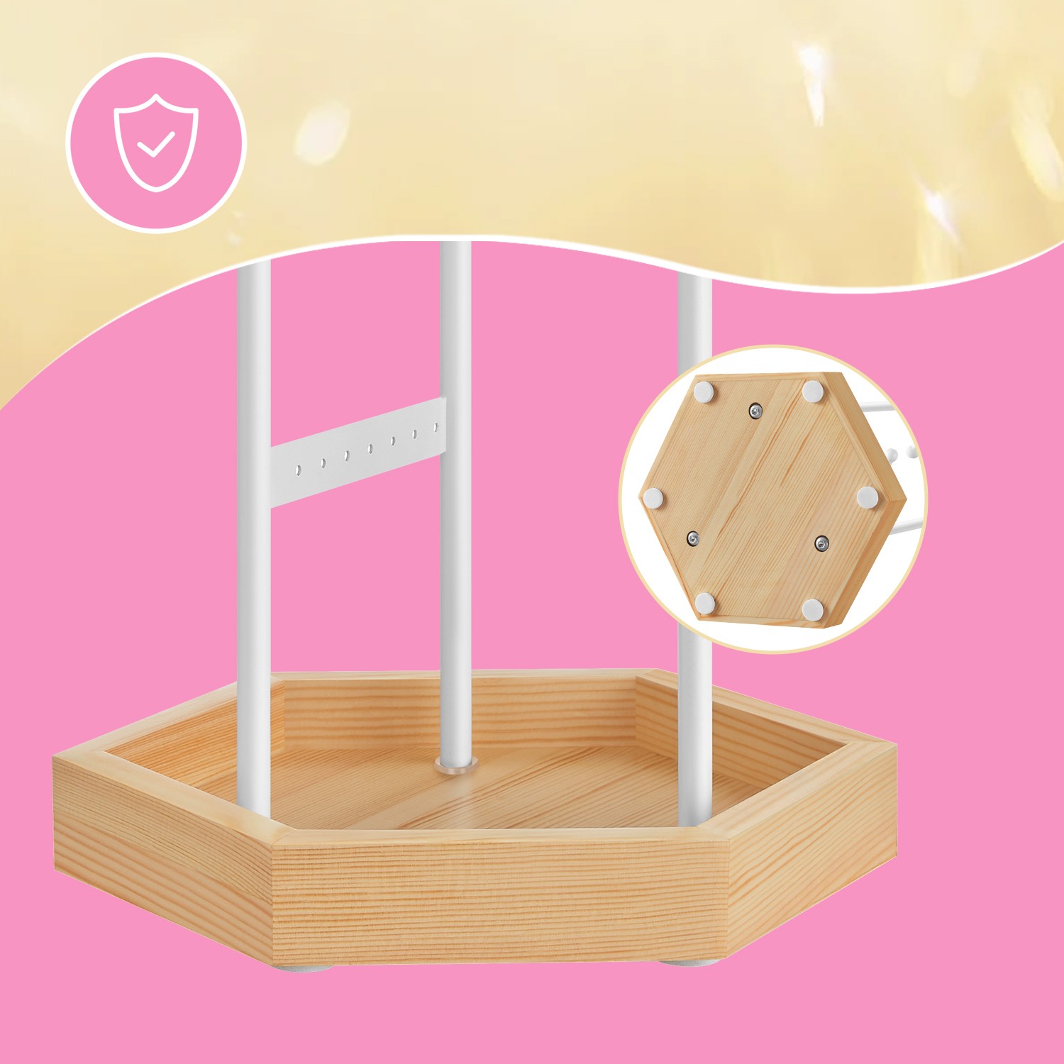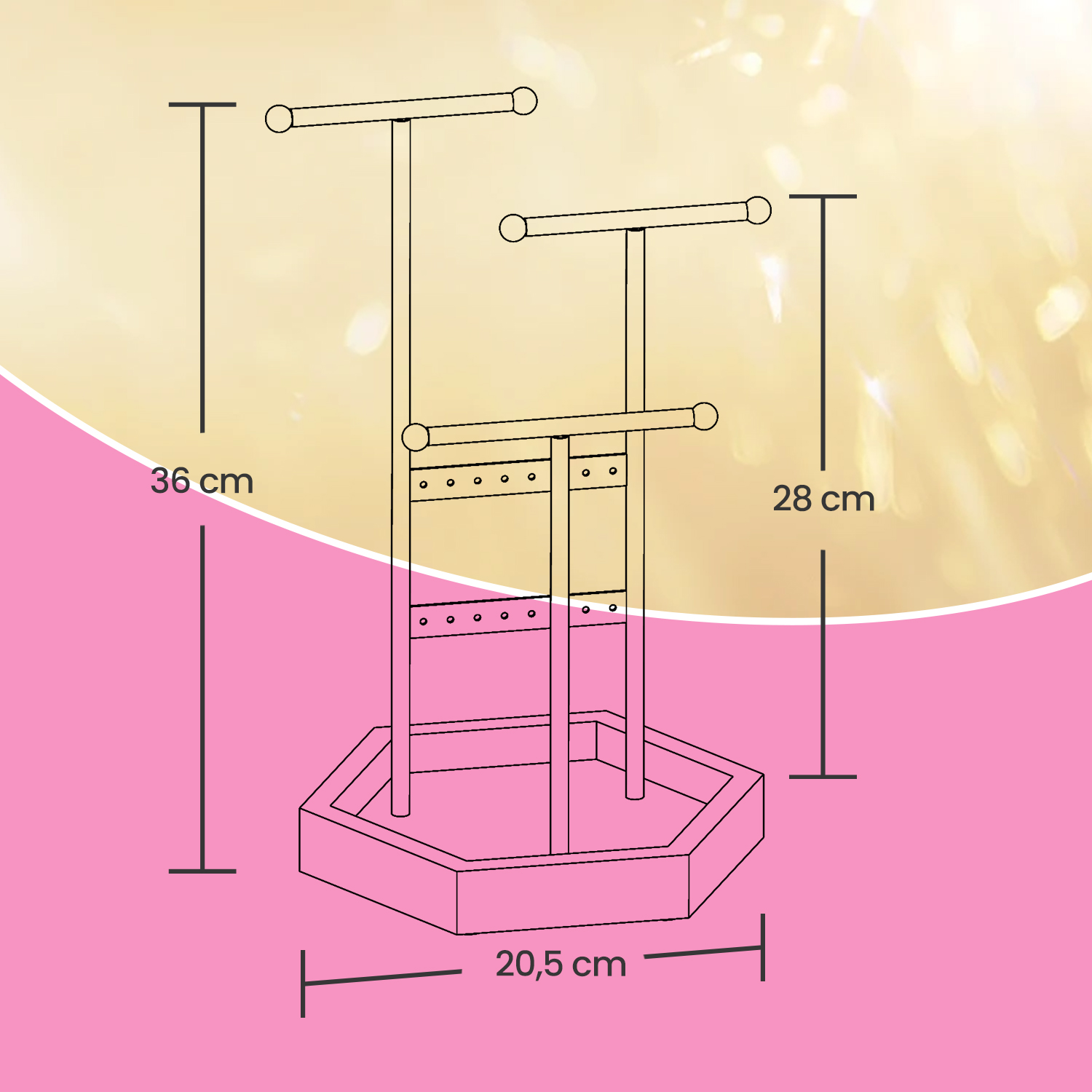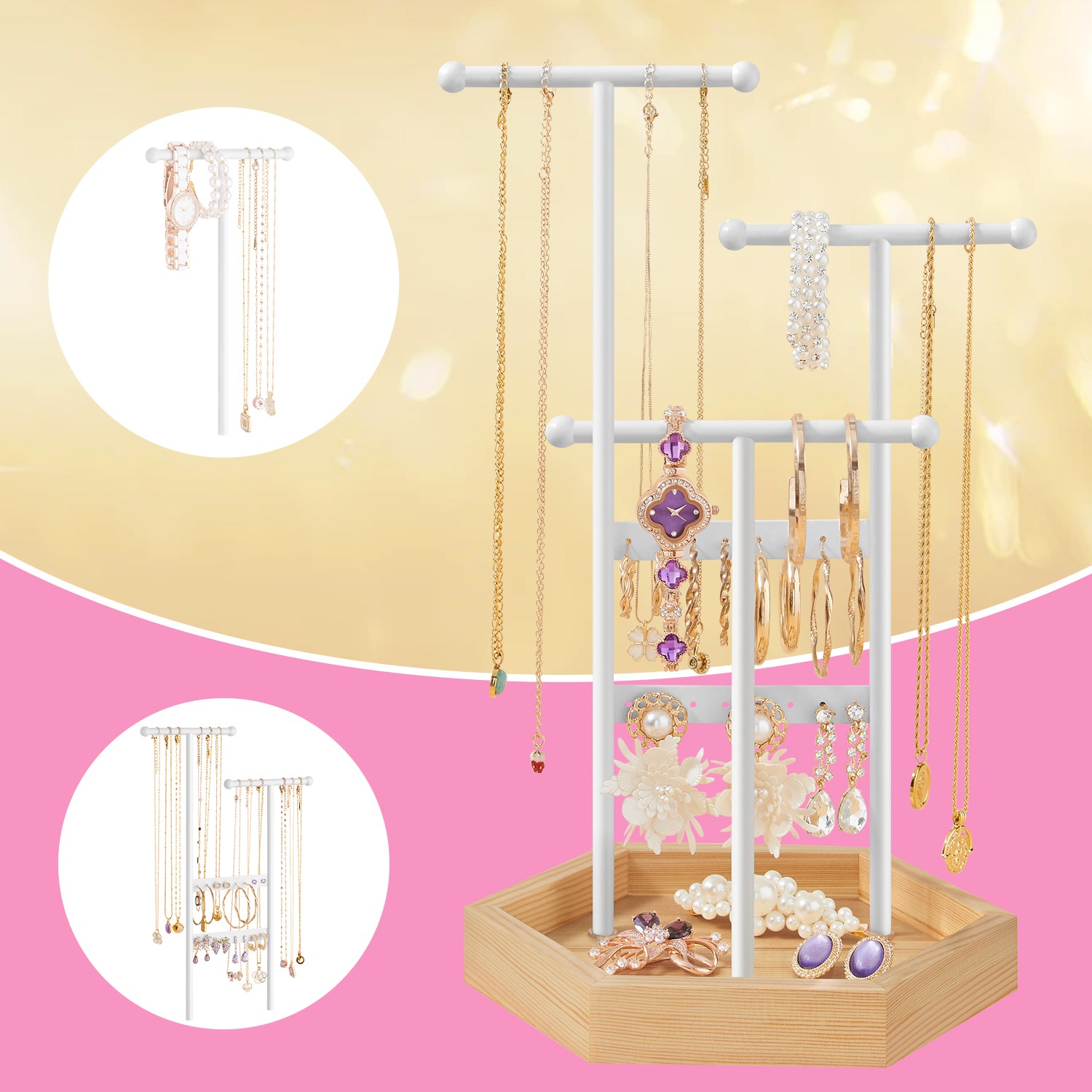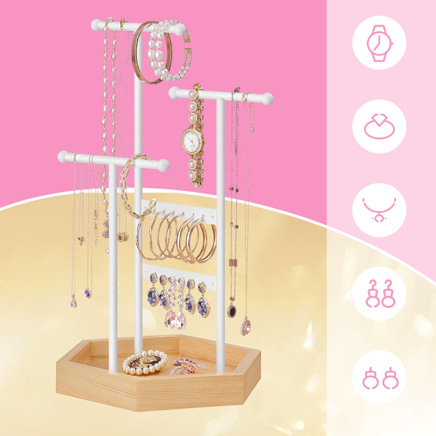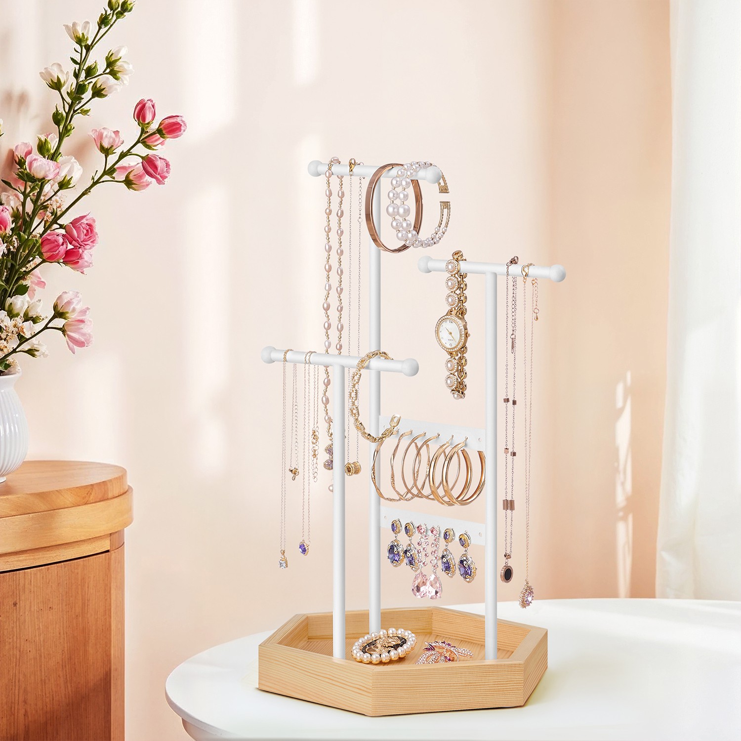 Organize your jewelry effortlessly: No more rummaging through messy drawers or boxes for your jewelry! Keep it visible, well-organized, and easily accessible with this SONGMICS jewelry stand. Practical and decorative jewelry holder: 3 rods and 2 sticks offer plenty of space, and the ball ends prevent jewelry from slipping off. The rods can be rotated for easy access. The combination of white and natural wood colors creates an aesthetic piece of jewelry. Ideal for private and commercial use: This jewelry tree can store your necklaces, bracelets, earrings, stud earrings, and rings at home. But it also works just as well as a display stand in a store or salon.Product details: Color: white, natural Material: iron frame, solid wood base Dimensions: 20.5 x 18 x 36 cm Weight: 0.51 kg Scope of delivery: 1 x jewelry stand SONGMICS notes: Place the rods and seal in the correct position and then tighten the screws. Excessive force may damage the wooden base. The iron frame may become deformed during transport, but you can adjust it manually. Do not place the product in damp locations to prevent deformation.