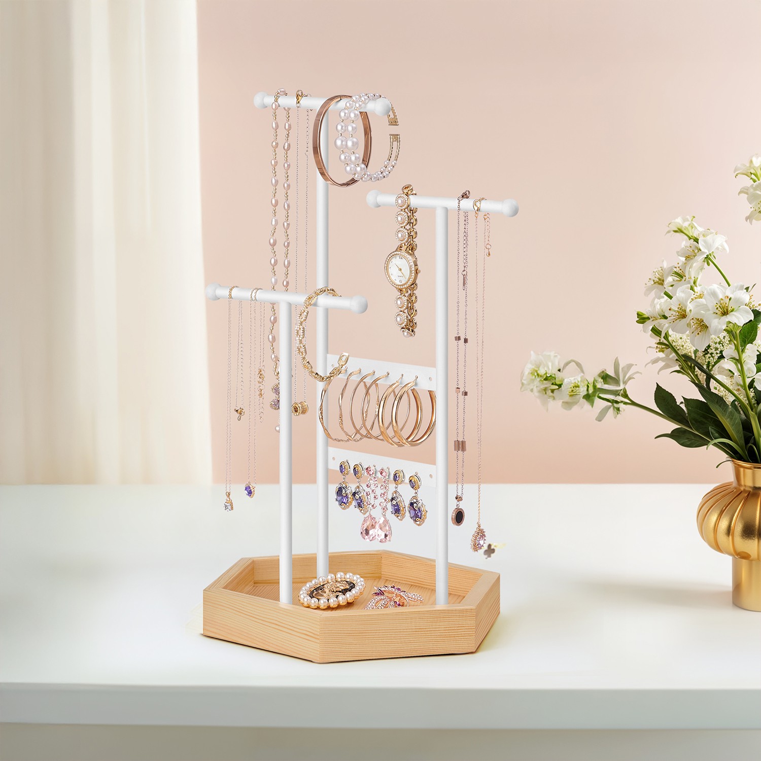 SONGMICS Metal and Wood Jewelry Holder, White