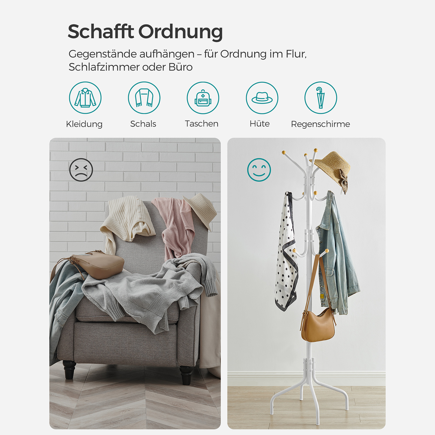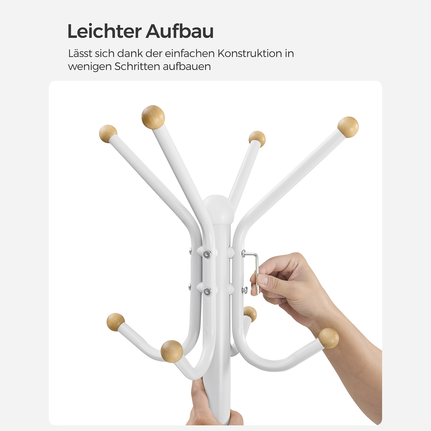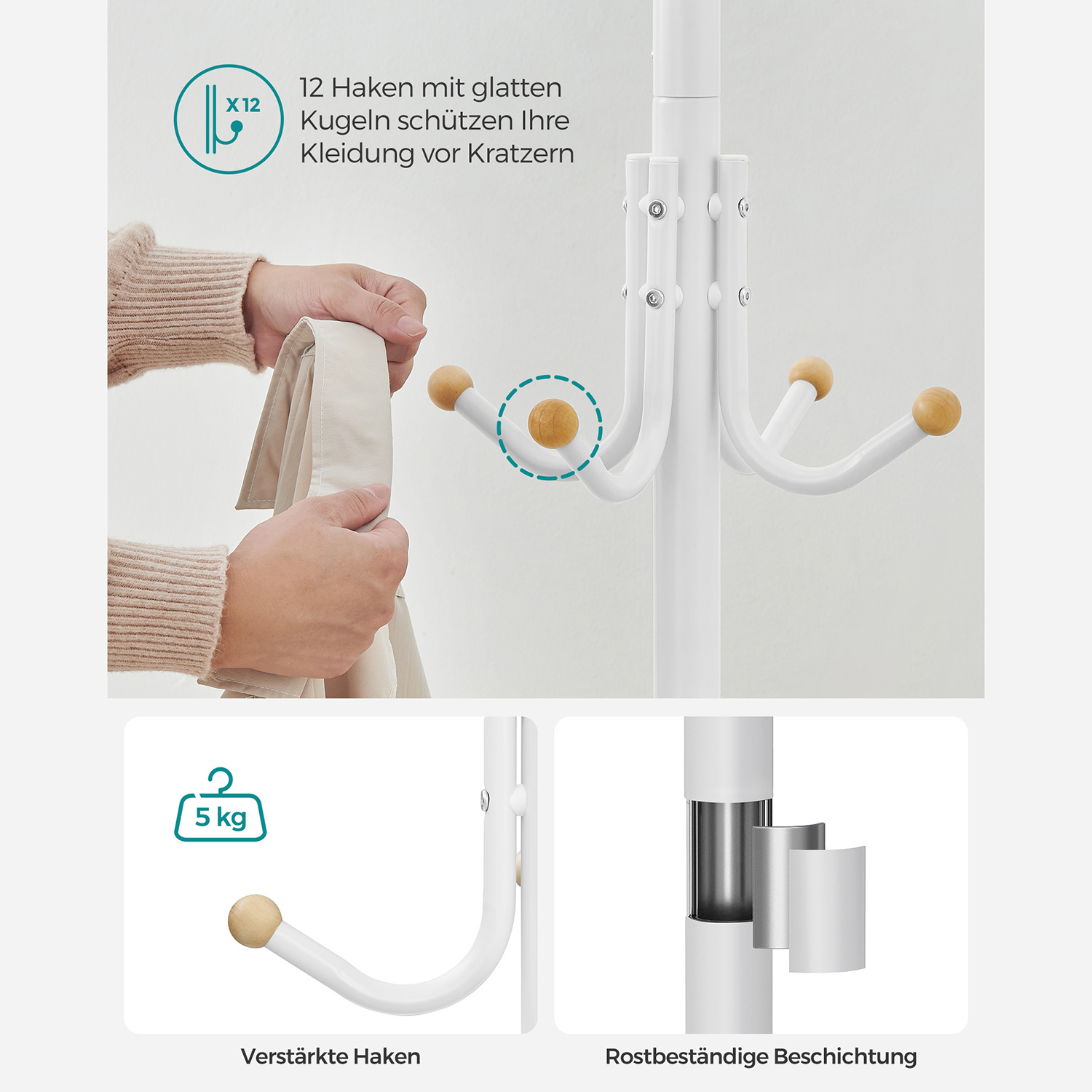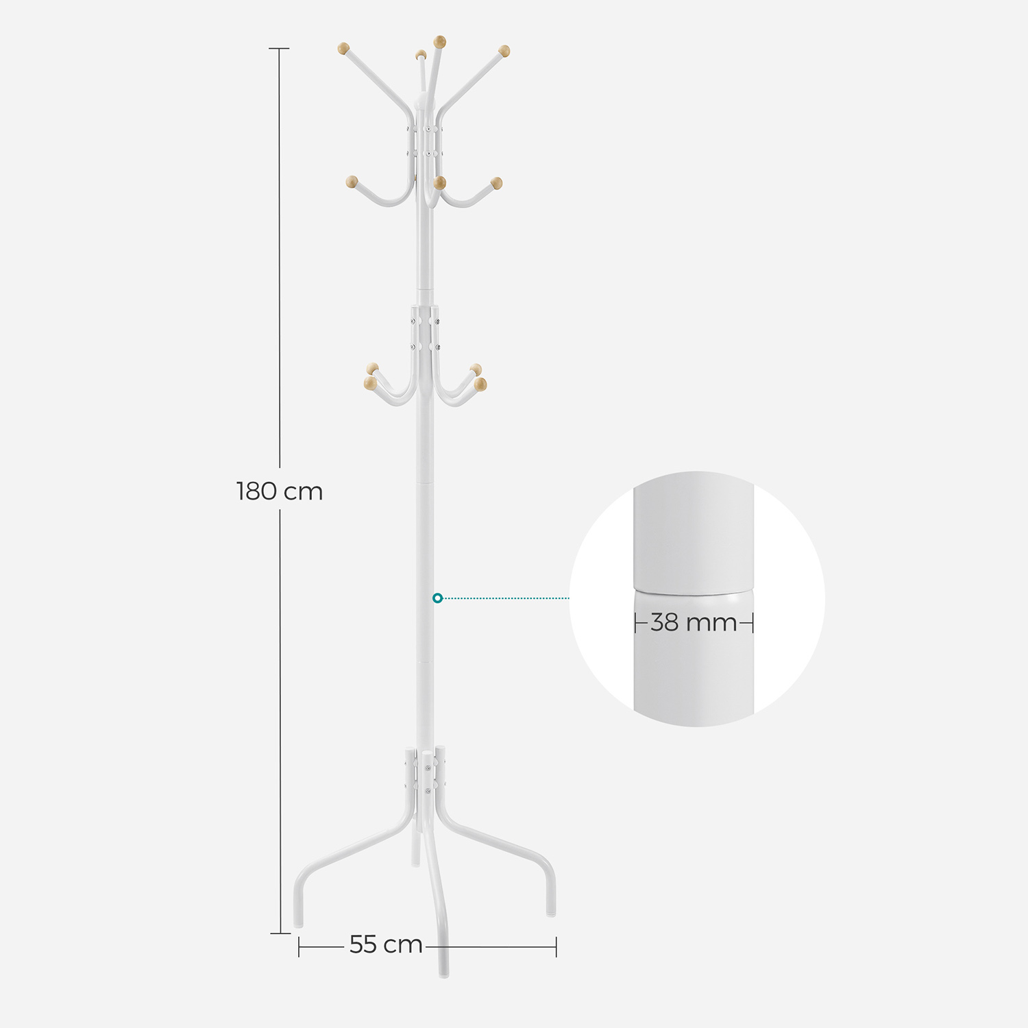 Product details: Color: White Material: Steel Size: 55 x 55 x 180 cm (W x H x D) Weight: 2.8 kg Max. static load capacity per hook: 5 kg Scope of delivery: 1 x coat rack 1 x accessory pack 1 x instructions SONGMICS notes:For safety reasons, children are not allowed to climb on or play with the coat rack.