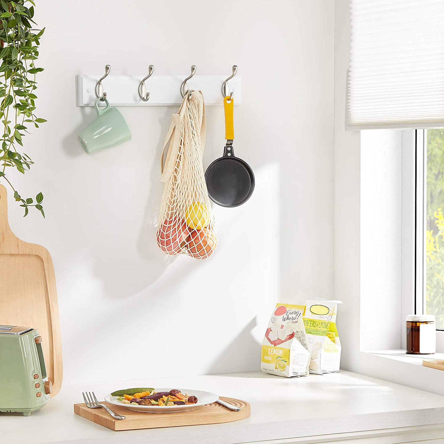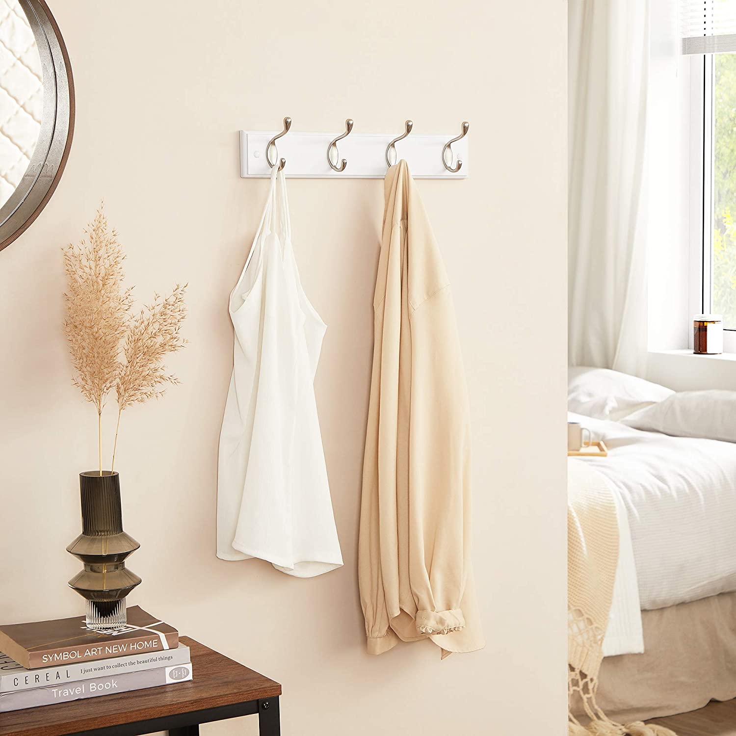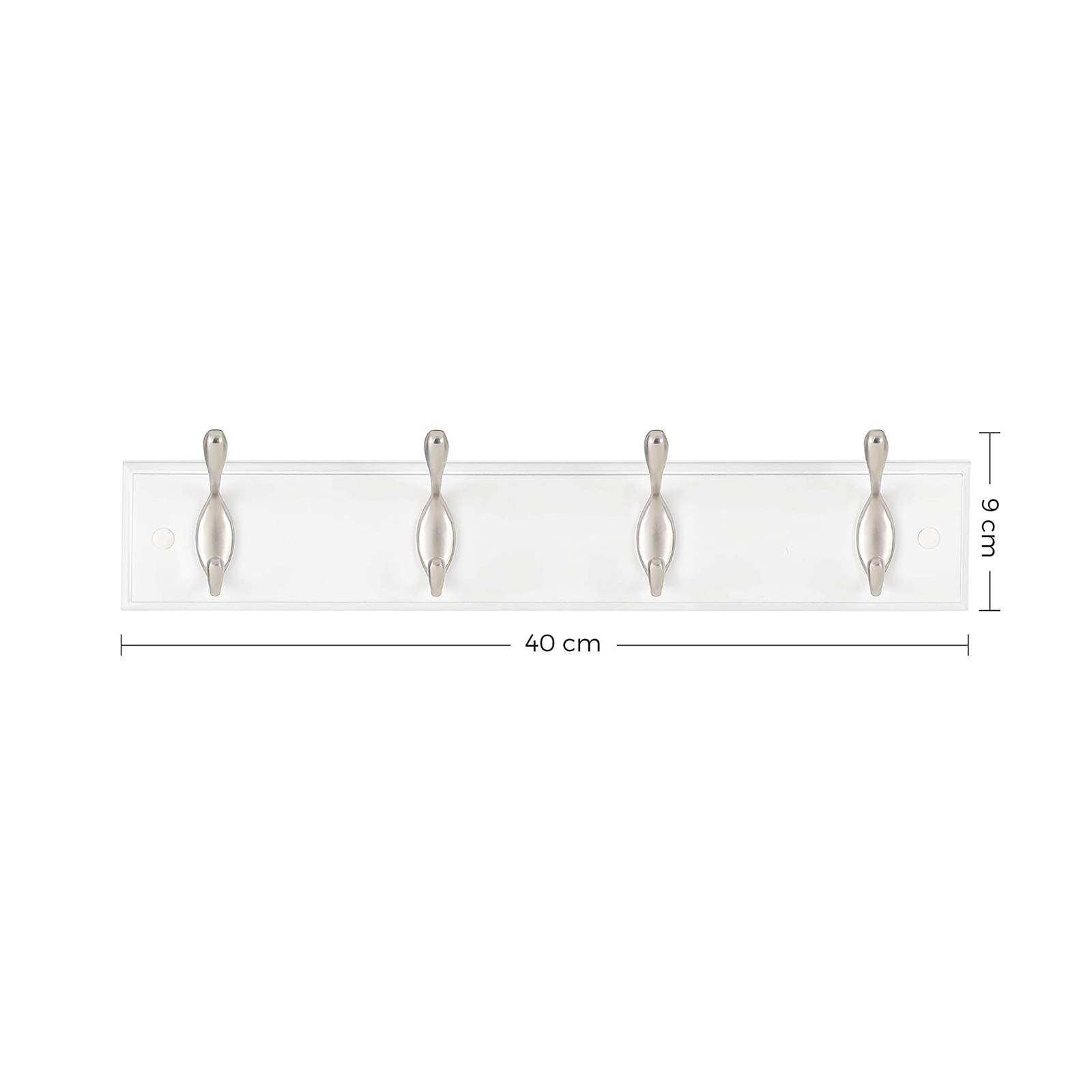 Does this sound familiar? Door handles covered with coats and scarves. Chairs piled high with bags and hats. Towels lying on the floor. Your keys have mysteriously disappeared again… Does this ring a bell? No problem! This wall coat rack from SONGMICS will help you tidy up your home. No more messy piles of clothes! This coat rack is equipped with 4 double metal hooks, giving you 8 hanging options for jackets, hats, bags, and keys. This means that your chairs and armchairs will no longer be besieged by piles of clothes in the future. Good habits make everyday life easier: with this coat rack, you can get into the habit of always hanging up your clothes neatly. Teach this to your children too. This way, they will learn to tidy up at an early age and will most likely not have to search for their keys later on. Product details: Color: White-silver Material: MDF (medium-density fiberboard), Zinc alloy Size: 40 x 9 x 7 cm (L x W x H) Weight: 0.5 kg Max. static load capacity: 15.9 kg Scope of delivery: 1 x wall coat rack 1 x accessory pack 1 x instructions SONGMIX Notes: Please do not use this product outdoors and protect it from rain.Please install this product on a solid wall or wooden post to ensure the stability and load capacity of the wall coat rack.