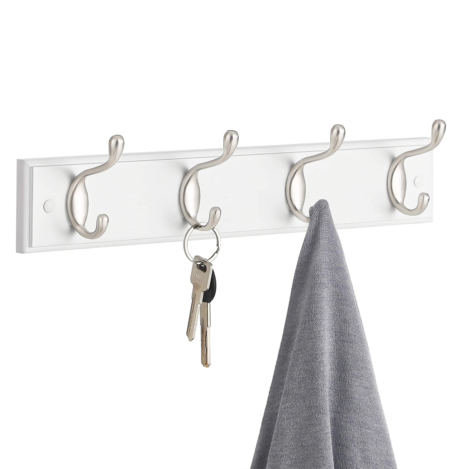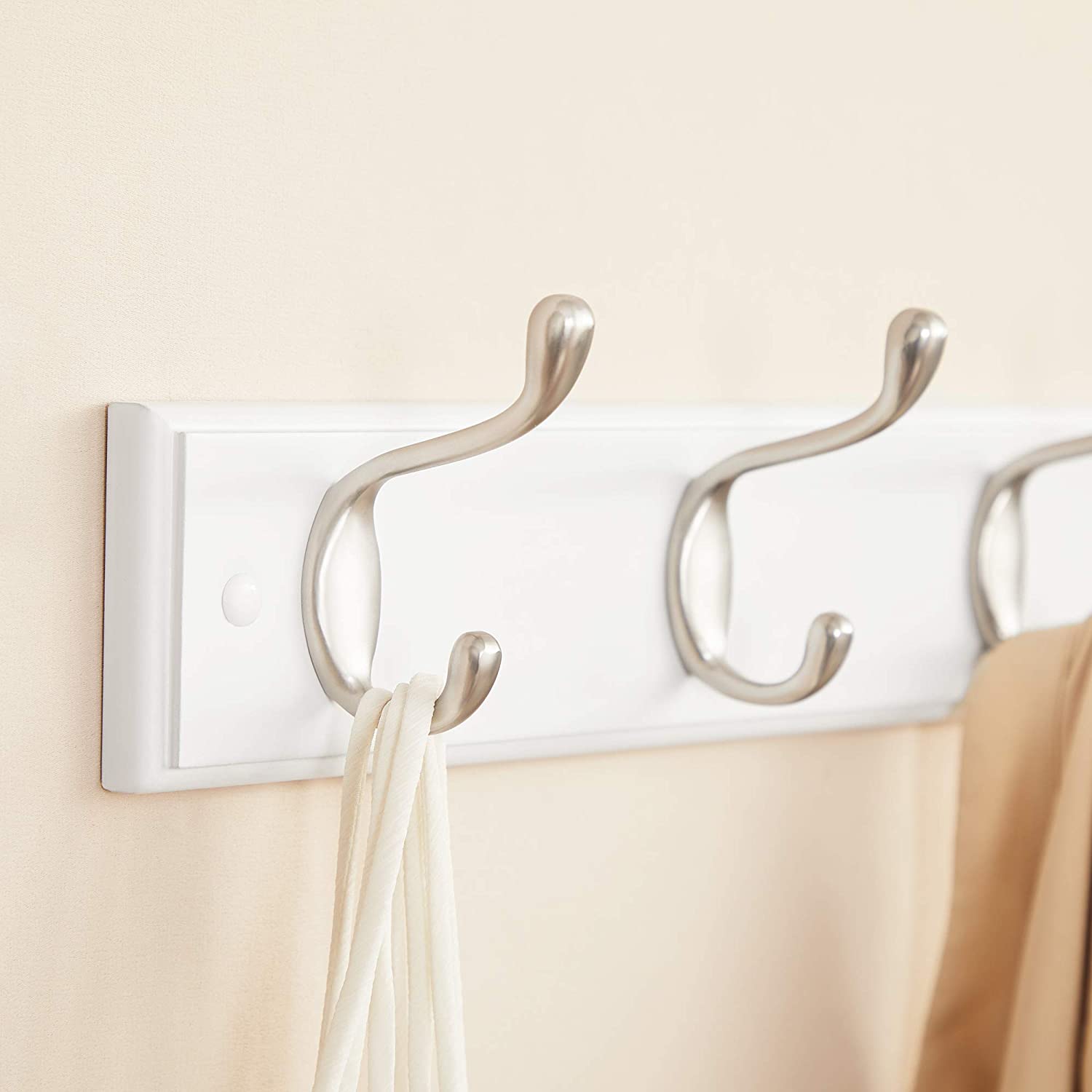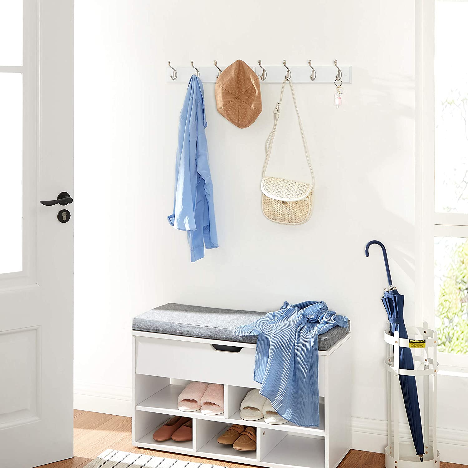 Does this sound familiar? Door handles covered with coats and scarves. Chairs piled high with bags and hats. Towels lying on the floor. Your keys have mysteriously disappeared again… Does this ring a bell? No problem! This wall coat rack from SONGMICS will help you tidy up your home. No more messy piles of clothes! This coat rack is equipped with 4 double metal hooks, giving you 8 hanging options for jackets, hats, bags, and keys. This means that your chairs and armchairs will no longer be besieged by piles of clothes in the future. Good habits make everyday life easier: with this coat rack, you can get into the habit of always hanging up your clothes neatly. Teach this to your children too. This way, they will learn to tidy up at an early age and will most likely not have to search for their keys later on. Product details: Color: White-silver Material: MDF (medium-density fiberboard), Zinc alloy Size: 40 x 9 x 7 cm (L x W x H) Weight: 0.5 kg Max. static load capacity: 15.9 kg Scope of delivery: 1 x wall coat rack 1 x accessory pack 1 x instructions SONGMIX Notes: Please do not use this product outdoors and protect it from rain.Please install this product on a solid wall or wooden post to ensure the stability and load capacity of the wall coat rack.
