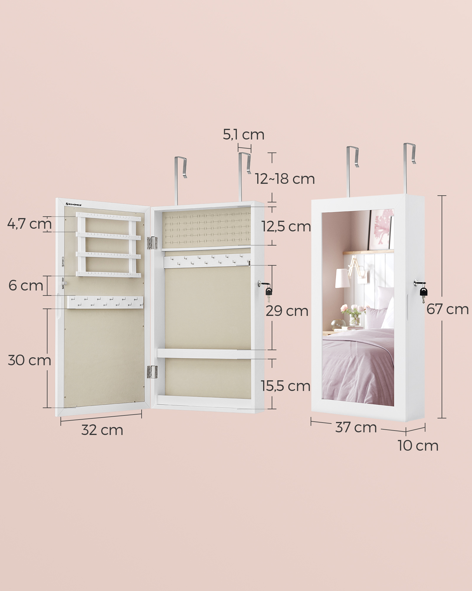 SONGMICS Jewelry cabinet, mirror cabinet, wall cabinet, lockable wall cabinet, space-saving jewelry organizer, vintage brown JJC051K01