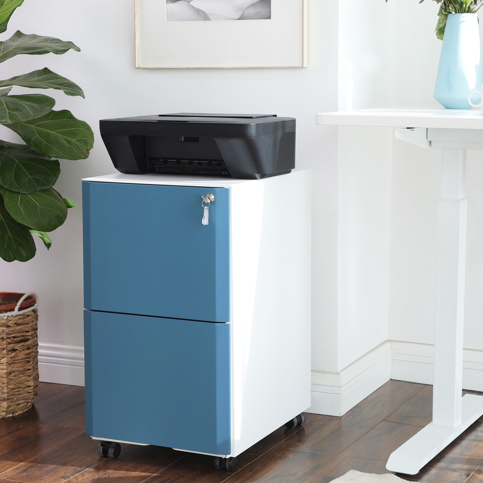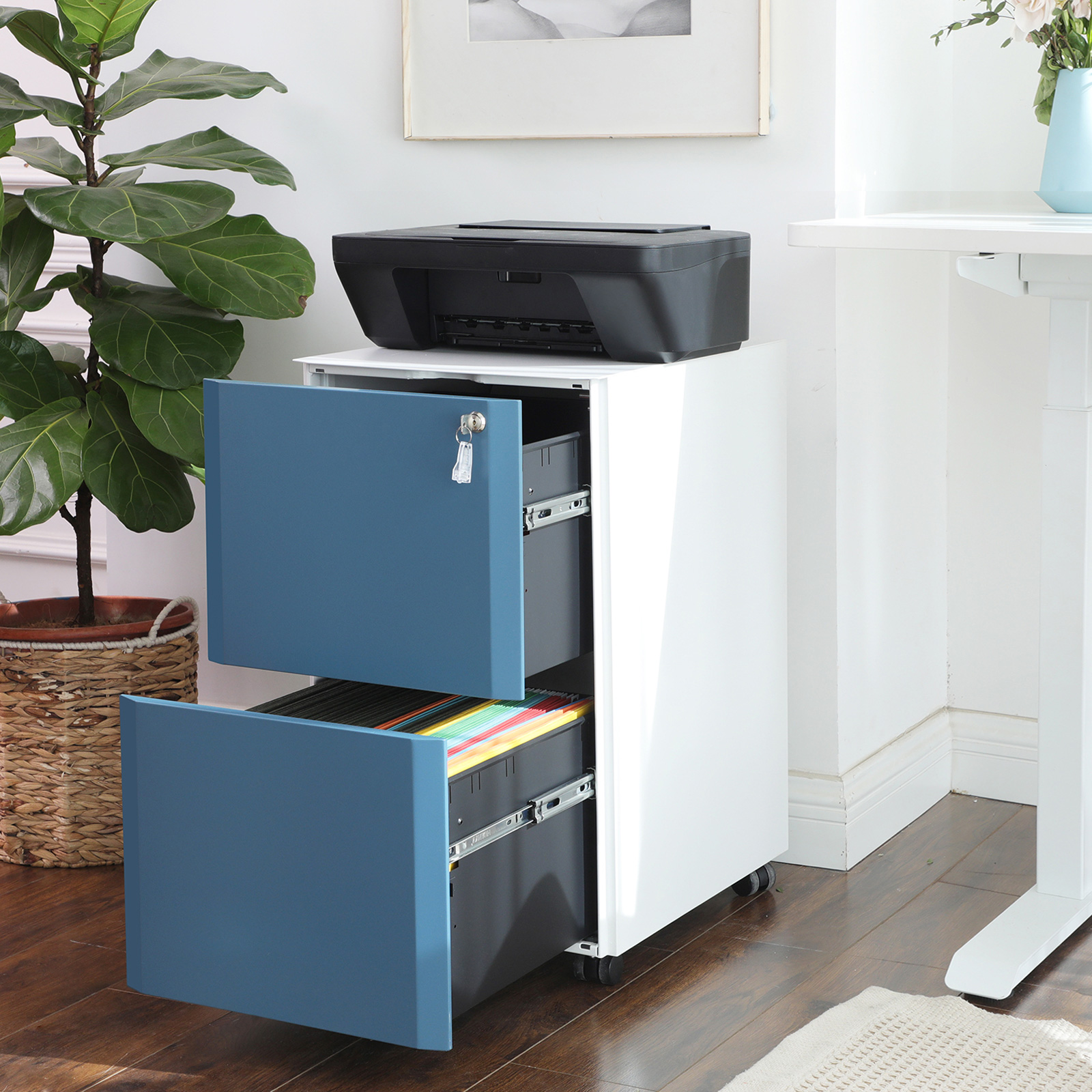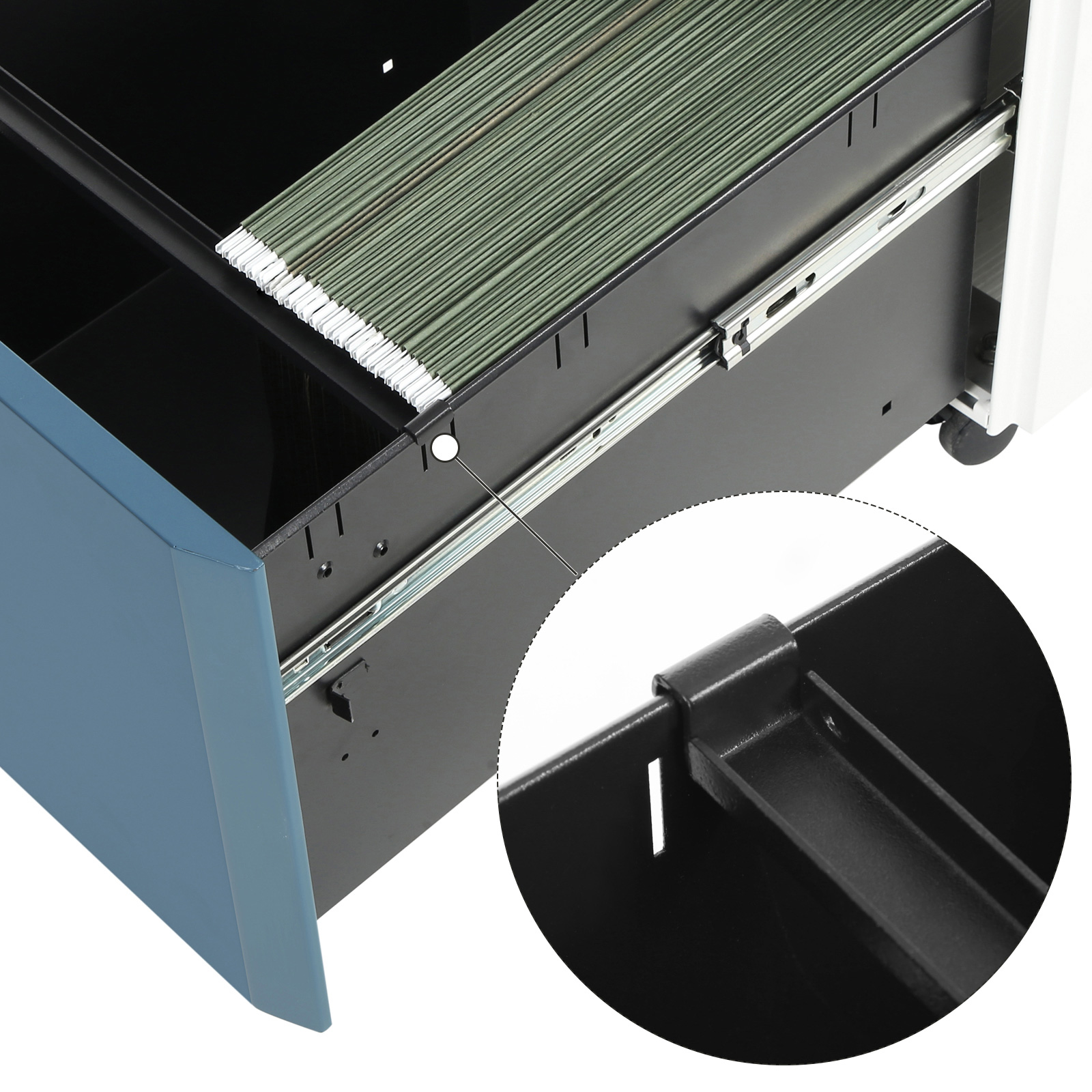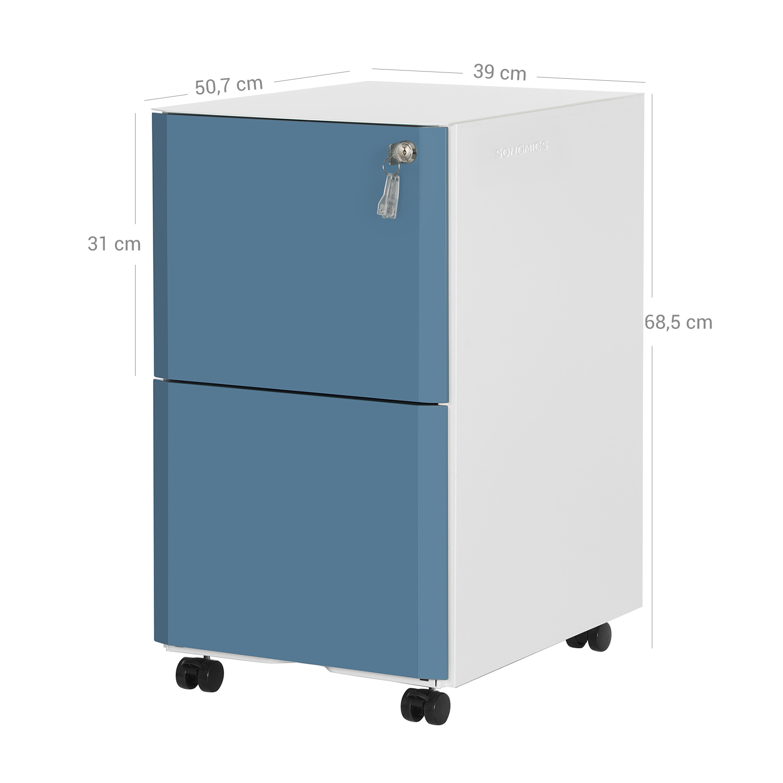 Suitable for various hanging files: Unlike conventional rolling containers, each drawer in our filing cabinet has 2 adjustable rods. This allows you to sort and store hanging files in various formats (A4, Letter, Legal, or F4) as needed.Robust and practical: Documents, stationery, personal items, simply everything you need at work has its own place in this rolling container. Each of the 2 large drawers can hold up to 23 kg and the full extension slides make them easier to open and close. The steel construction is also so sturdy that you can use this filing cabinet for many years to come. Are you looking for a practical, spacious chest of drawers to simplify your working life? Your search is over, because you’ve already found it! Product details: Color: White-blue Material: Steel Size: 39 x 50.7 x 68.5 cm (L x W x H) Weight: 20.2 kg Max. load capacity per drawer: 23 kg Scope of delivery: 1 x rolling container with 2 drawers 1 x accessory bag 1 x instructions (DE, EN, IT, FR, ES) SONGMICS Notes:Do not pull out the drawers of this product at the same time when there are items inside them. Risk of tipping!