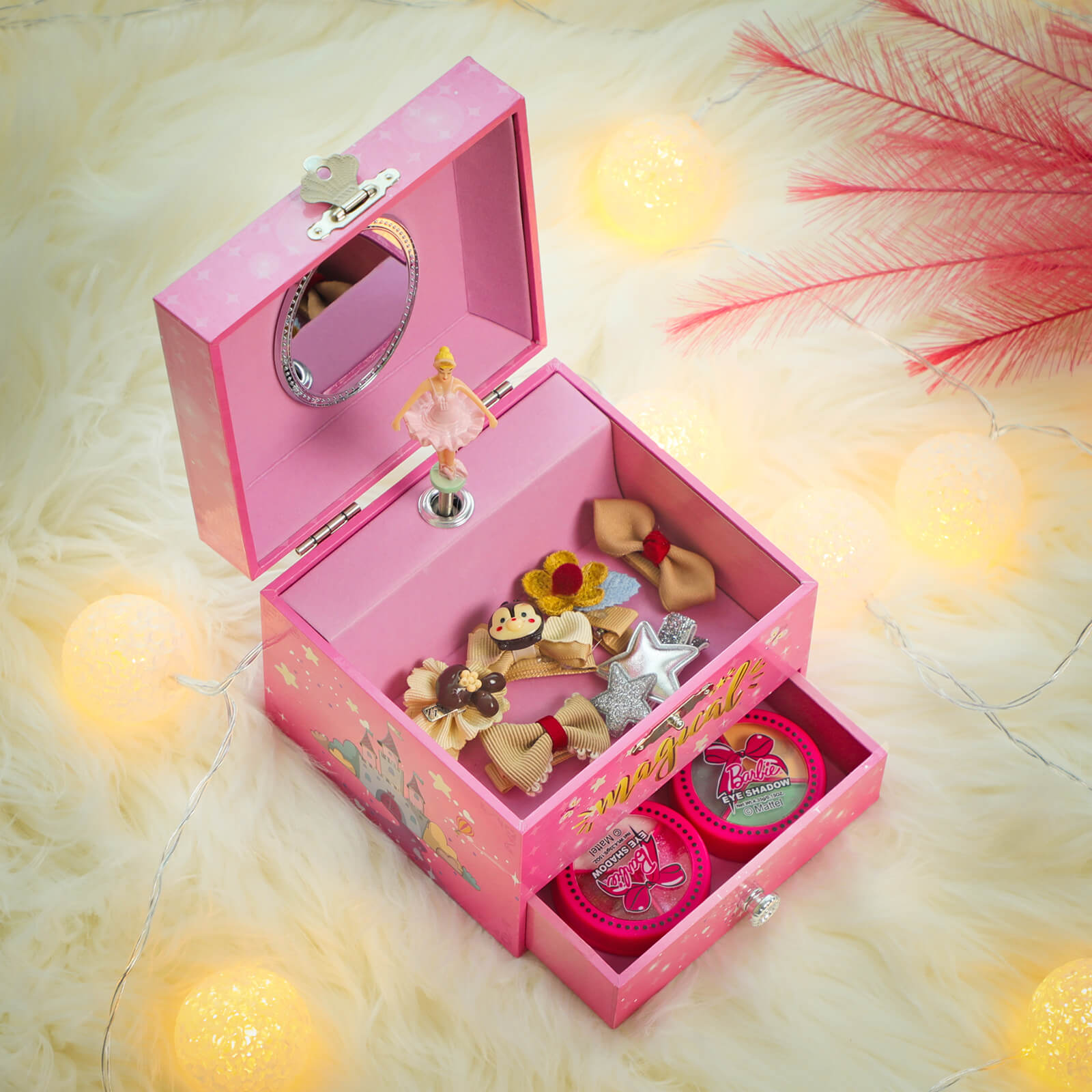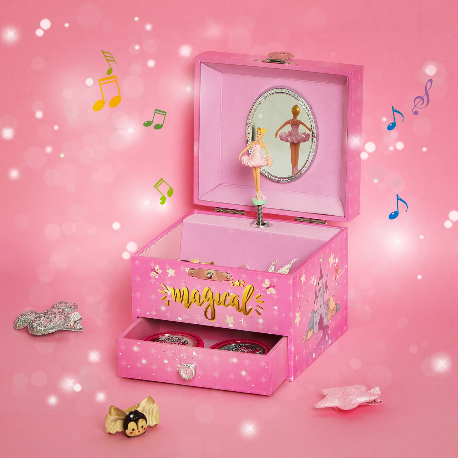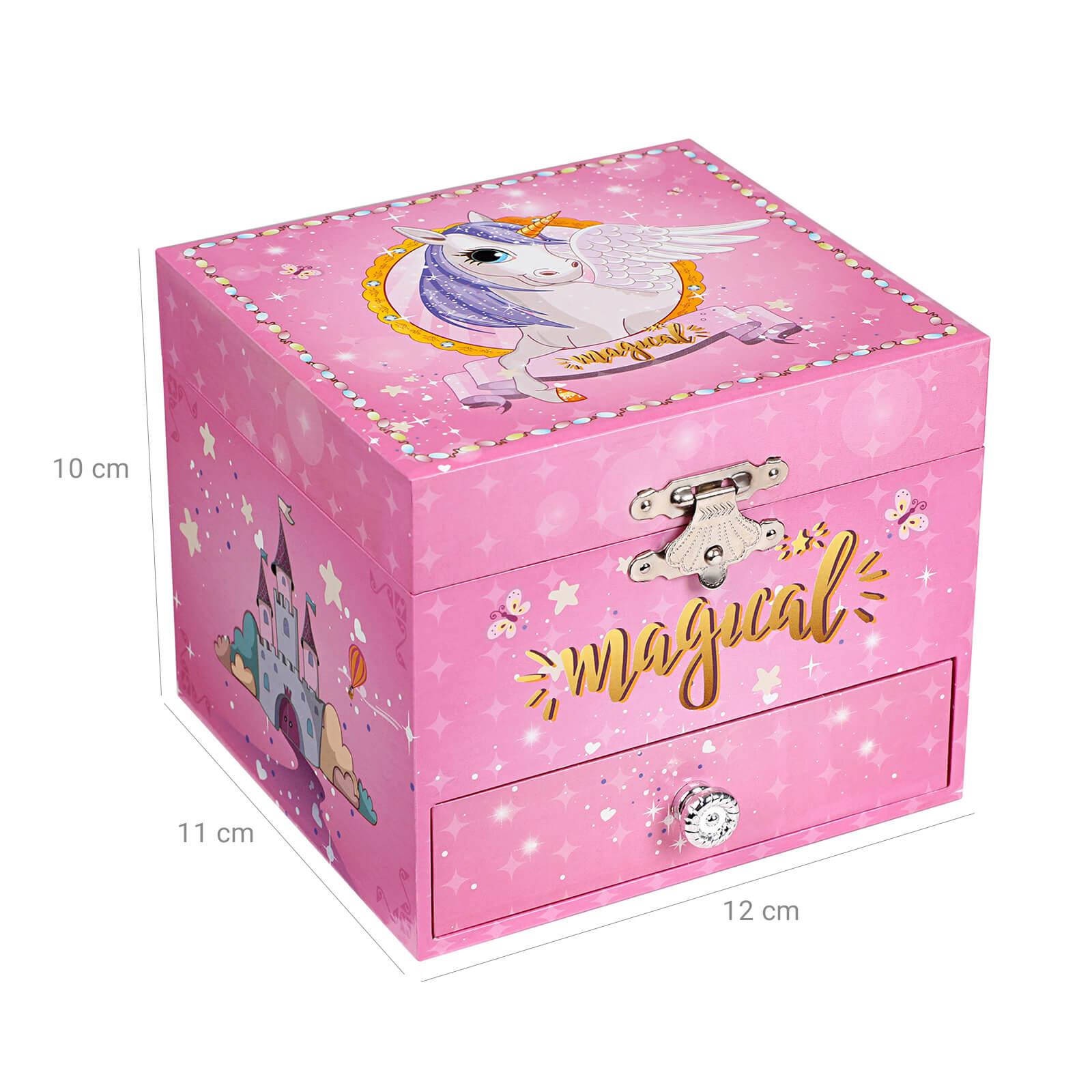 Every little girl dreams of being a princess once in her life. Our SONGMICS music box with dancing ballerina brings this dream to life. The magical unicorn on the box, the enchanted princess castle, a sky full of stars, fluttering butterflies, and last but not least, the pink color of the music box will make little girls squeal with delight. Wind up the music box with a mechanism on the back and then open it. An enchanting ballerina appears, dancing to a lovely melody. Your little princess will surely be amazed, her mouth agape. Fill the drawer and compartment with glittering hair clips, earrings, colorful rings, or other little treasures and let your little girl decide which jewelry she wants to wear today. With a smile on her face, she will stand in front of the magic mirror that reveals that she is the most beautiful in the whole land! In addition, your daughter or granddaughter will learn that her jewelry can be neatly stored in the little box. This will help her develop a sense of order and save you valuable energy. Give your little one this music box during her birthday party and she will dance joyfully to the melody of the “Flower Waltz” together with the ballerina and her friends. Product details: -Color: Pink -Material: MDF (medium-density fiberboard), decorative paper, velvet, ABS mirror -Size: 11.9 x 10.9 x 9.9 cm (W x D x H) -Weight: 259 g Scope of delivery: – 1 x SONGMICS music box Notes: 1. Do not expose the product to direct sunlight. 2. Keep the product away from sharp objects to avoid damage. 3. Please note that small parts such as the ballerina pose a choking hazard.