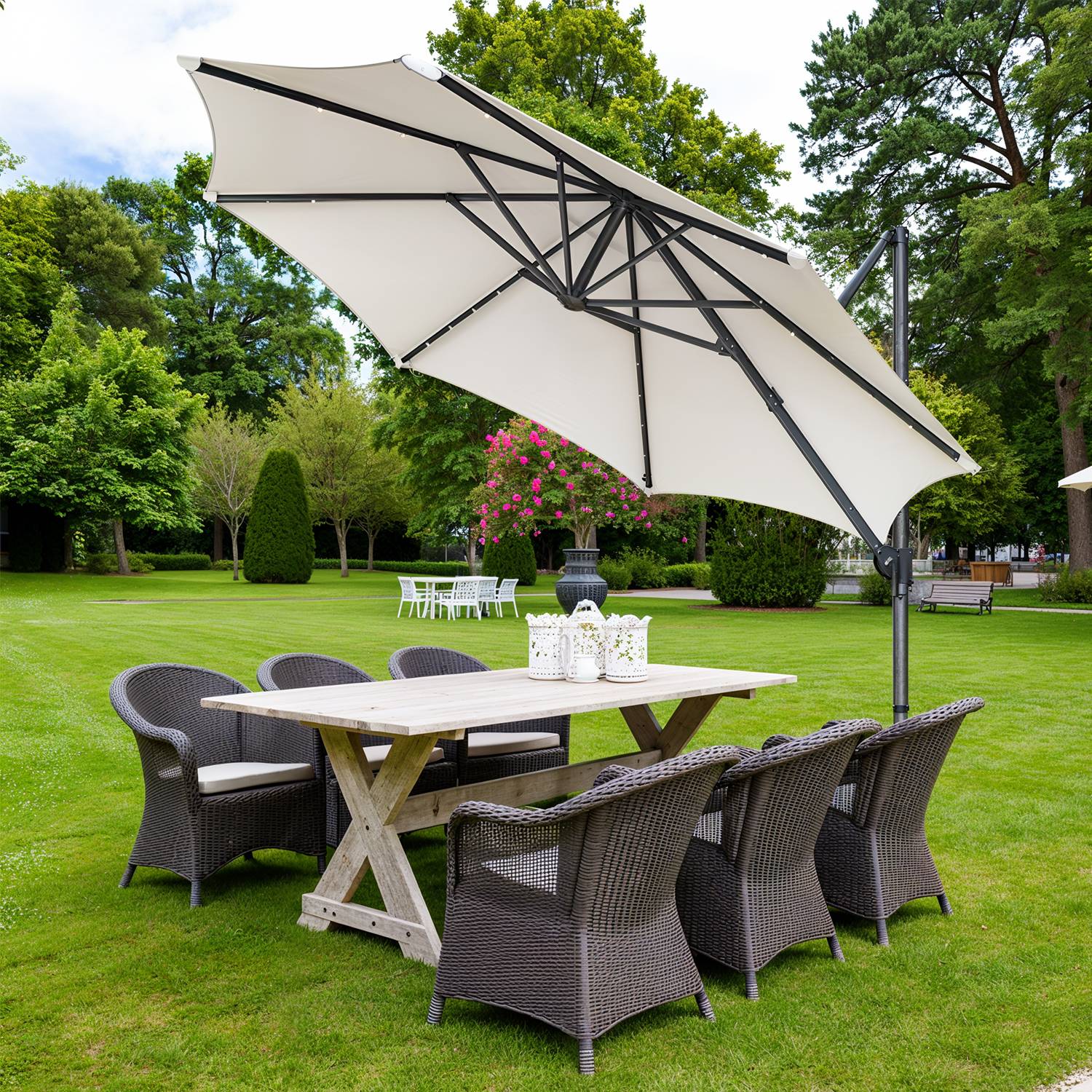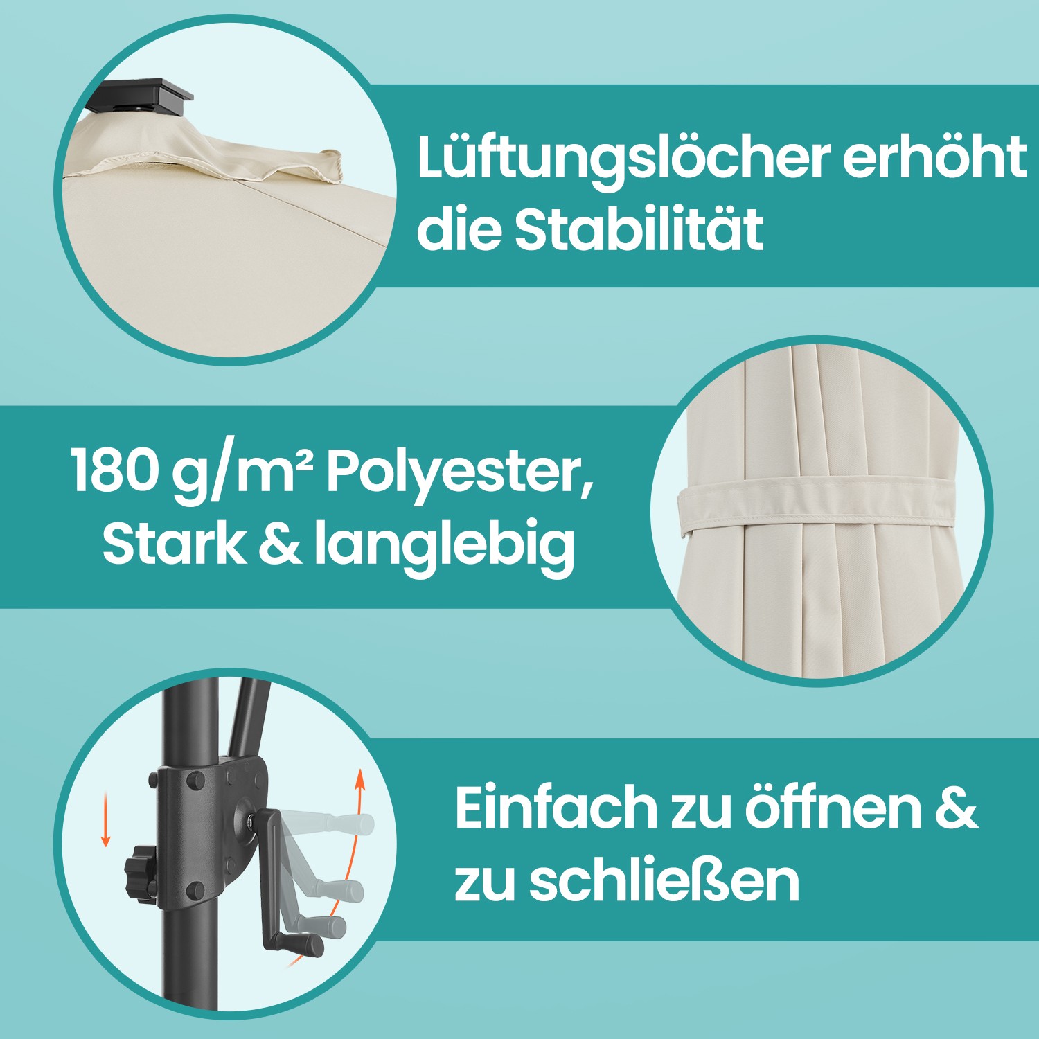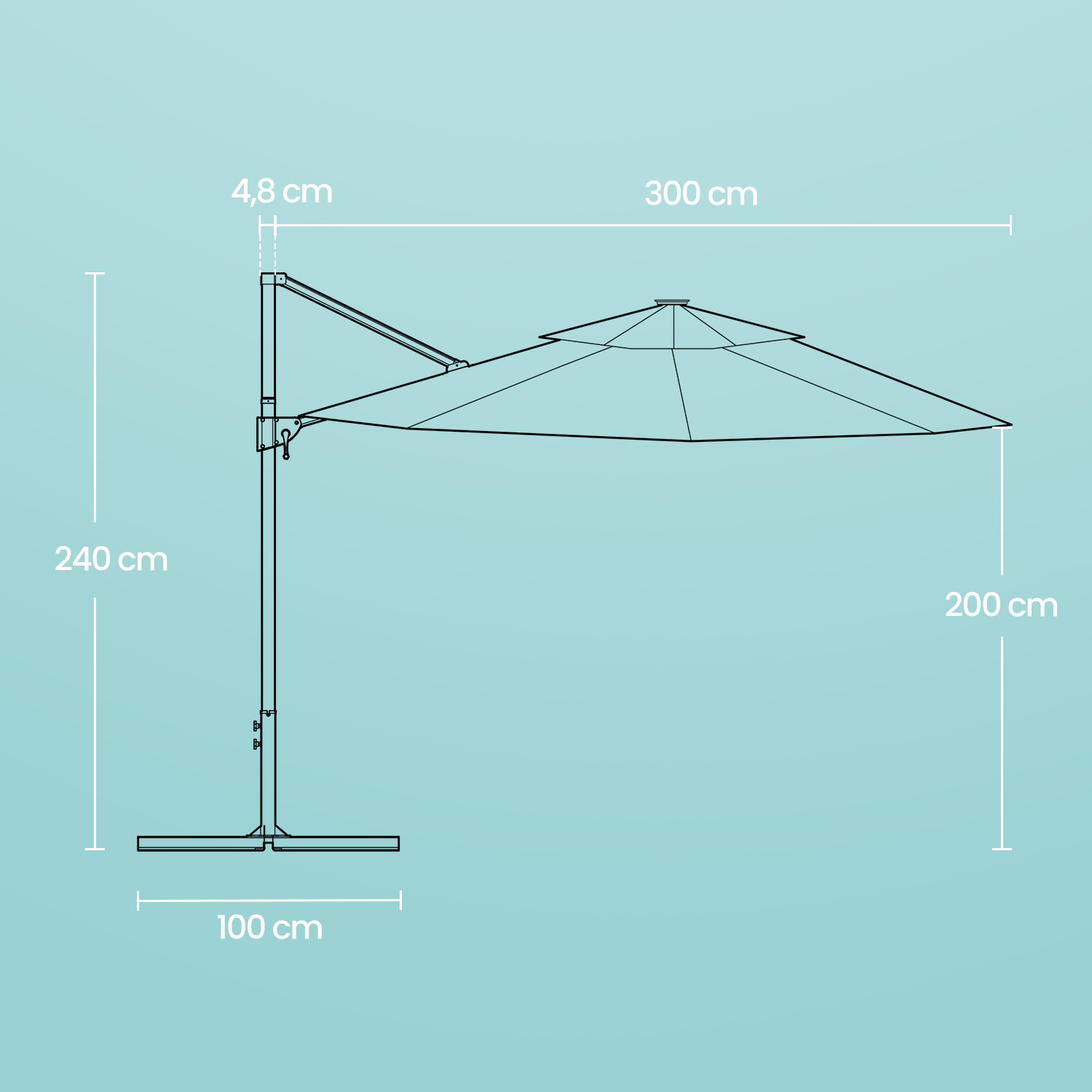 Parasol, cantilever parasol, 300 cm, 28 solar LED lights, UPF 50+, garden parasol, 360° rotatable, adjustable tilt angle, cross base, dove gray