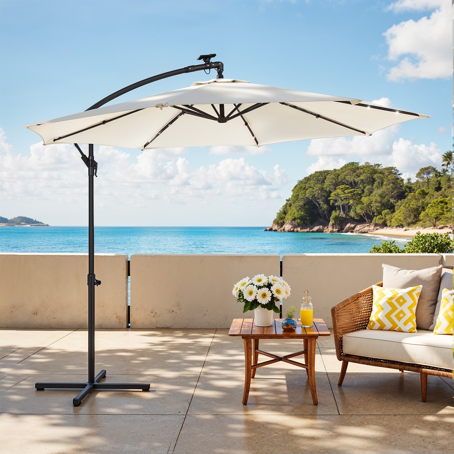 – To use the LED lighting, connect the plug hidden in the upper part of the umbrella to the solar panel and expose it to direct sunlight for 8 hours to charge. After use, turn off the lighting with the switch.