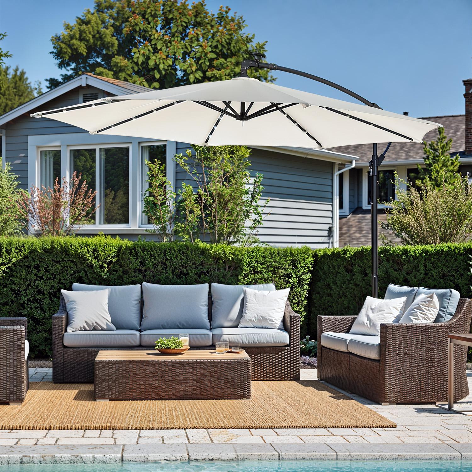 Parasol with LED solar lighting, cantilever parasol 300 cm diameter, 32 LED lights, with stand, UPF 50+, with crank, taupe