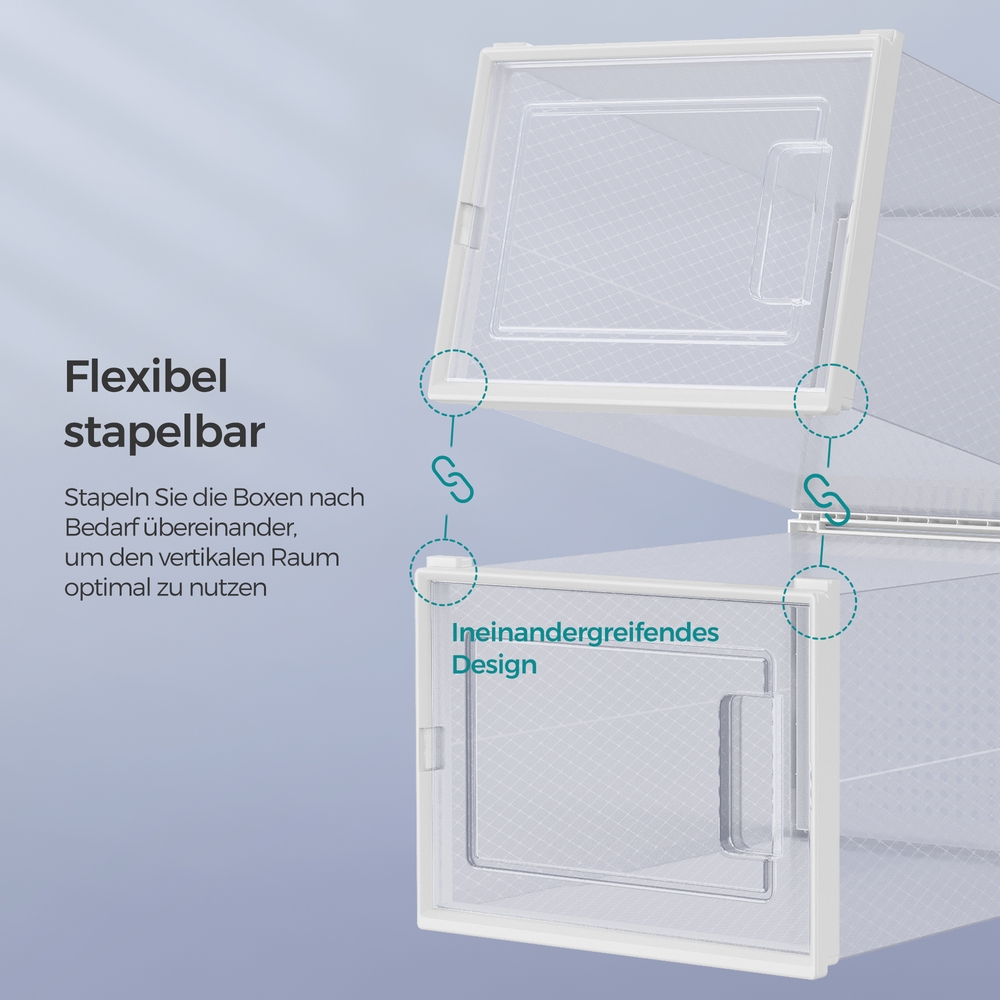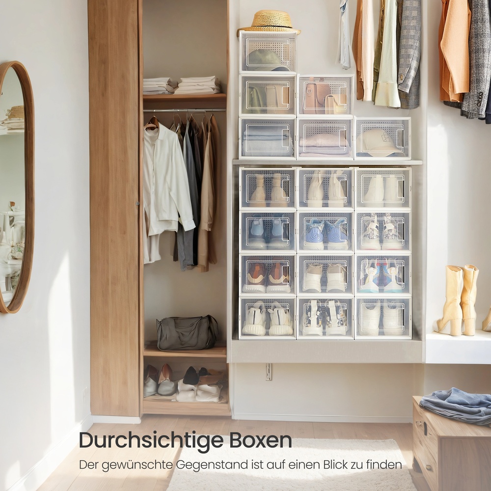 Product details: Color: Transparent body, white Material: Body made of PP (polypropylene), door made of PS (polystyrene) Size per box: 35 x 25 x 18.5 cm (L x W x H) Interior size per box: 31 x 24.5 x 17.5 cm (L x W x H) Weight: 7.7 kg Scope of delivery: 18 x shoe box 1 x instructions (DE, EN, FR, ES, IT) SONGMICS notes: Follow the assembly steps in the instructions and in the video to assemble the product. Please do not use force to disassemble it. Please measure your shoes before purchasing and check that they fit in these shoe boxes.